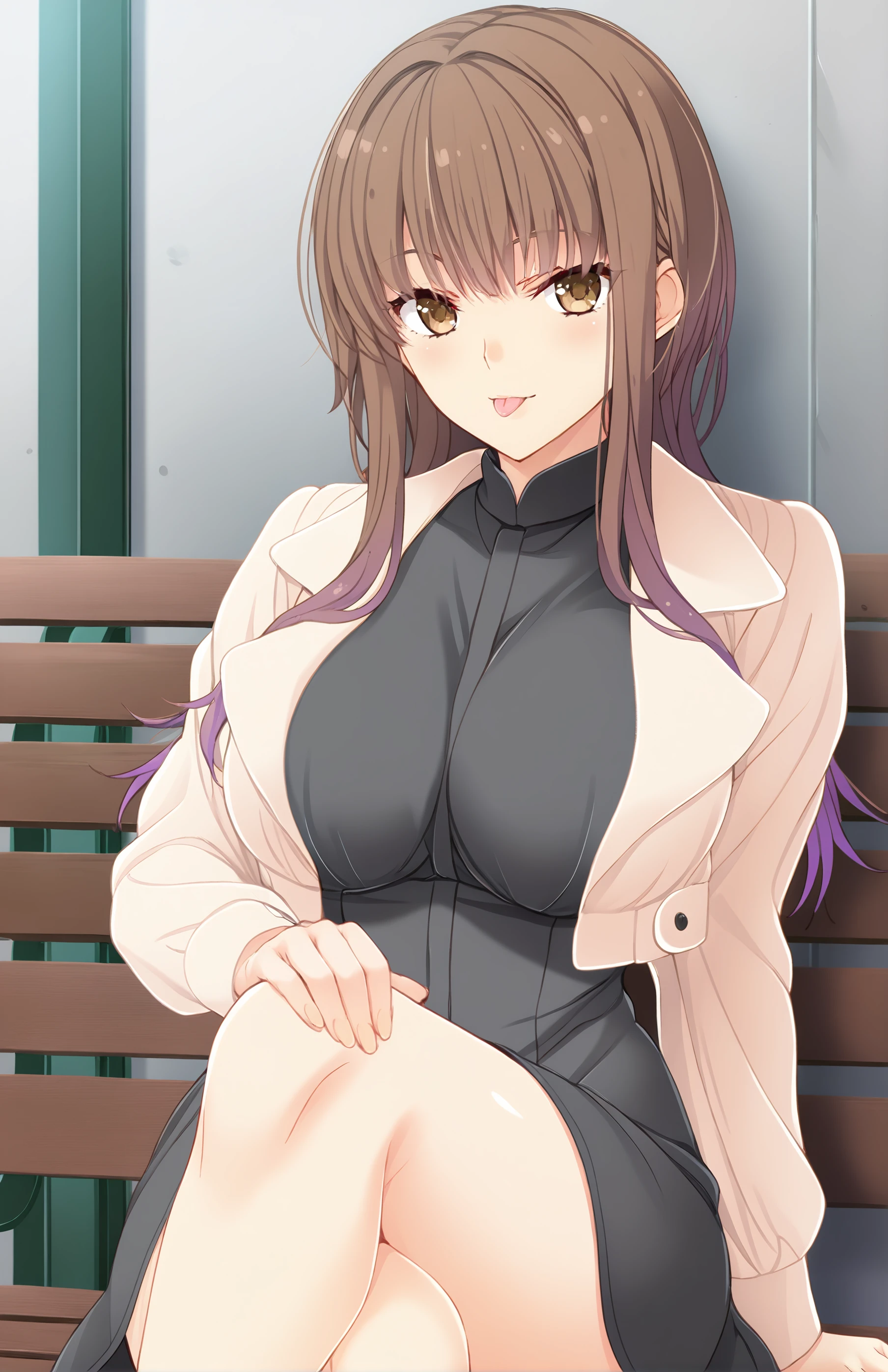 TakanezawaHonami, long hair, breasts, bangs, large breasts, brown hair, long sleeves, dress, brown eyes, , black dress, crop coat, beige coat