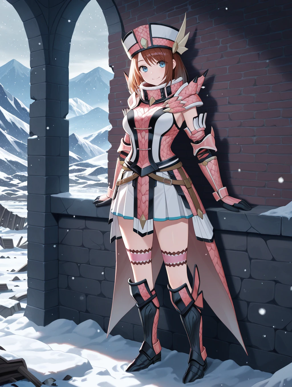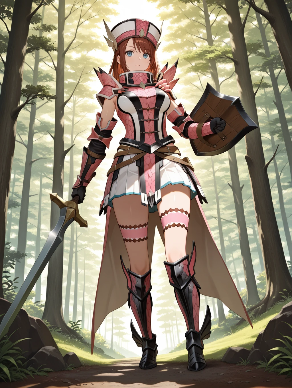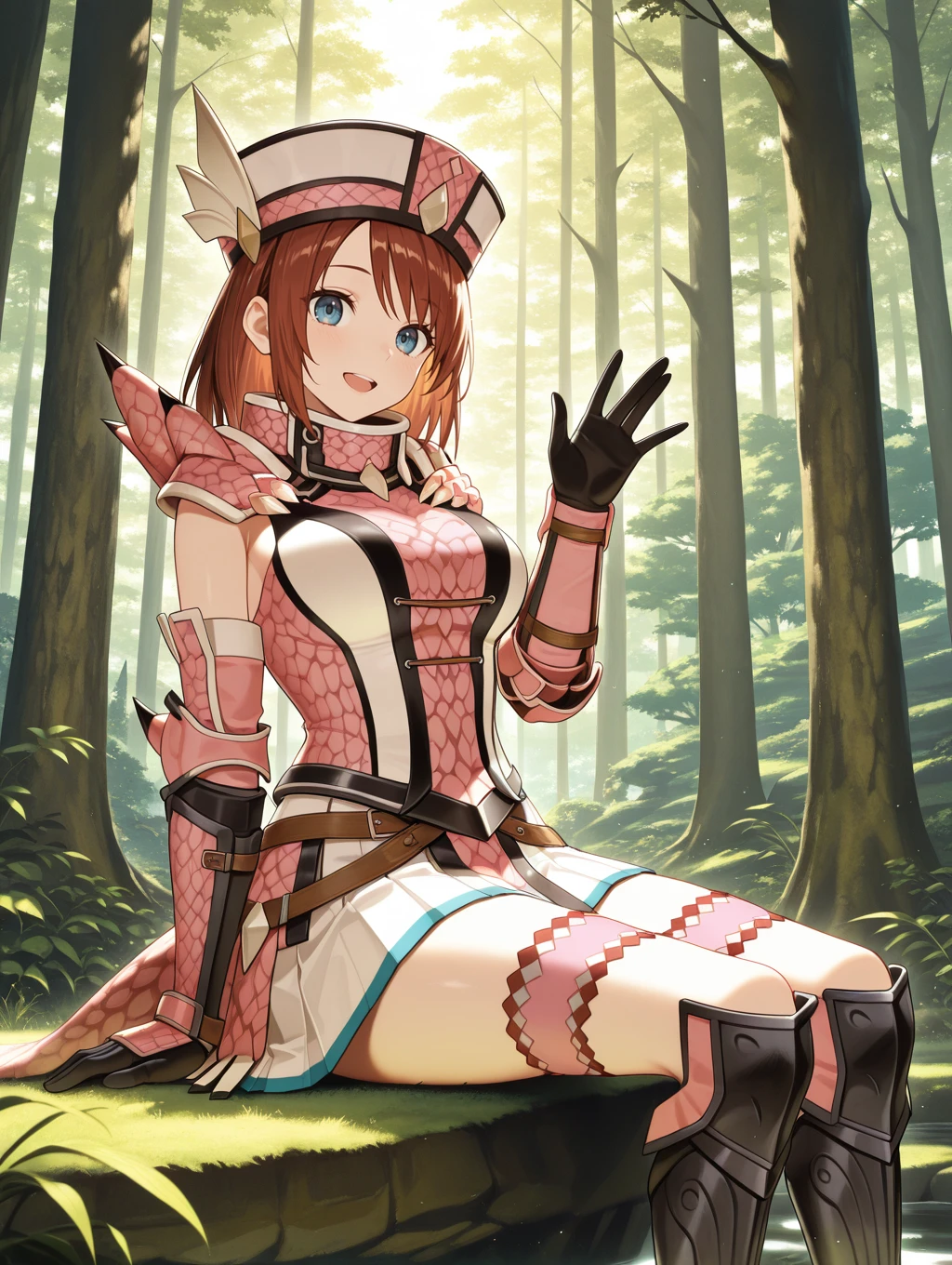 Tags (clothes): pink rathian armor, pink hat, pink shoulder armor, pink breastplate, pink armored gloves, pink armored dress, brown belt, pelvic curtain, white pleated skirt, pink thighlet, silver armored boots