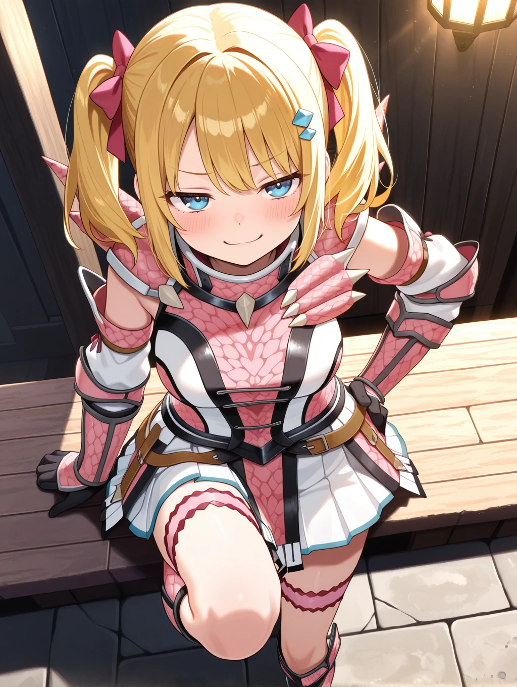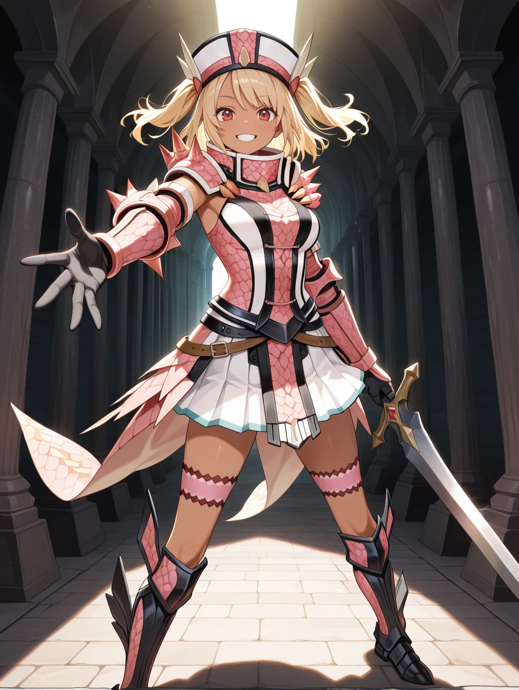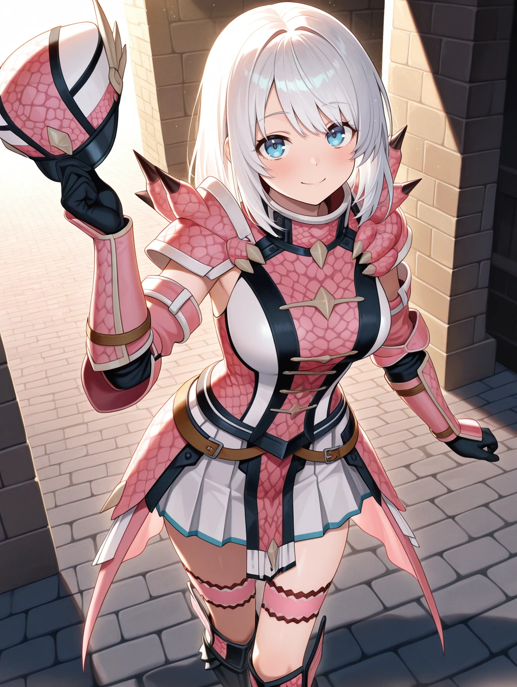 Tags (clothes): pink rathian armor, pink hat, pink shoulder armor, pink breastplate, pink armored gloves, pink armored dress, brown belt, pelvic curtain, white pleated skirt, pink thighlet, silver armored boots
