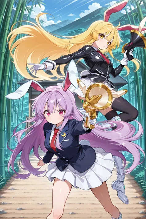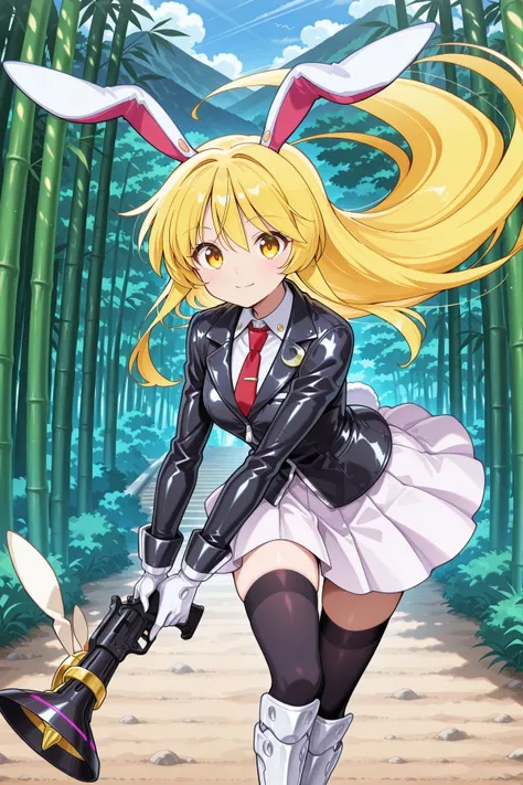reisen udongein inaba, 1girl, solo, blonde hair, yellow eyes, rabbit ears, long hair, skinny, medium breasts,alternate eye color, alternate hair color, blazer, black blazer, gloves, long sleeves, lunatic gun, necktie, rabbit tail, red necktie, shirt, white gloves, white shirt, white skirt, Description