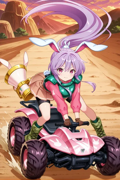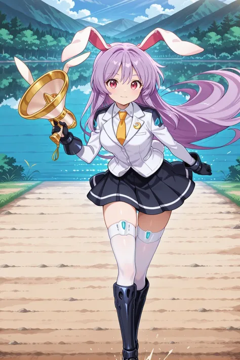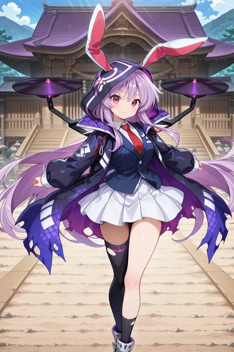 reisen udongein inaba, 1girl, solo, purple hair, purple eyes, rabbit ears, long hair, skinny, medium breasts, white shirt, pink skirt, blazer, red necktie, Alternative :