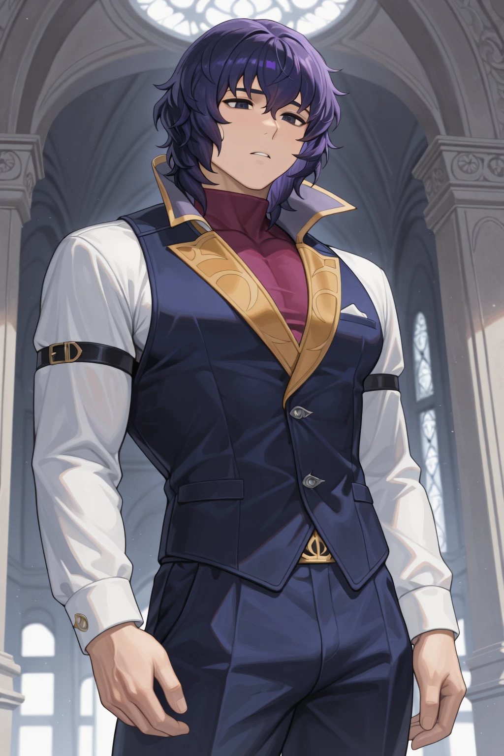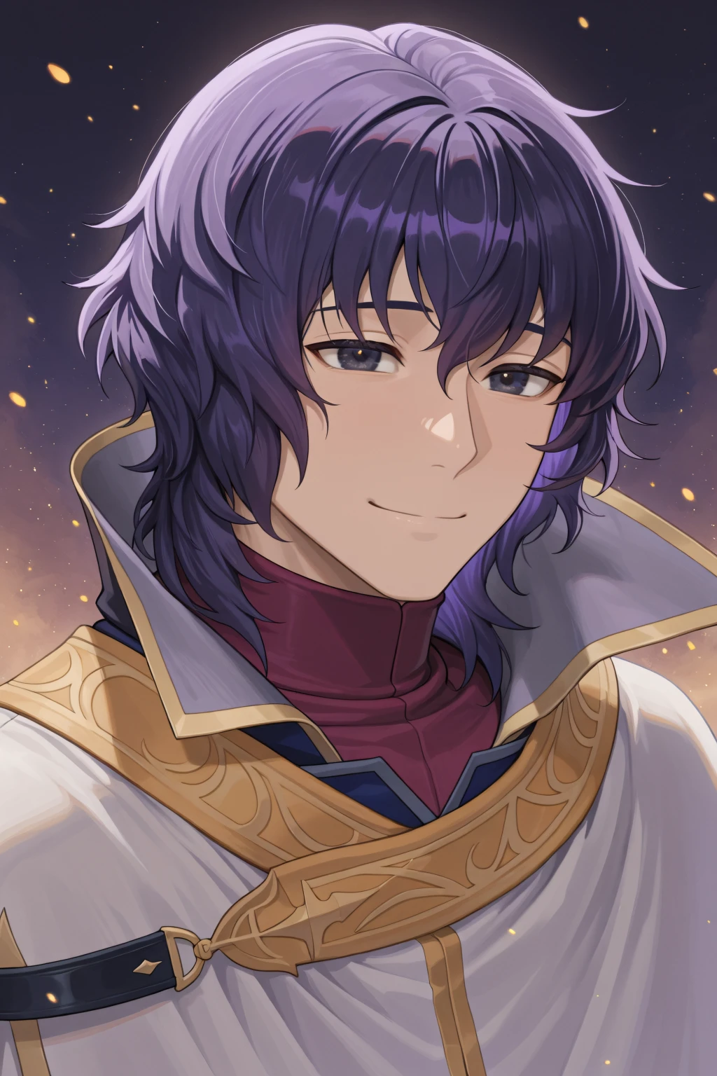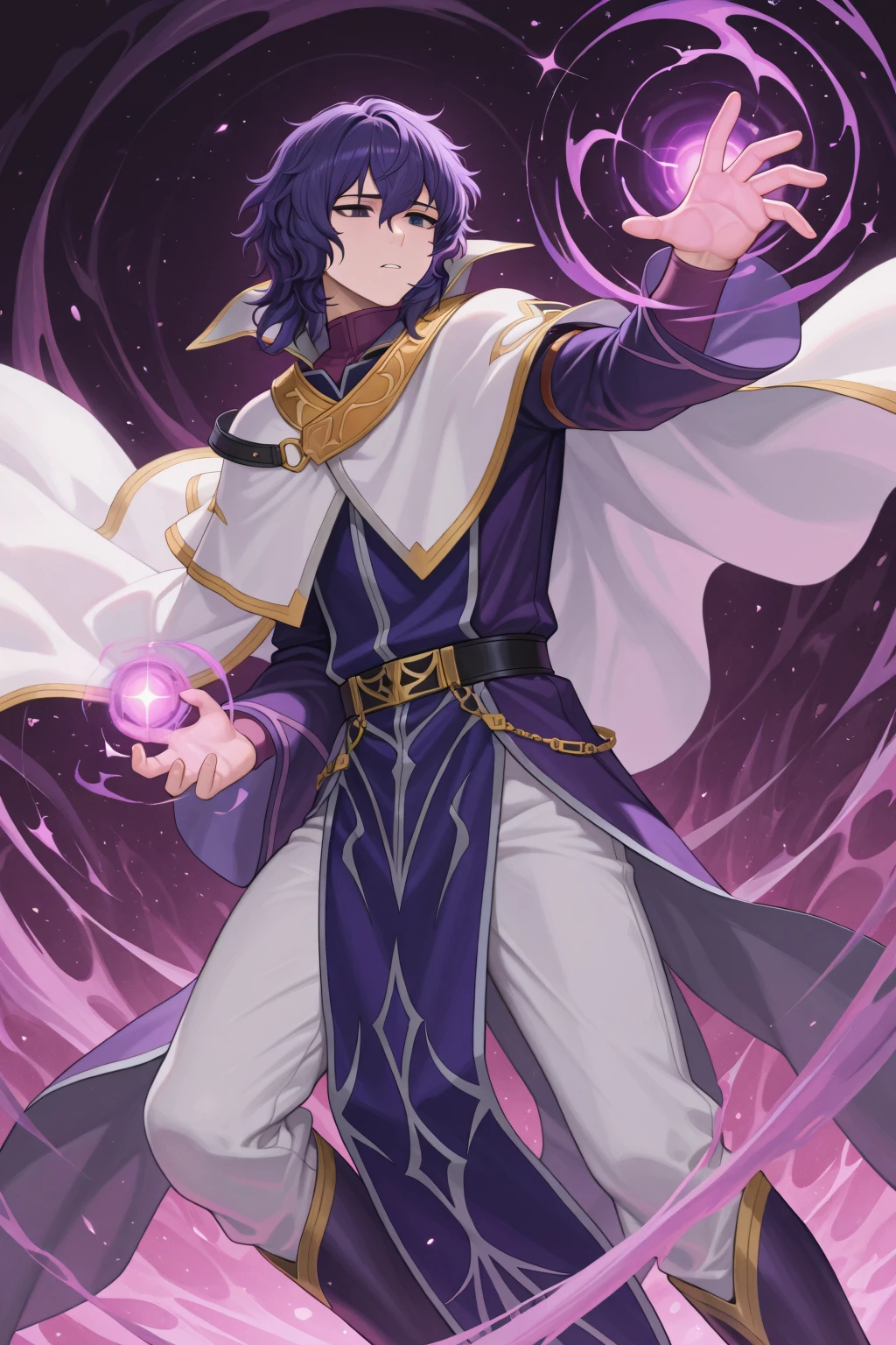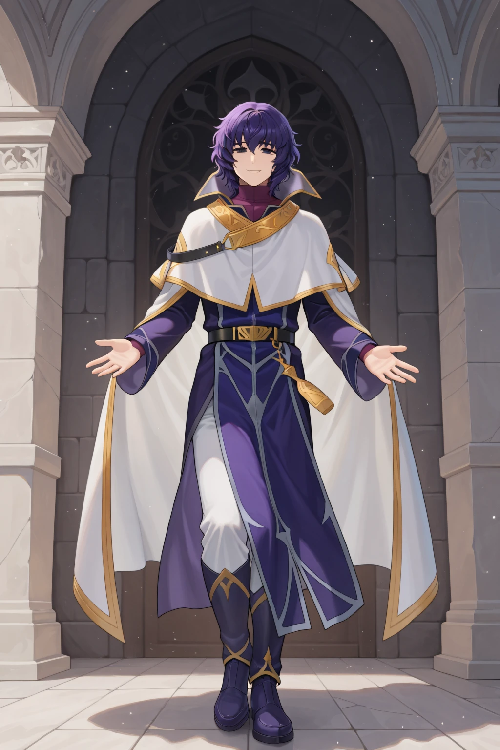 mage, white cape, white and gold cape, high collar, large collar, purple robe, purple sleeves, white pants, purple boots