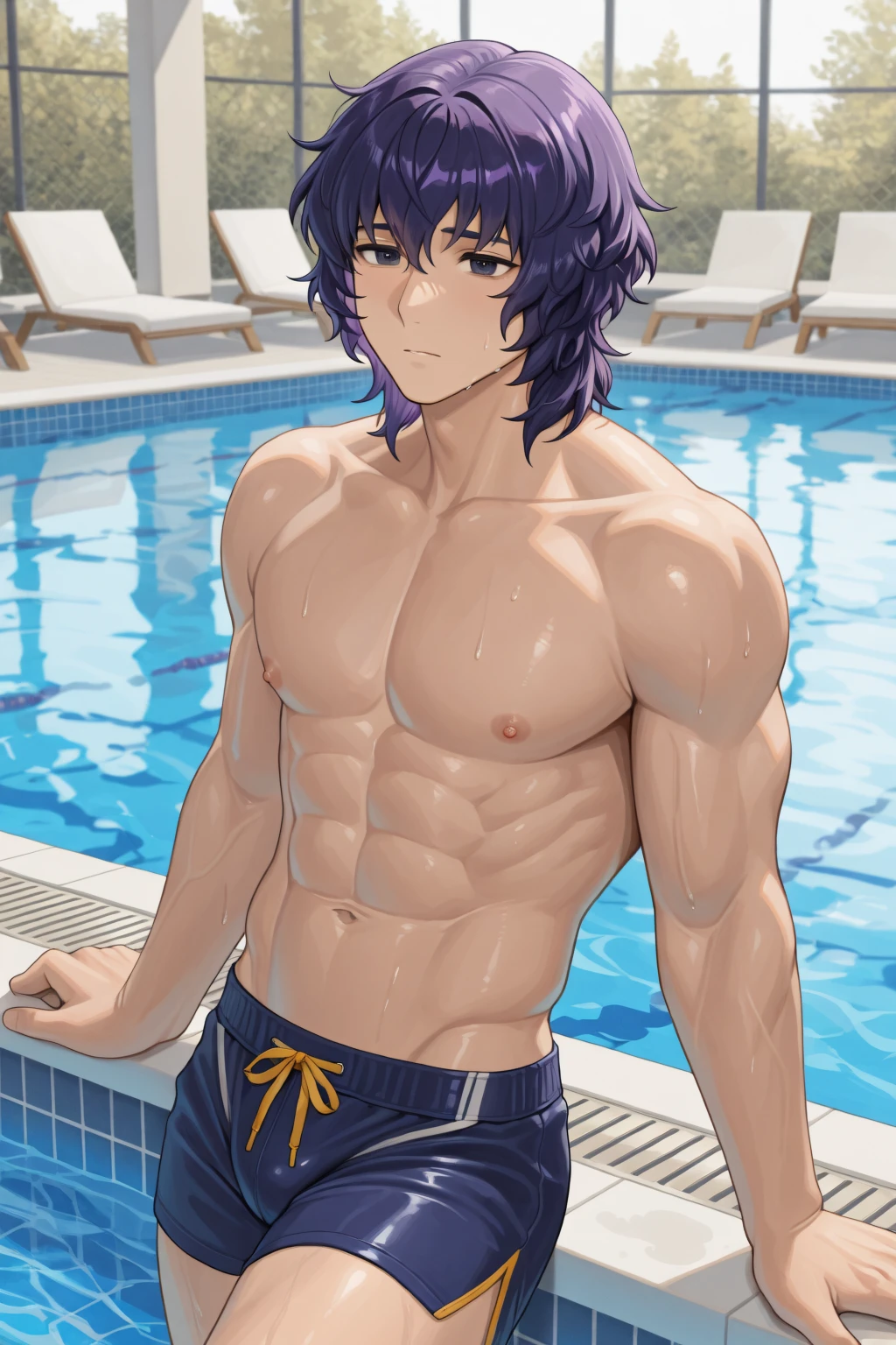 purple hair, medium hair, dark eyes,