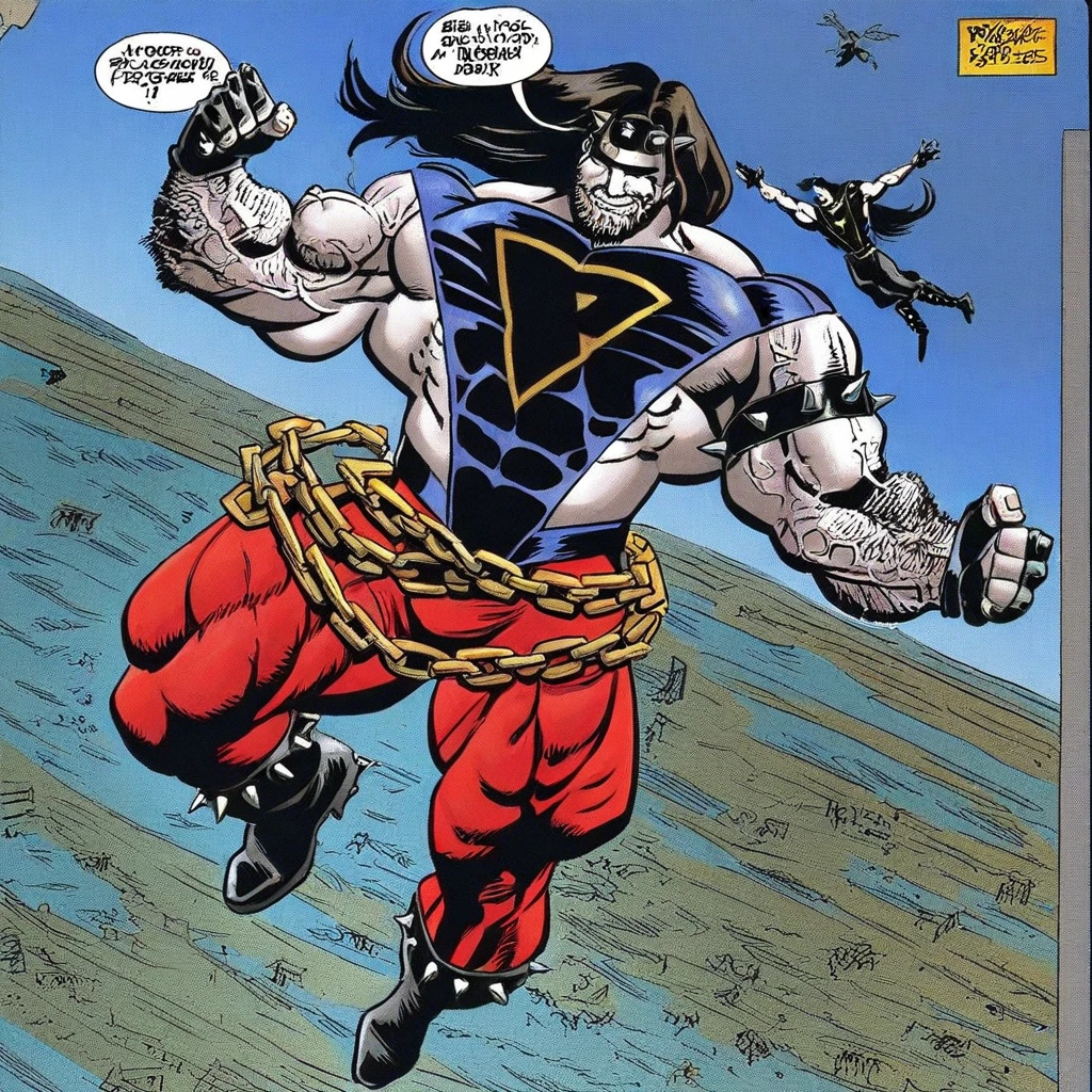 muscular_body, fingerless gloves, facial hair, spiked_armband, veins, spiked_headband, long hair, manly, hairy, black_bodysuit, sleeveless, red_pants, chain_belt, boots