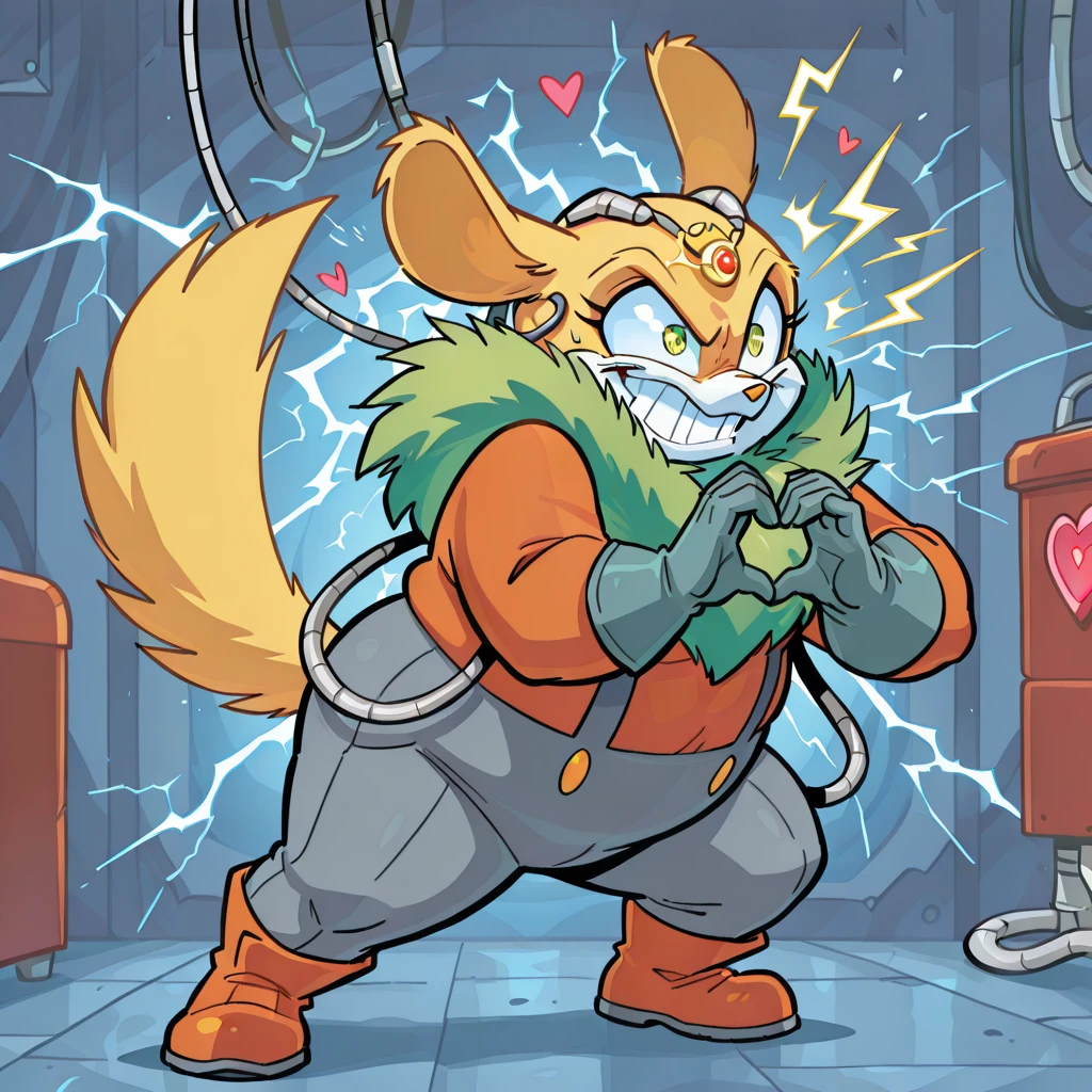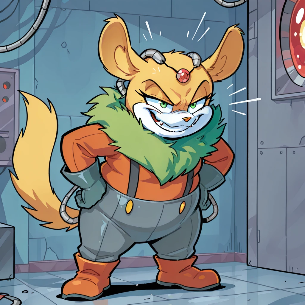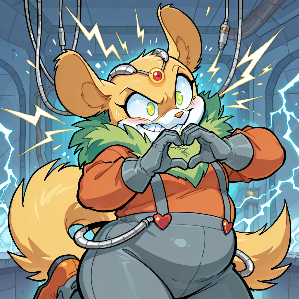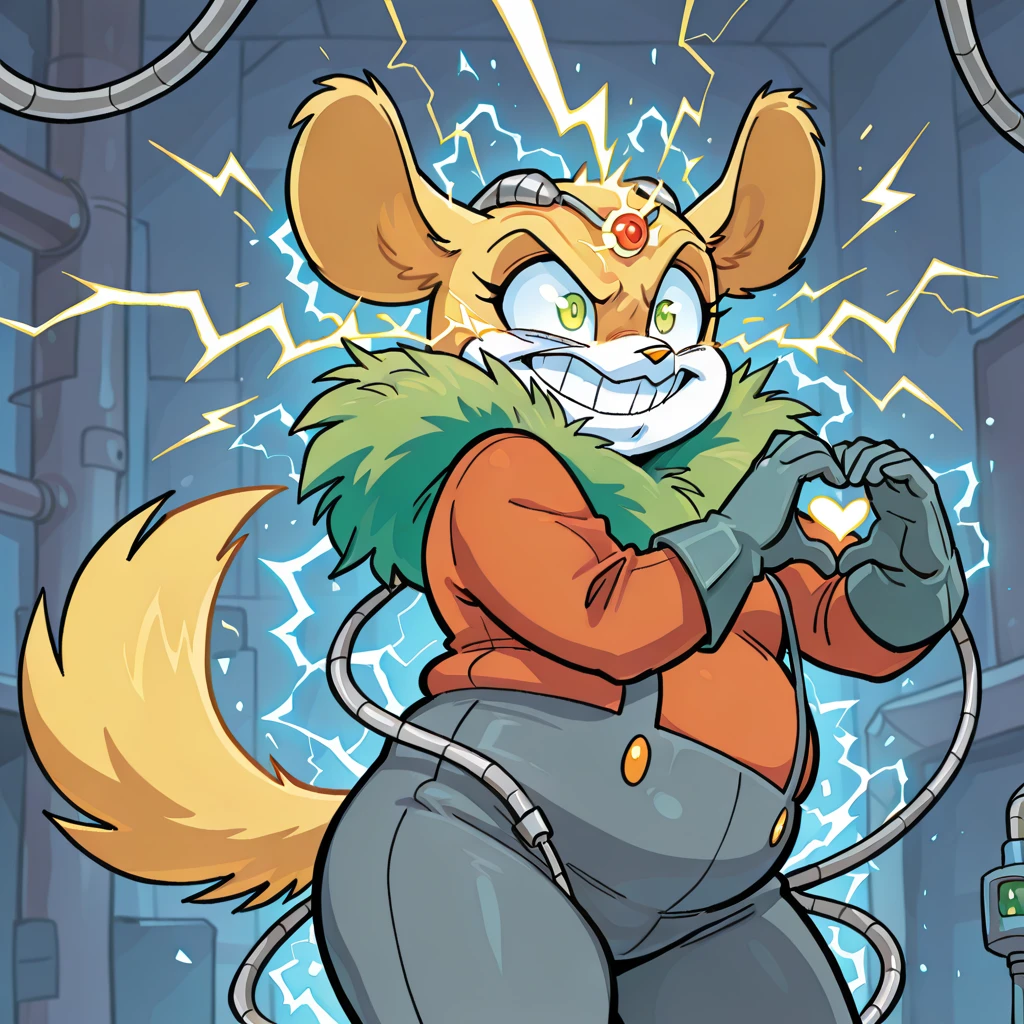 chinchilla female, solo, chubby, yellow fur, yellow fur with white mouth, large green neck fur, fluffy green neck fur, green eyes, yellow tail, yellow fluffy tail, forehead gem, head wires, wire headpiece, long sleeve orange shirt, gray pants with suspenders, gray gloves, orange shoes, wires connected to hands, small pink nose,