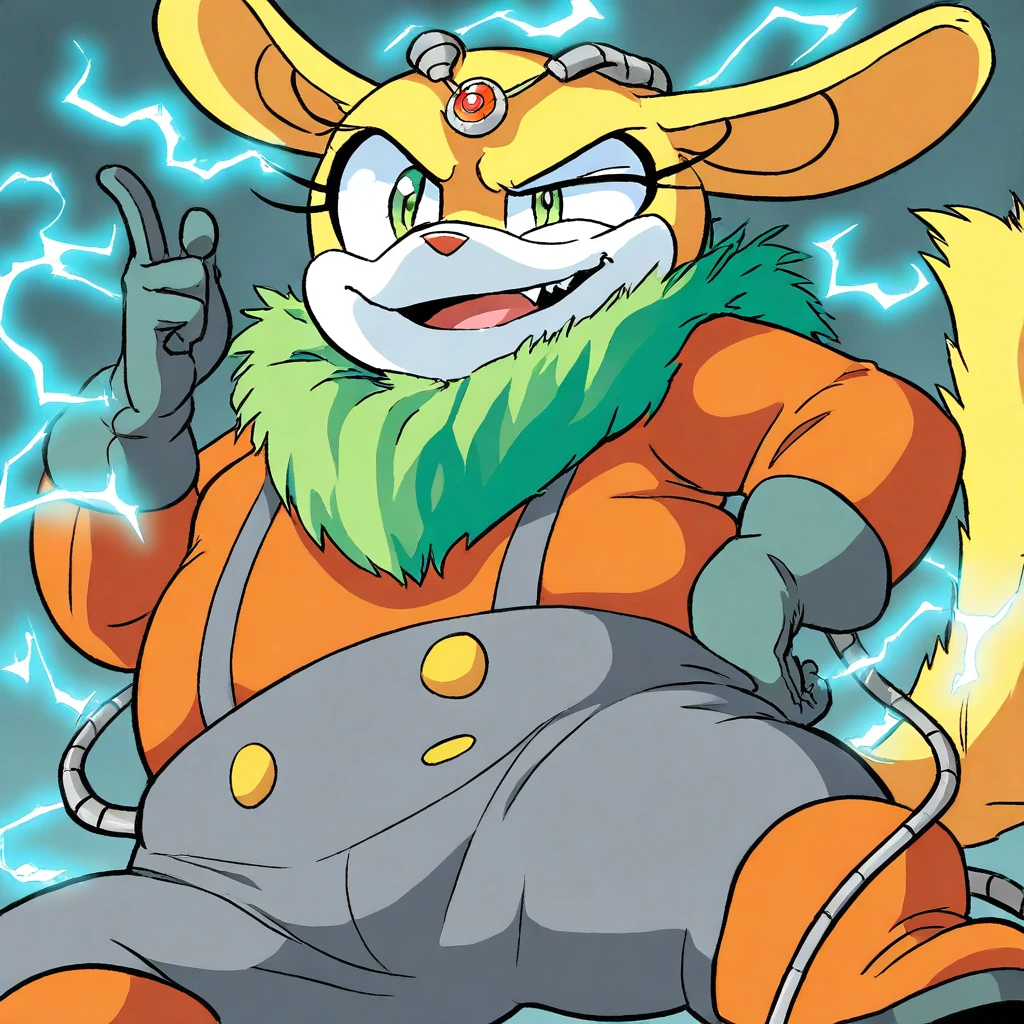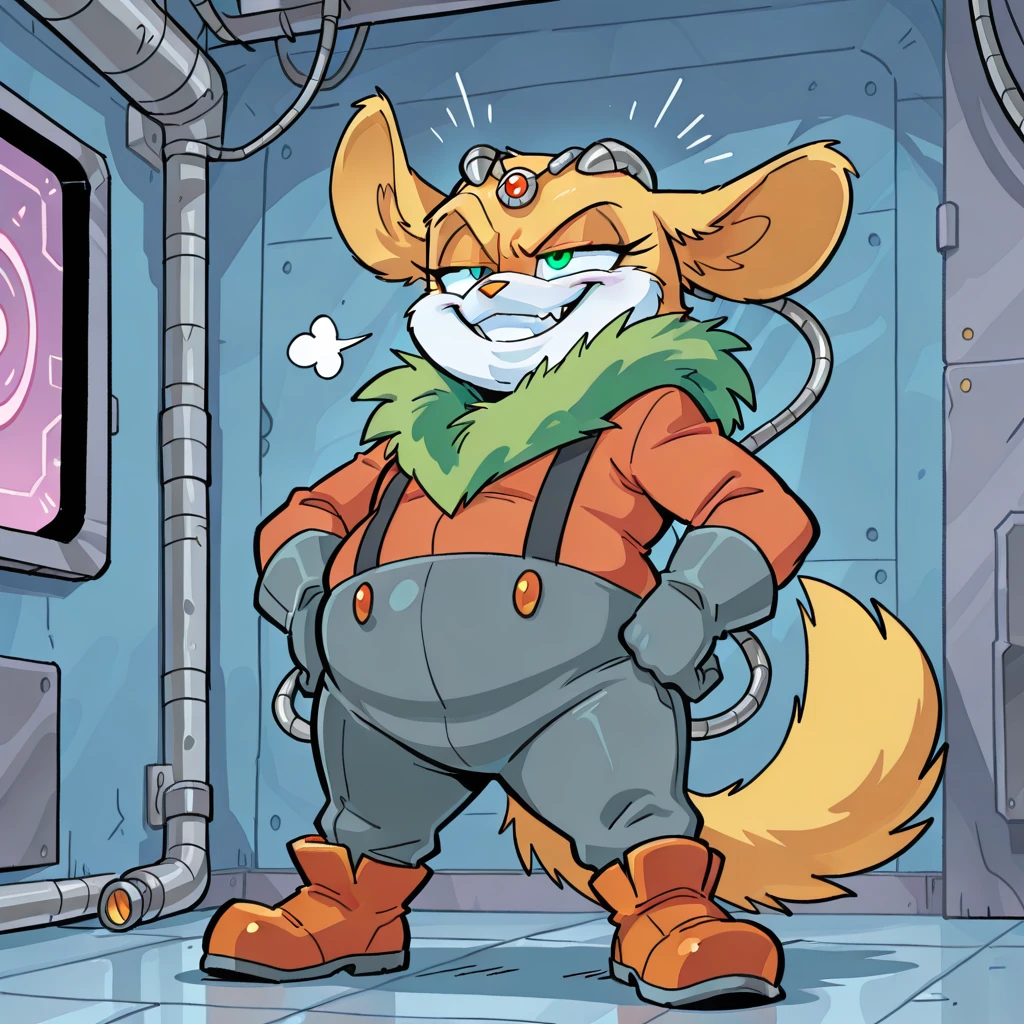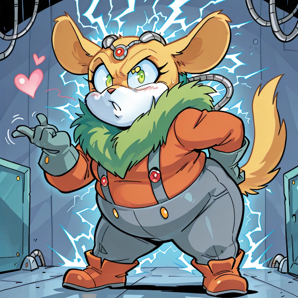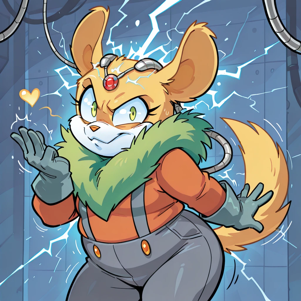 chinchilla female, solo, chubby, yellow fur, yellow fur with white mouth, large green neck fur, fluffy green neck fur, green eyes, yellow tail, yellow fluffy tail, forehead gem, head wires, wire headpiece, long sleeve orange shirt, gray pants with suspenders, gray gloves, orange shoes, wires connected to hands, small pink nose,