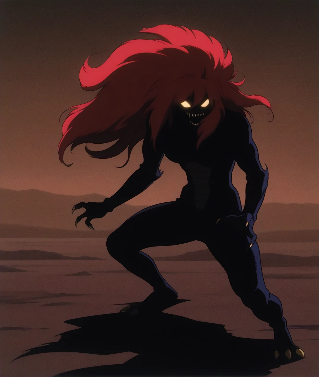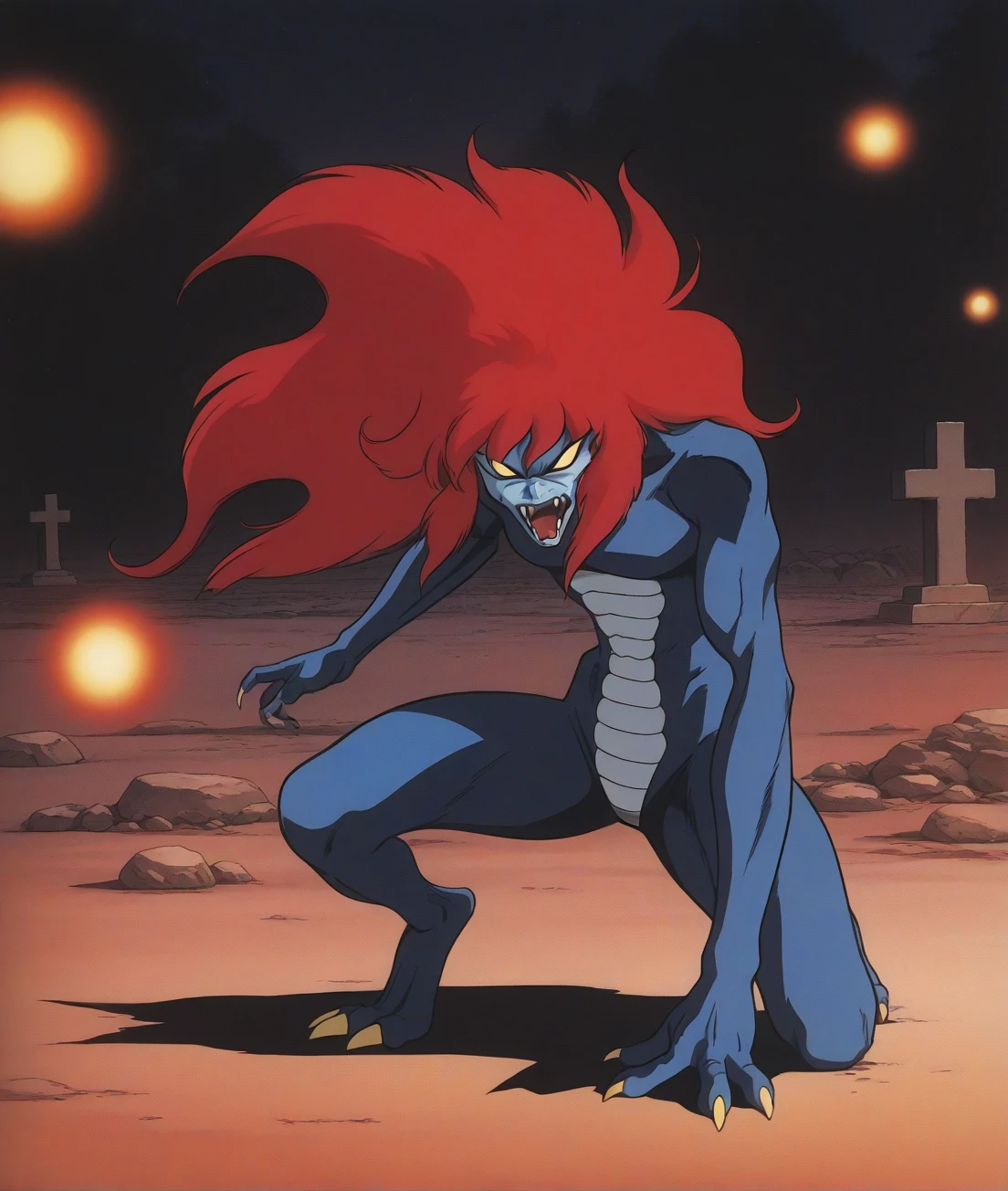 beraB, monster, red hair, colored skin, outdoor,slouching,retro artstyle,cemetery,3fingers hand,blue skin,no humans,