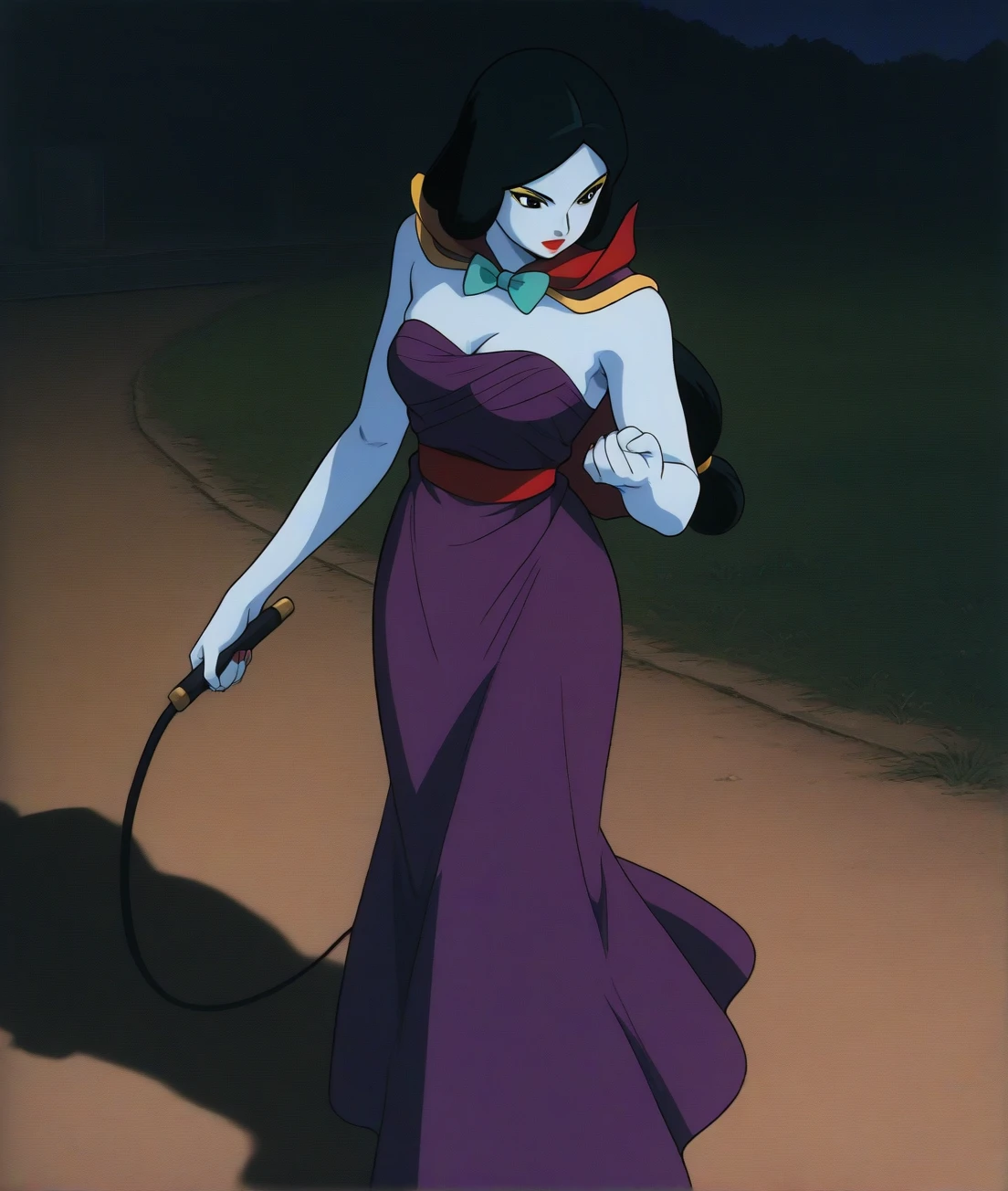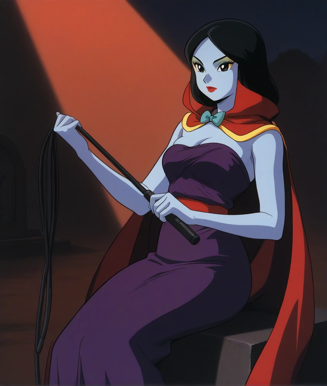 beraA, female, black hair, black eyes, makeup, colored skin, strapless dress, long red cloak, outdoor,slouching,retro artstyle,