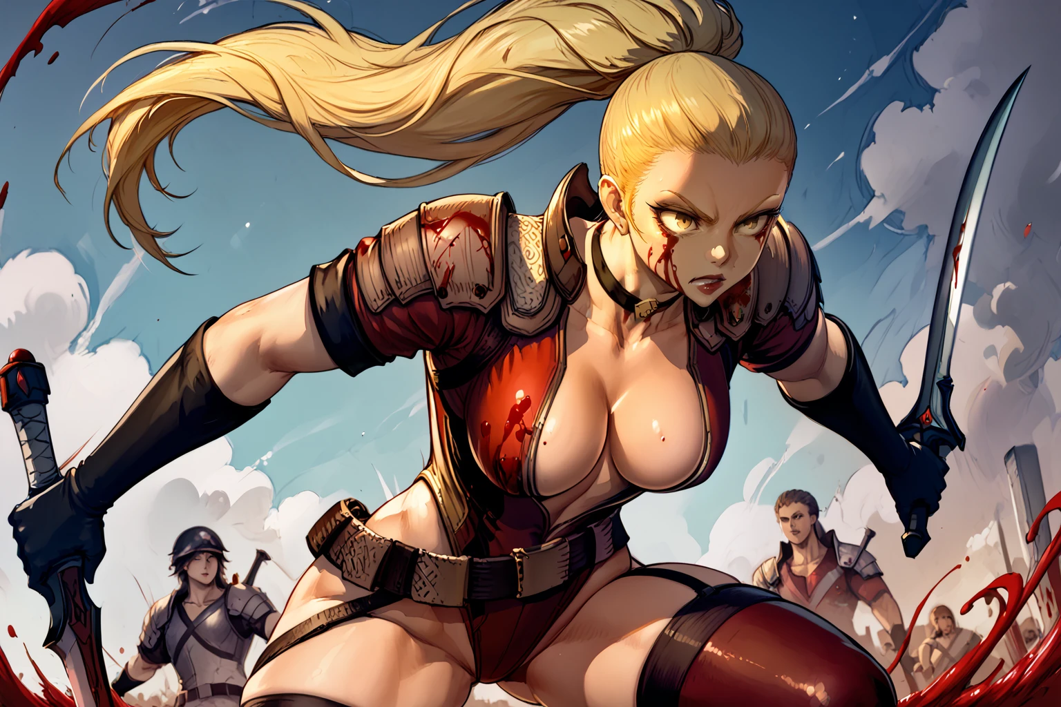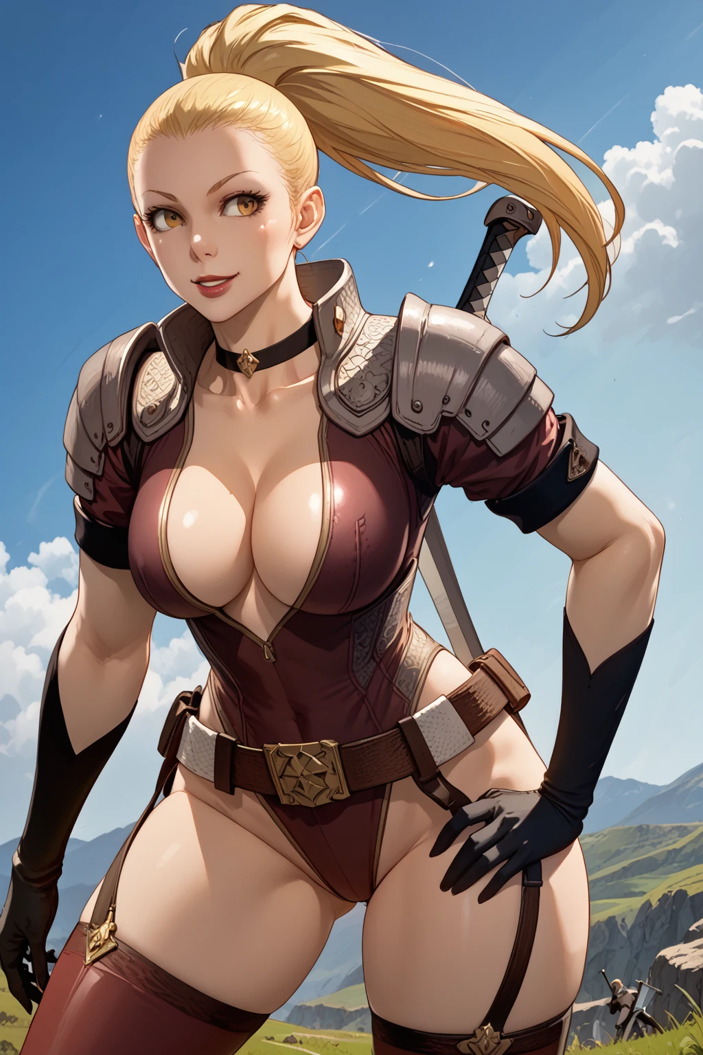 • Trigger : 1girl, blonde hair, long hair, shoulder armor, ponytail, leotard, cleavage, sword, gloves, belt, choker, thighhighs, boots