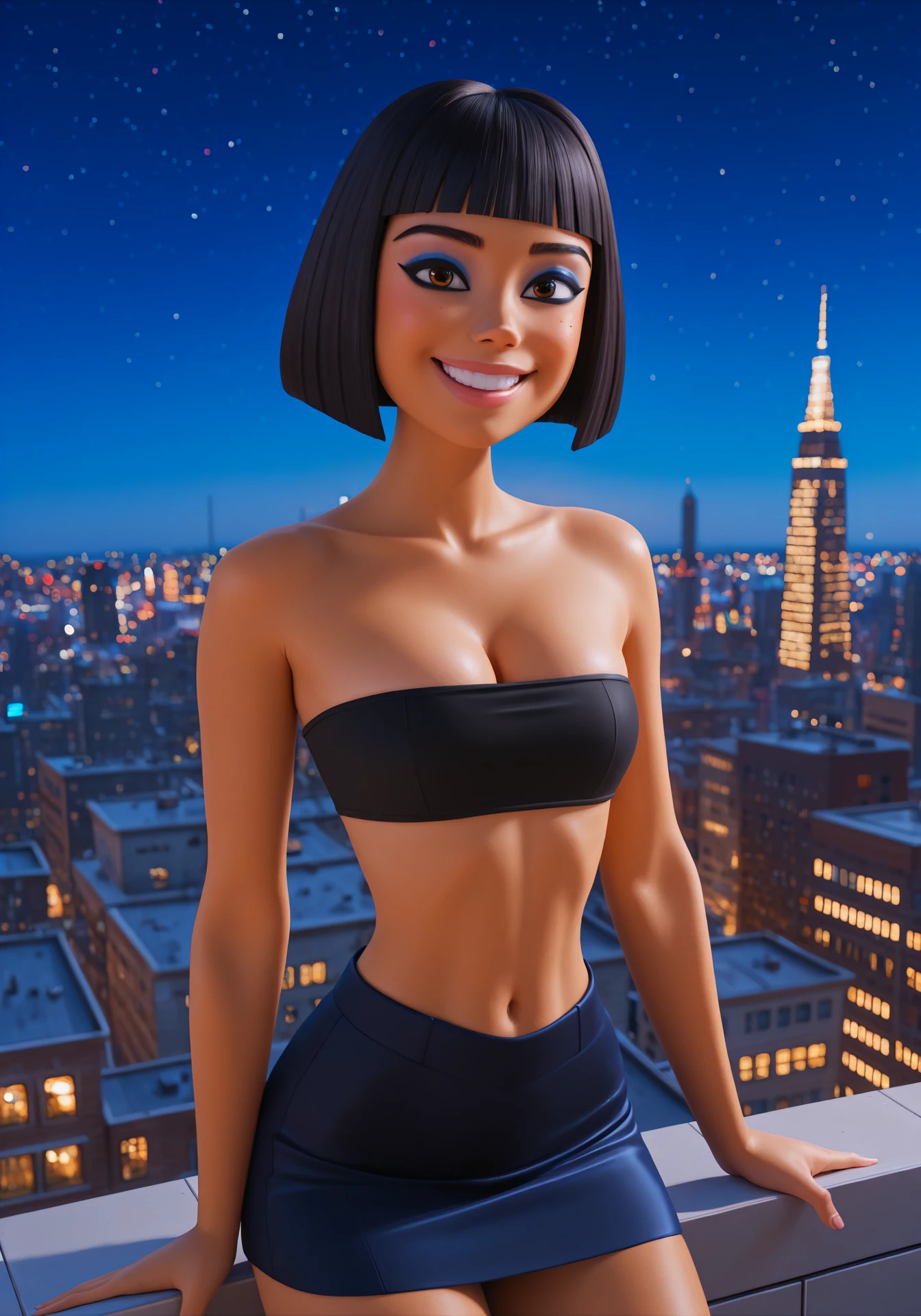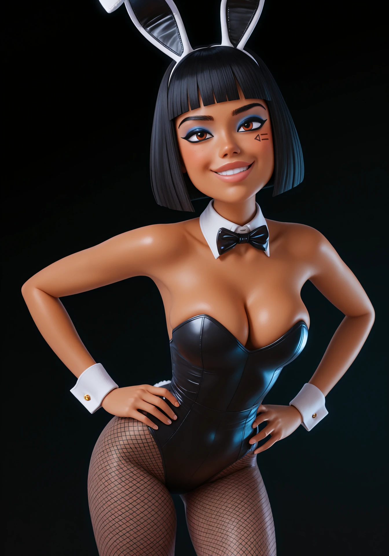 black hair, short hair, bob cut, blunt bangs, dark-skinned female, brown eyes, lips, face tattoo, black eyeliner, makeup