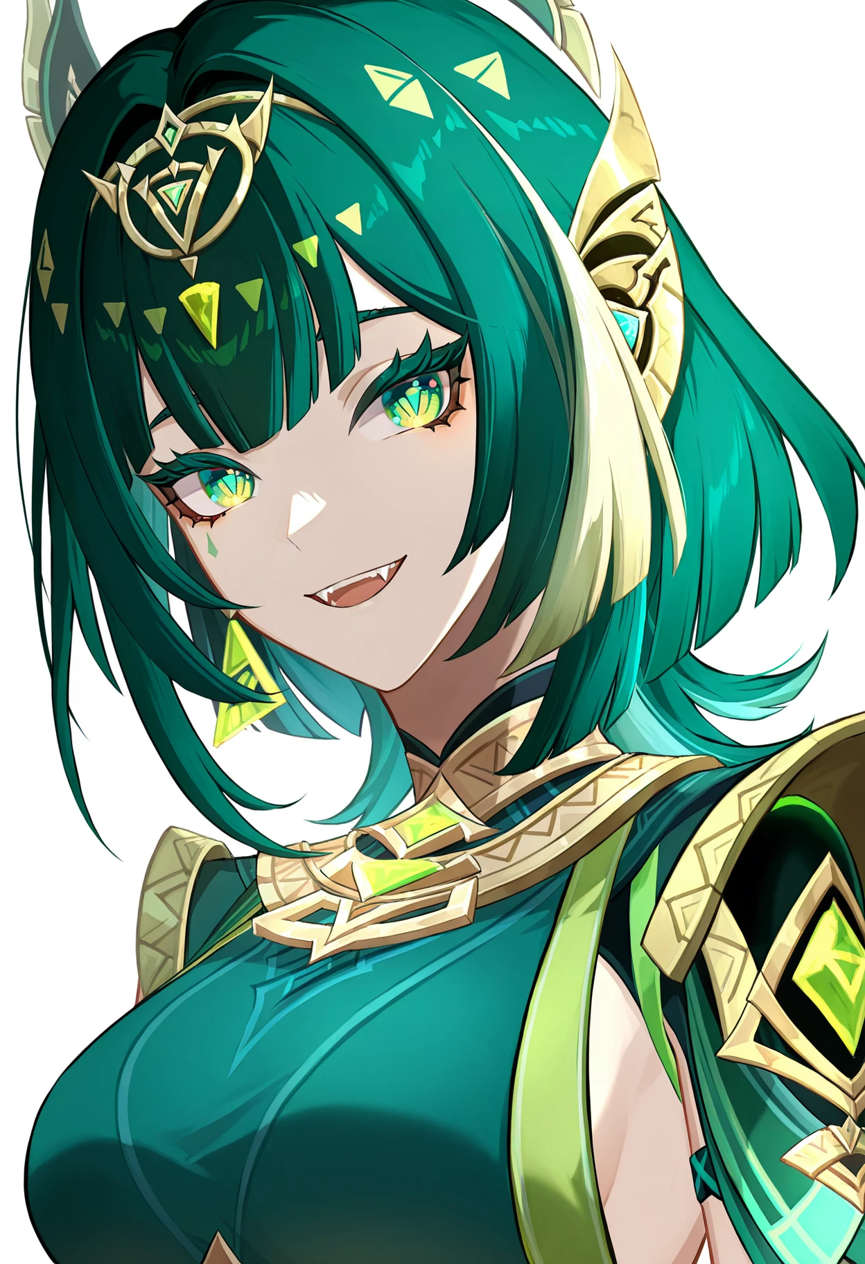 fangs,hair ornament,green hair,green eyes,Clothes(服装):