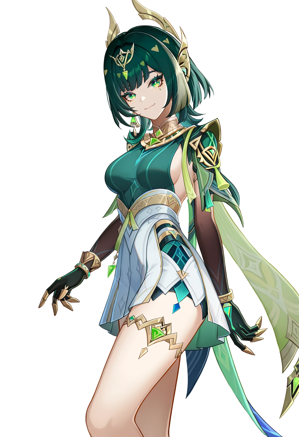dress,jewelry,white skirt,green clothes,black gloves,---------------------->