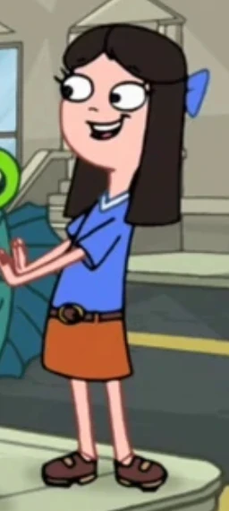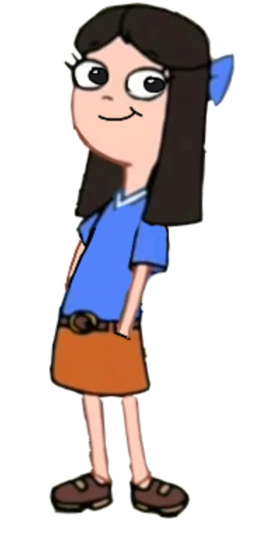 cindy, 1girl, solo, long hair, smile, skirt, simple background, shirt, black hair, white background, bow, closed mouth, standing, full body, short sleeves, hair bow, shoes, belt, black eyes, blue bow, brown footwear, blue shirt, brown skirt