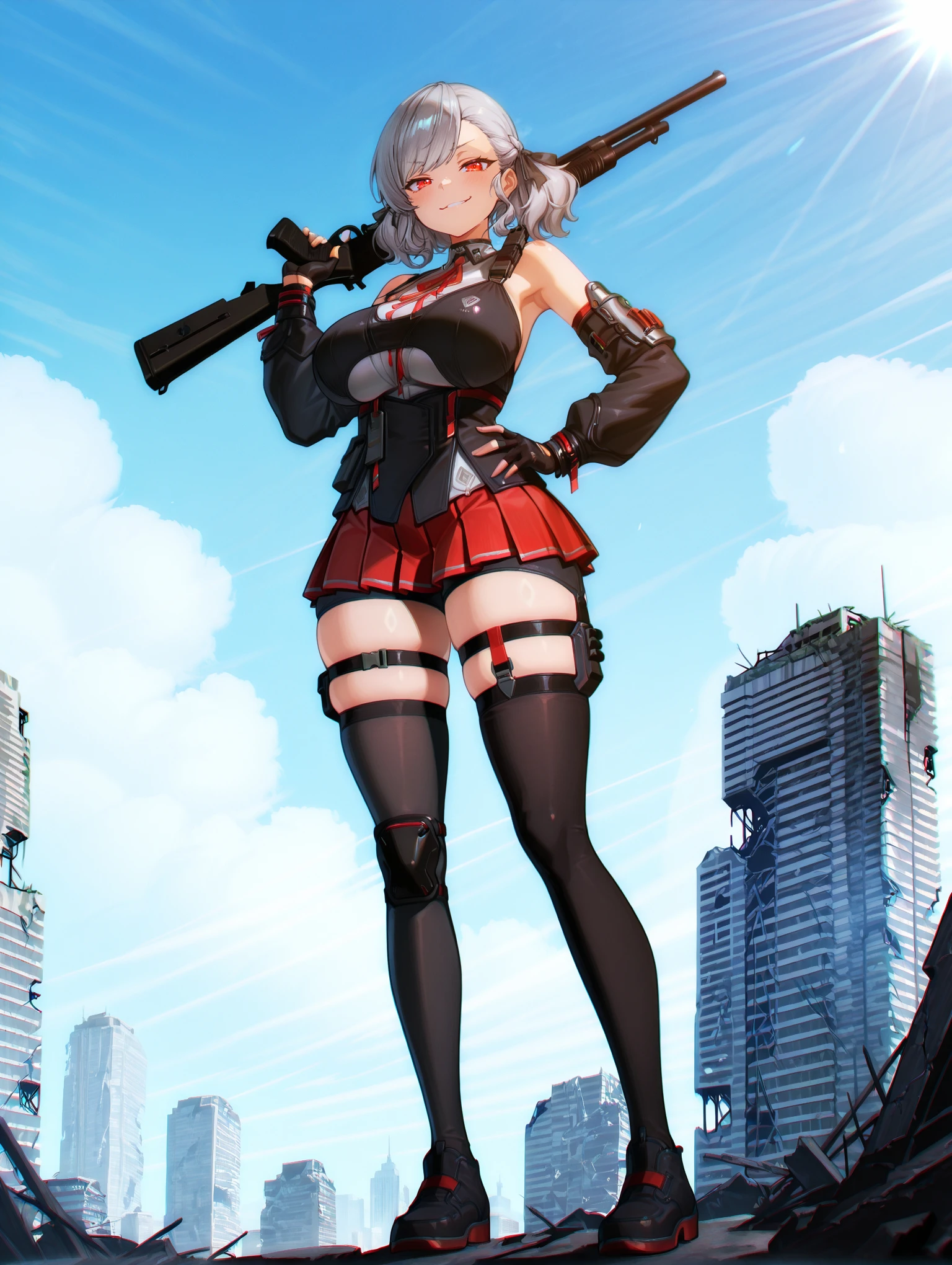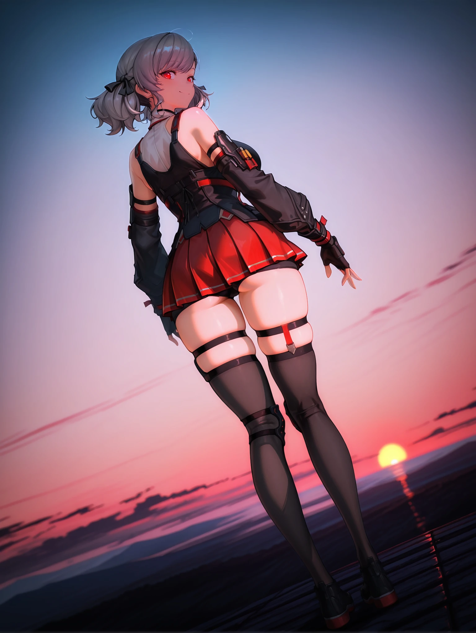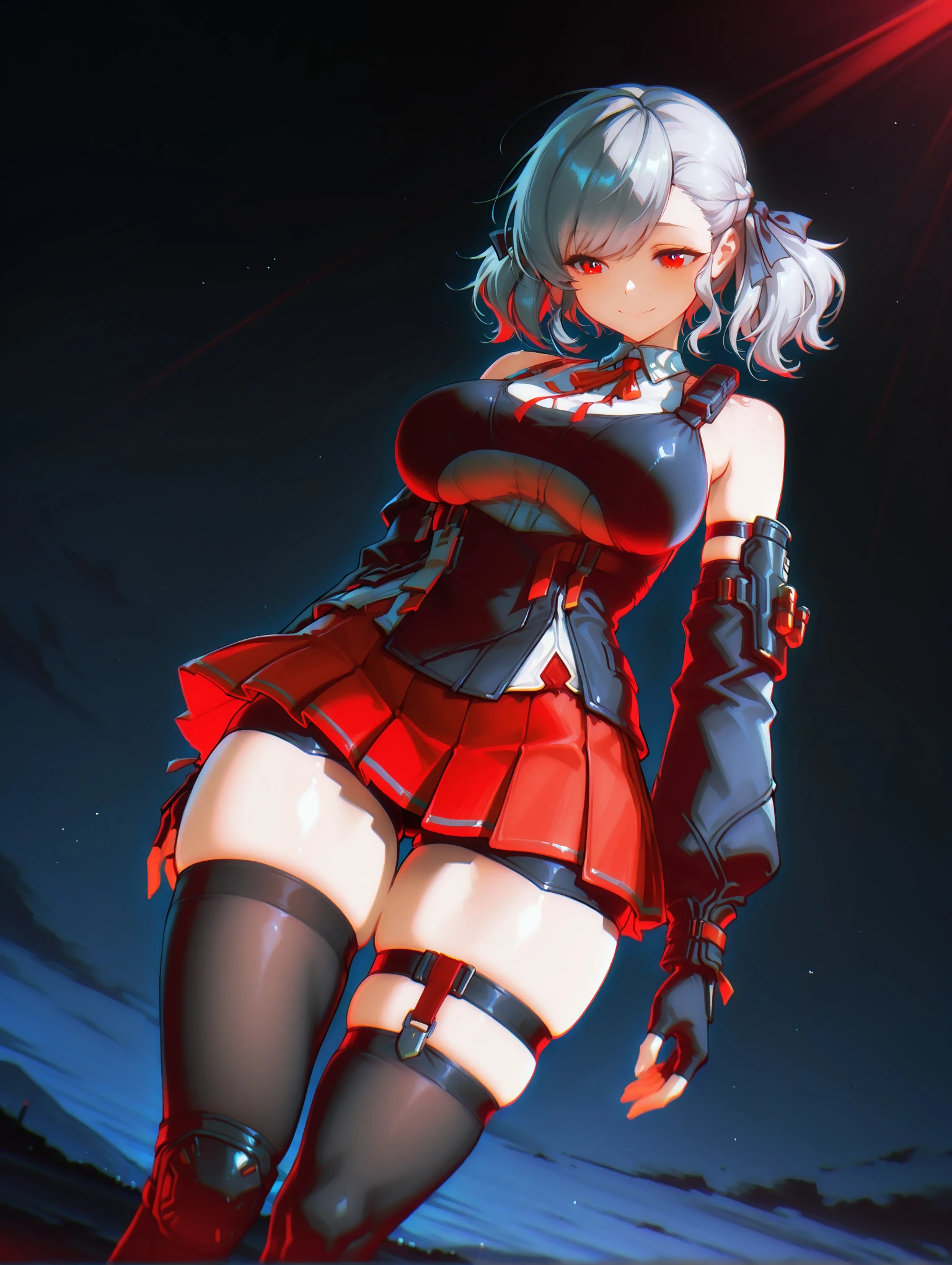 Outfit Prompt : gloves, thighhighs, fingerless gloves, detached sleeves, bare shoulders, black thighhighs, skirt, black gloves, red skirt, pleated skirt, skindentation, thigh strap, single knee pad, shoes, black footwear
