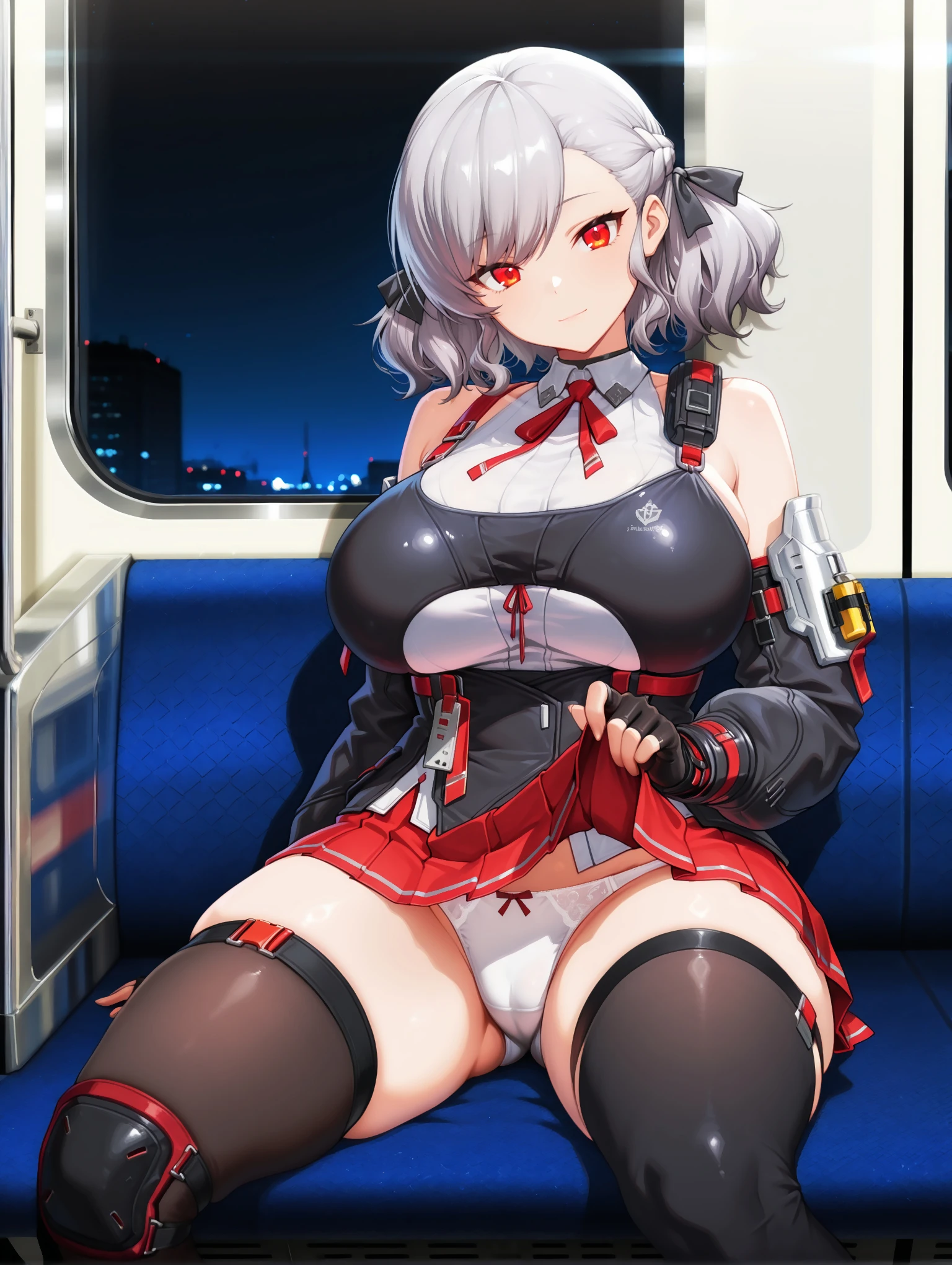 Sabrina Prompts : 1girl, large breast, ribbon, grey hair, bangs, red eyes, hair ribbon, twintails, braid, swept bangs