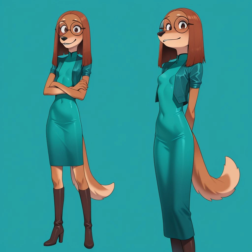 dog, dog girl, saluki, brown fur, brown hair, should-length hair, brown eyes, black nose, brown dog tail, slender body, small breasts, round glasses, teal jacket, teal dress, brown high heel boots,