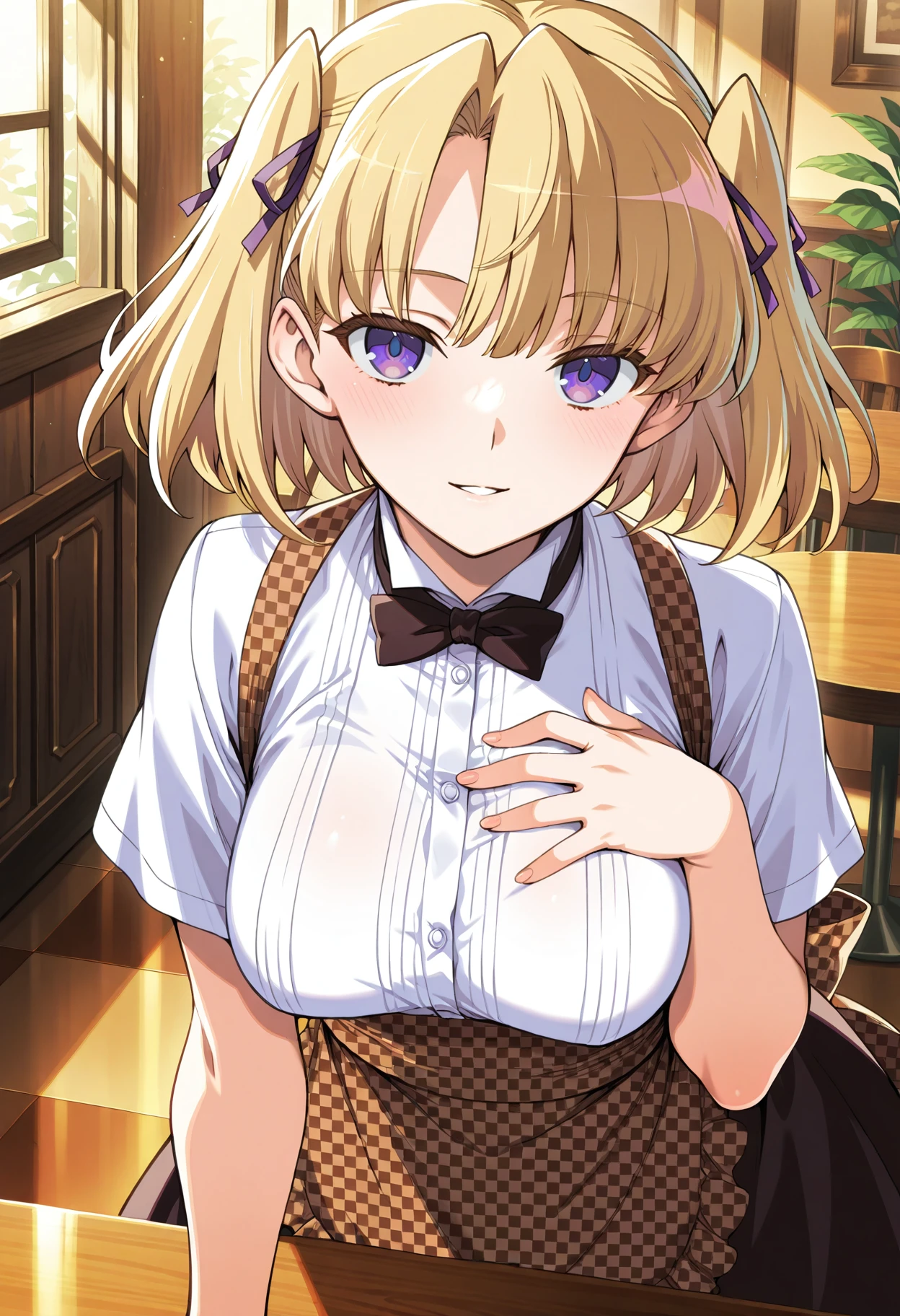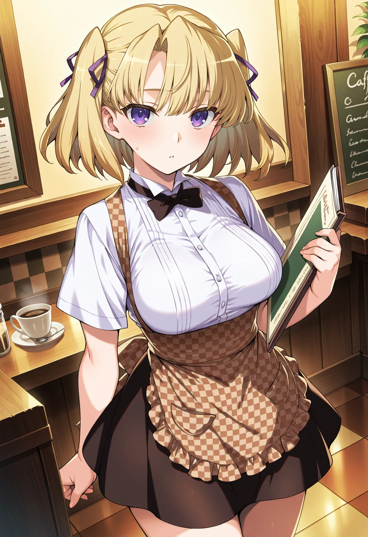 Waitress from Choukou Taisen Escalation Heroines: uruza_p, 1girl, retro artstyle, solo, blonde hair, short hair, two side up, hair between eyes, purple eyes, uruza waitress, white shirt, checkered apron, black skirt, black bowtie, short sleeves, high-waist skirt, collared shirt, medium breasts,
