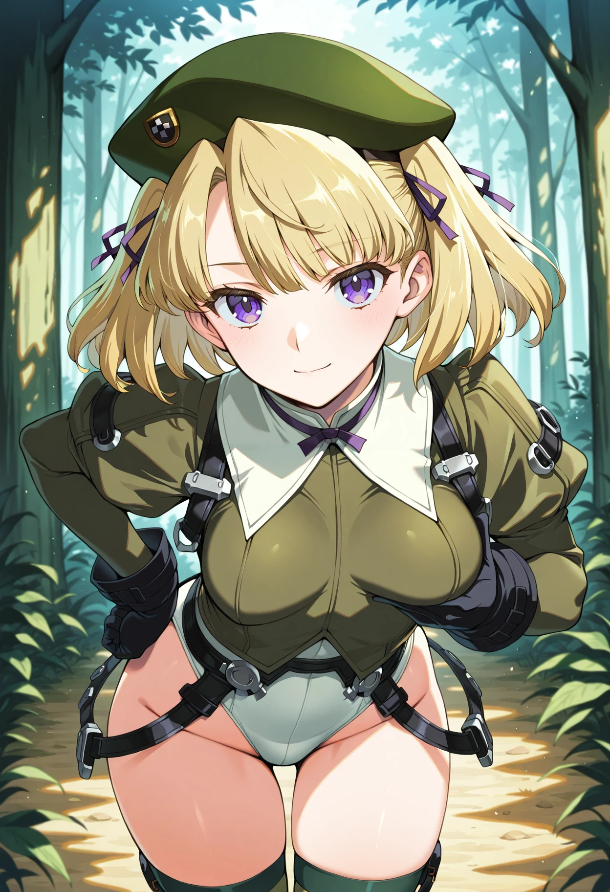 Base: uruza_p, 1girl, retro artstyle, solo, blonde hair, short hair, two side up, hair ribbon, hair between eyes, purple eyes ,green beret, uruza green shirt, white highleg leotard, juliet sleeves, long sleeves, black gloves, battle belt, medium breasts, thighhighs,