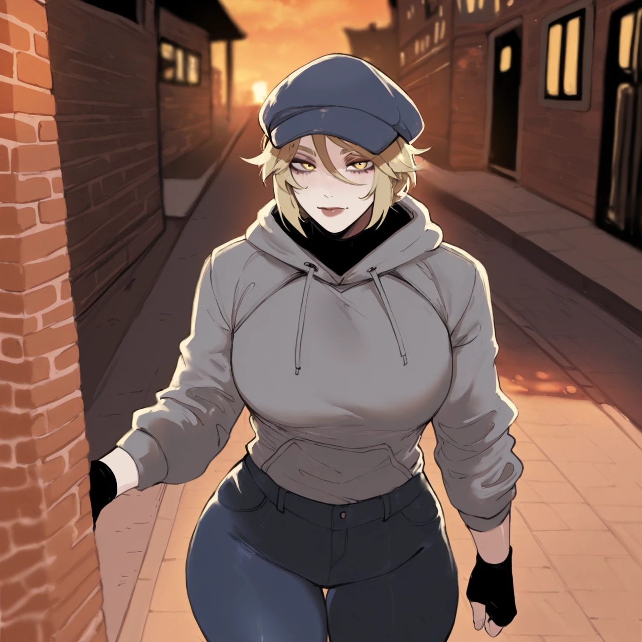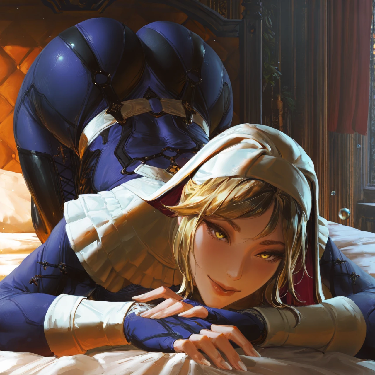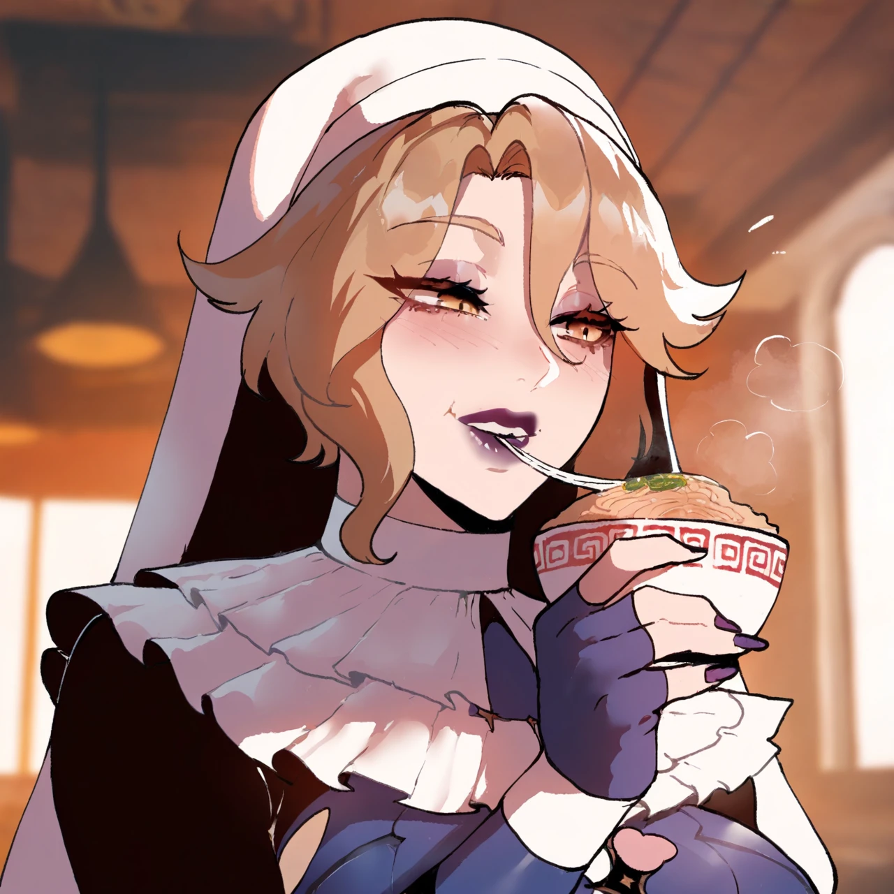 protowisp, short hair, blonde hair, yellow eyes, lips, covered navel, , skin tight, nun, habit, fingerless gloves, long sleeves