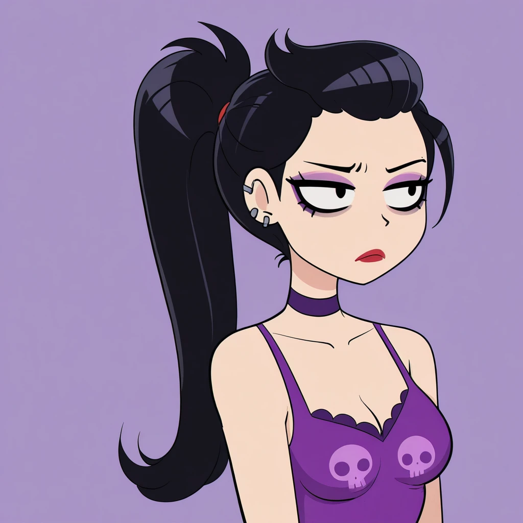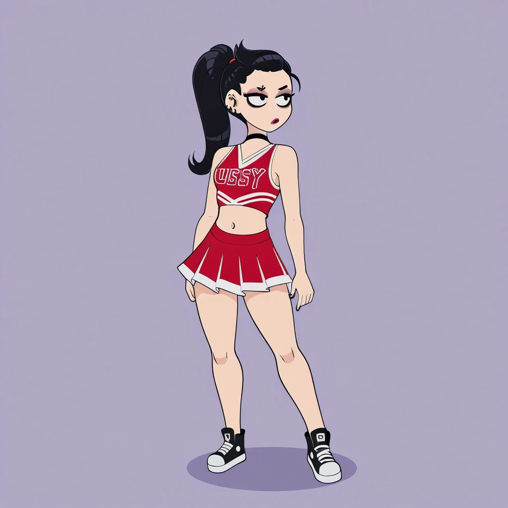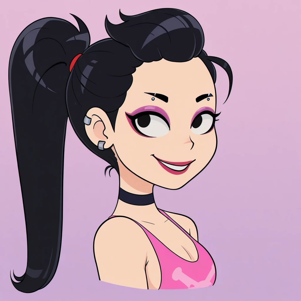 Stacey, 1girl, long hair, breasts, small breasts, black hair, ponytail, choker, multiple earrings, makeup,red crop top, navel, red pleated skirt, black sneakers,barefoot, navel, fingerless gloves, purple tank top, pink pants, skull print,Prompt for Stacey’s Mother: