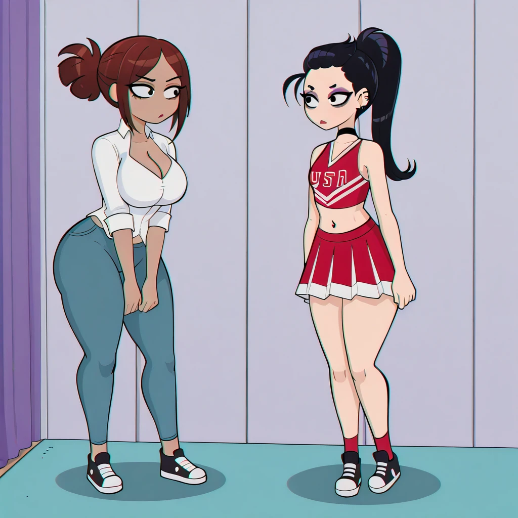 VeronicaCruz, 1girl, solo, black eyes, bangs, medium breasts, large breasts, brown hair, ponytail, medium hair, dark skin, dark-skinned female, parted bangs, curvy, mature female, makeup, wide hips, white shirt, cleavage, blue pants,The original style of Shadman's comics has a slight chromatic aberration; if you want to avoid it, you can add the following negative prompt: