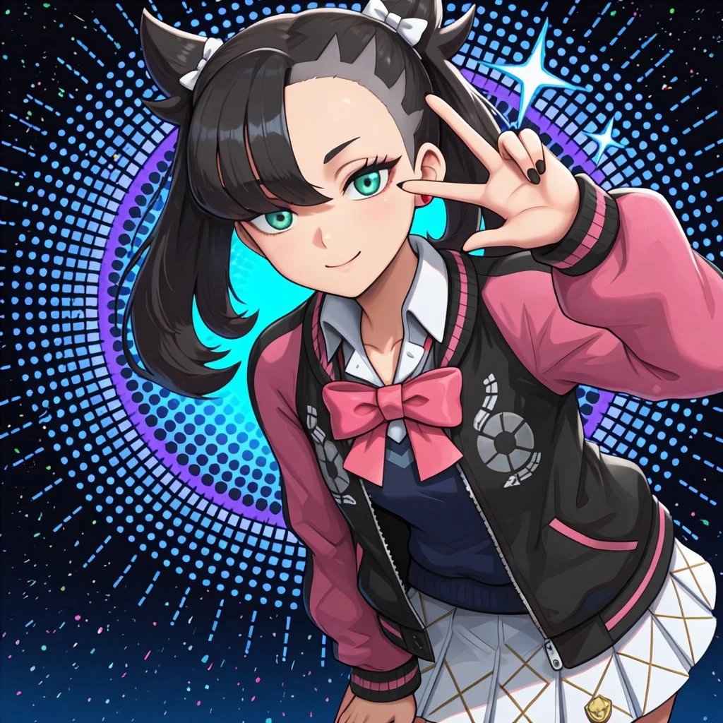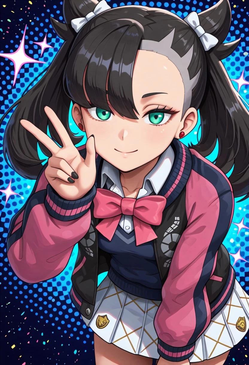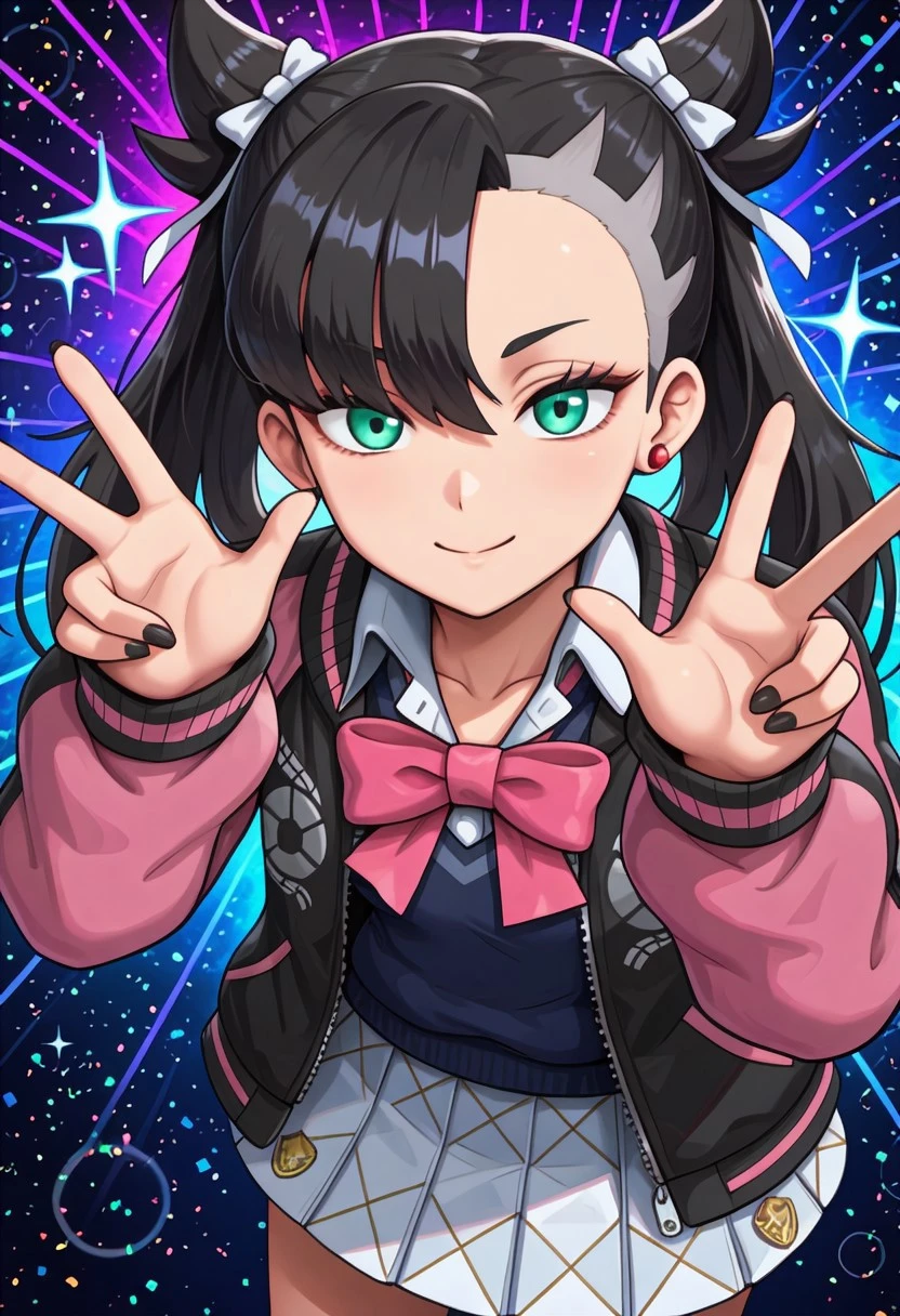 acmarnie, green eyes, black nails, black hair, asymmetrical bangs, white hair ribbon,