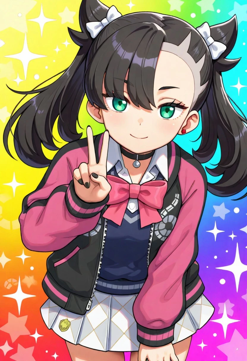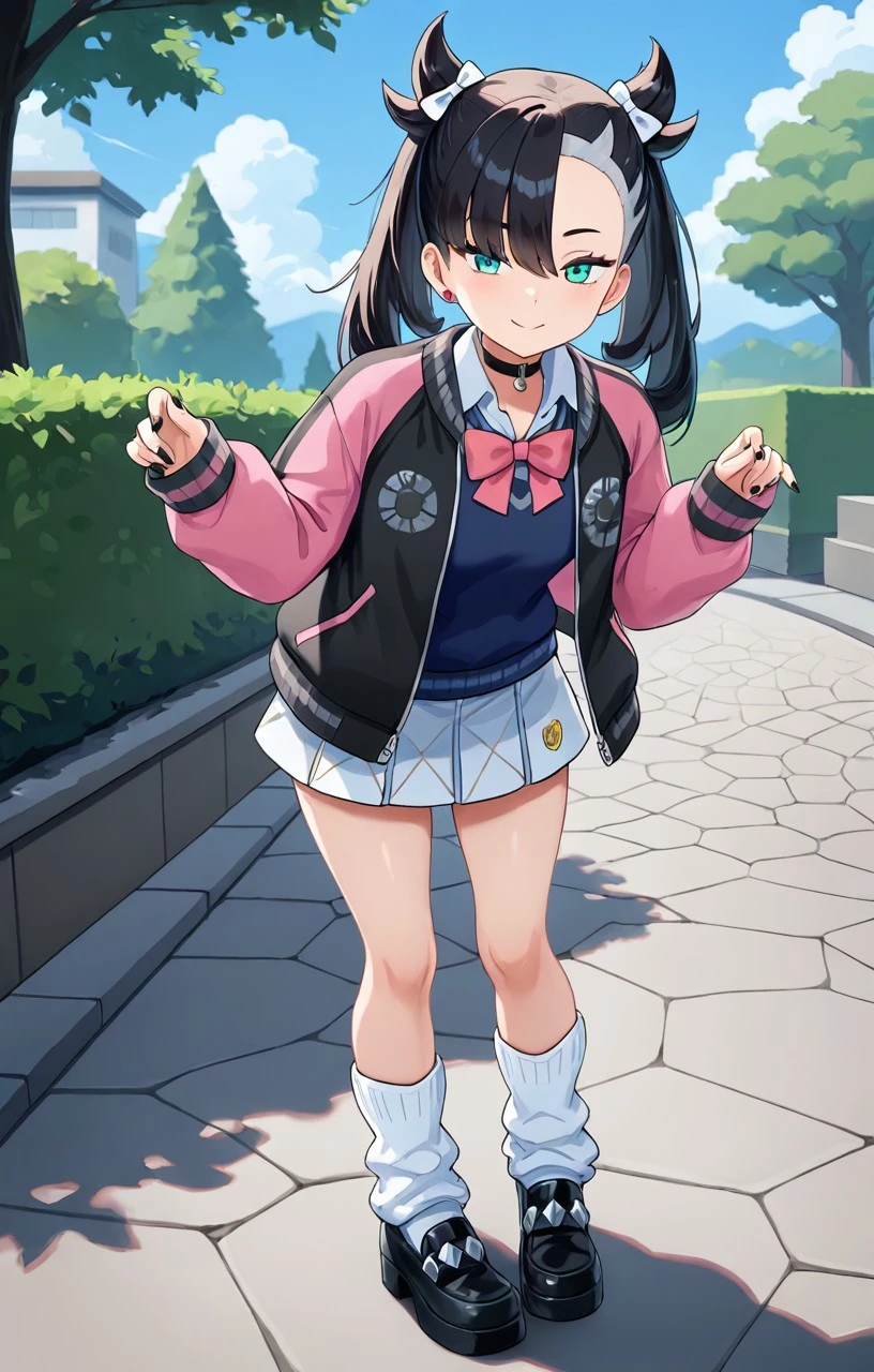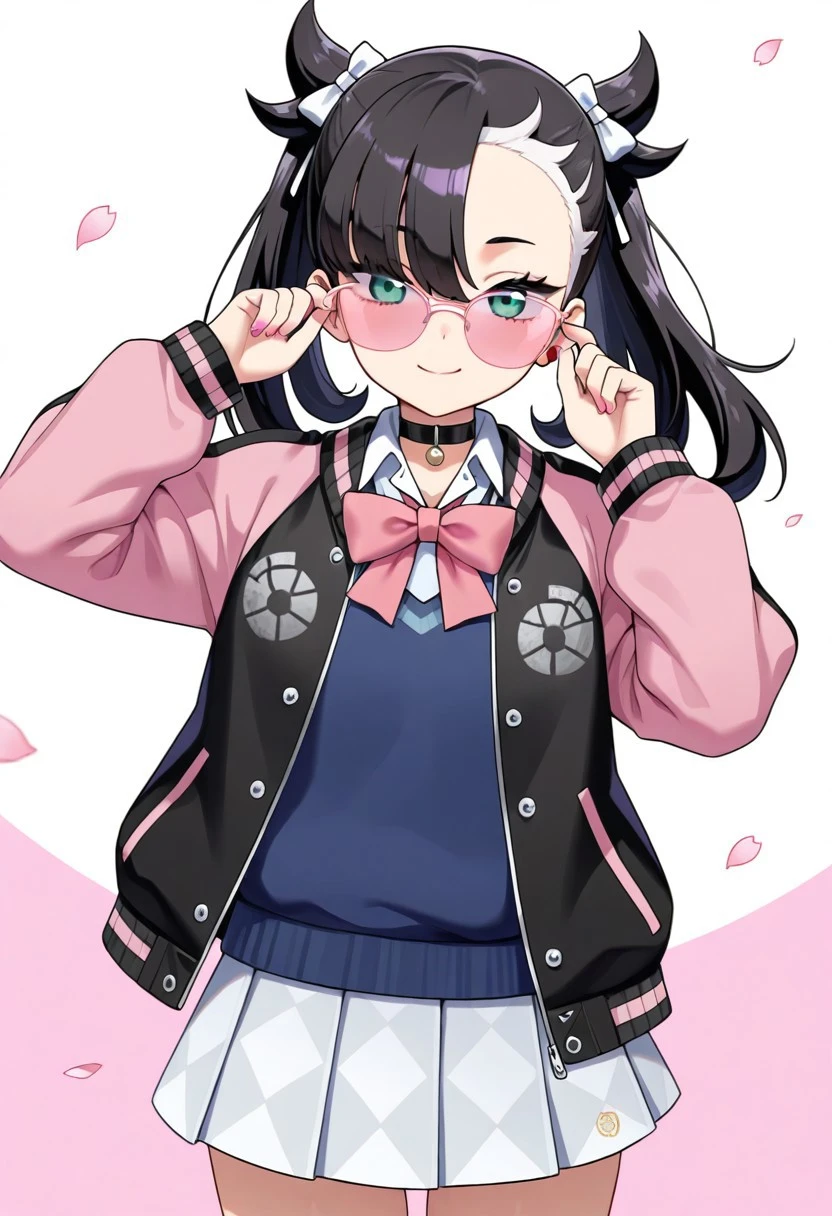 black jacket, pink jacket, multicolored jacket, open jacket, blue sweater vest, white collared shirt, long sleeves, pink bowtie, pleated skirt, white skirt, checkered skirt, miniskirt, white socks, loose socks, shoes, black footwear