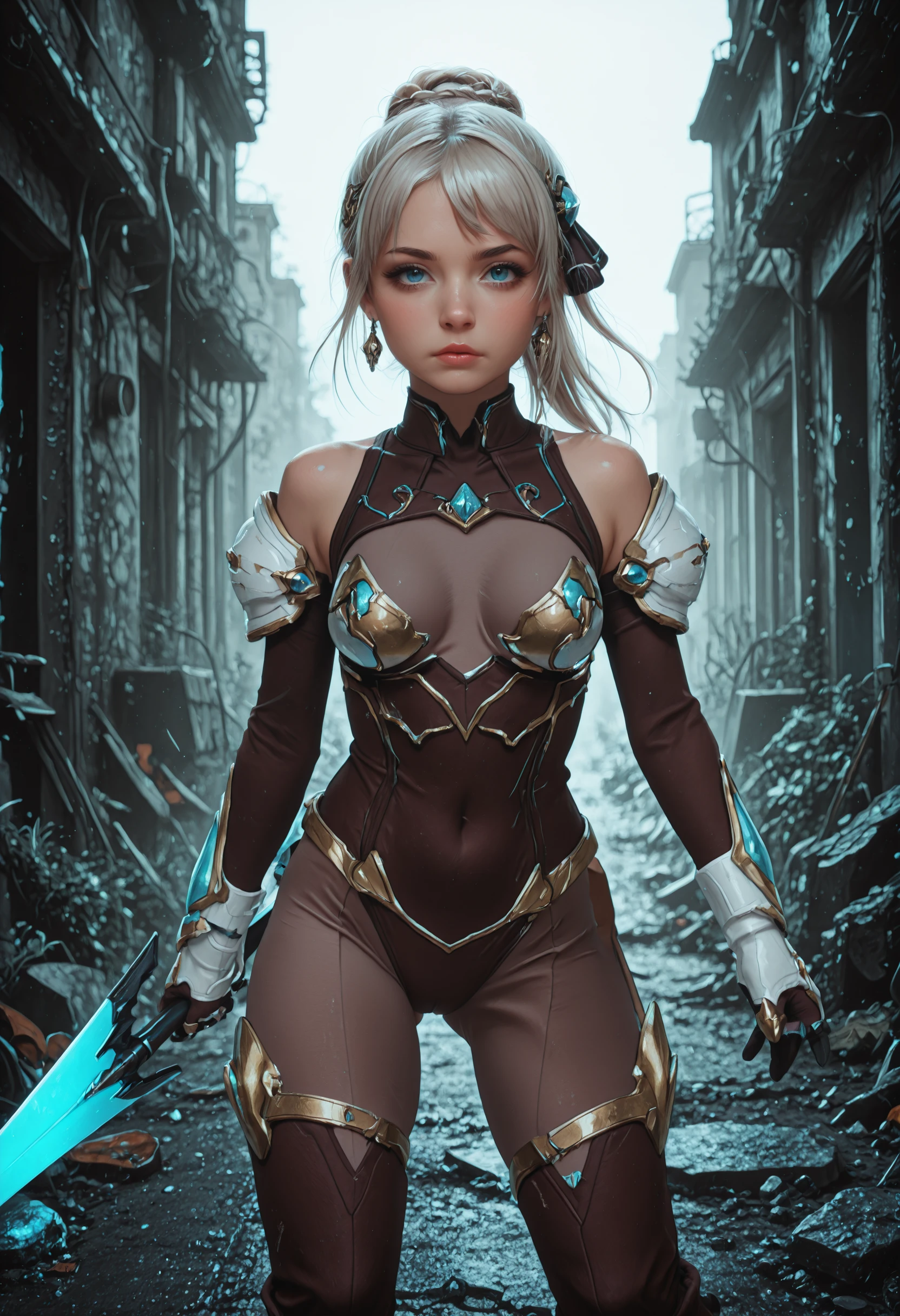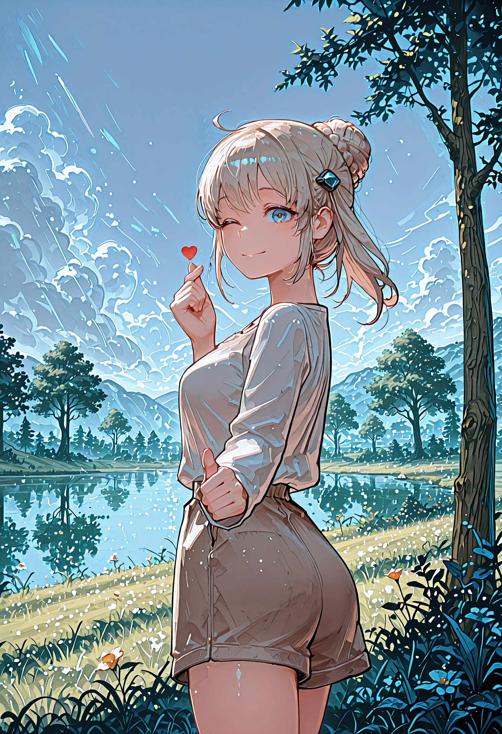 Trigger :1girl, solo, blue eyes, long hair, single hair bun, hair ornament, braid, ponytail, ahoge,
