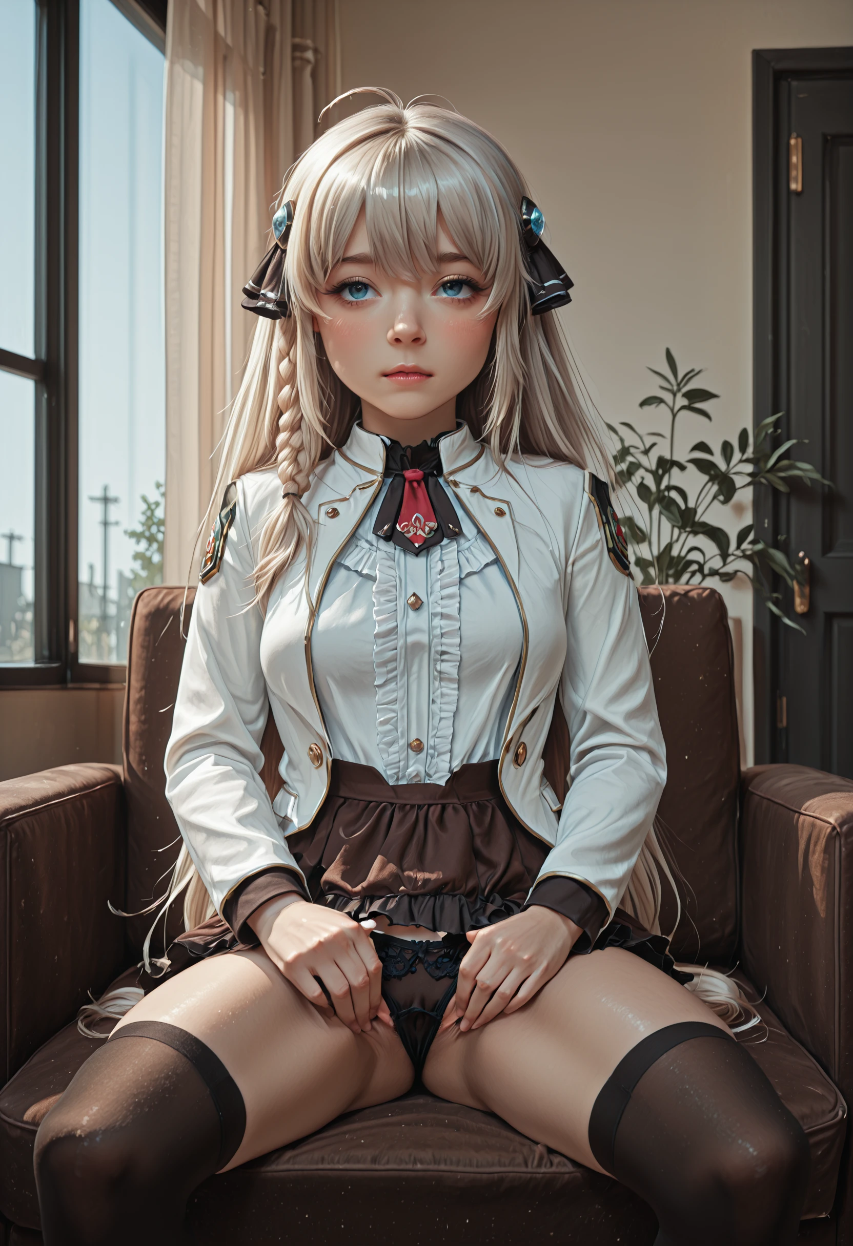 Outfit trigger : pantyhose, panties under pantyhose, black pantyhose, frills, jacket, long sleeves, center frills, ponytail, panties under pantyhose, cameltoe, french braid, white uniform, white jacket, no pants, white shirt,