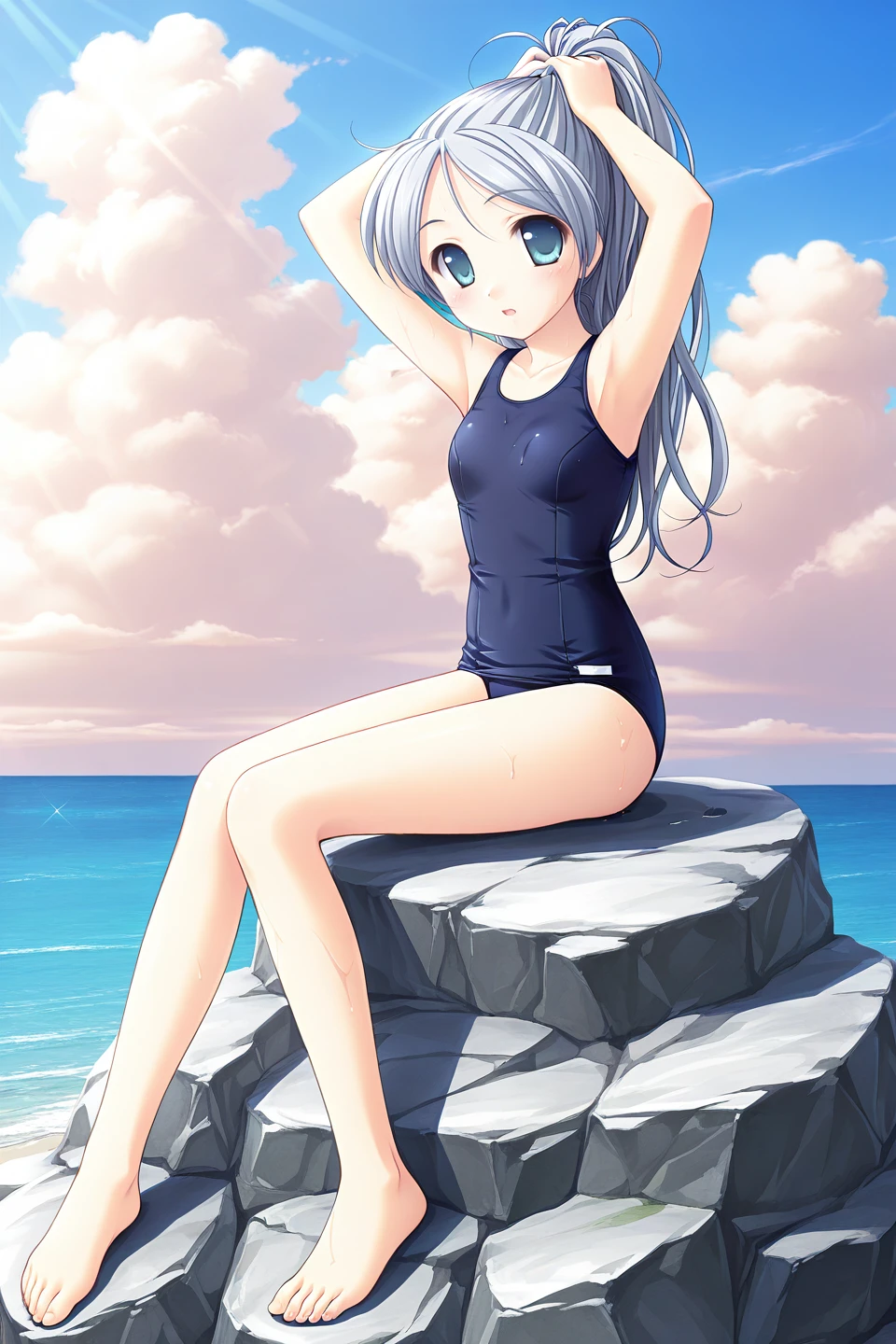 swimsuit,collarbone,blue one-piece swimsuit,old school swimsuit,barefoot,