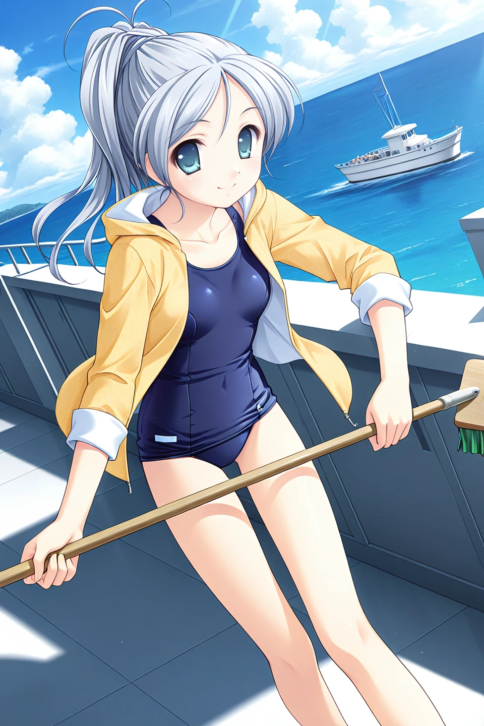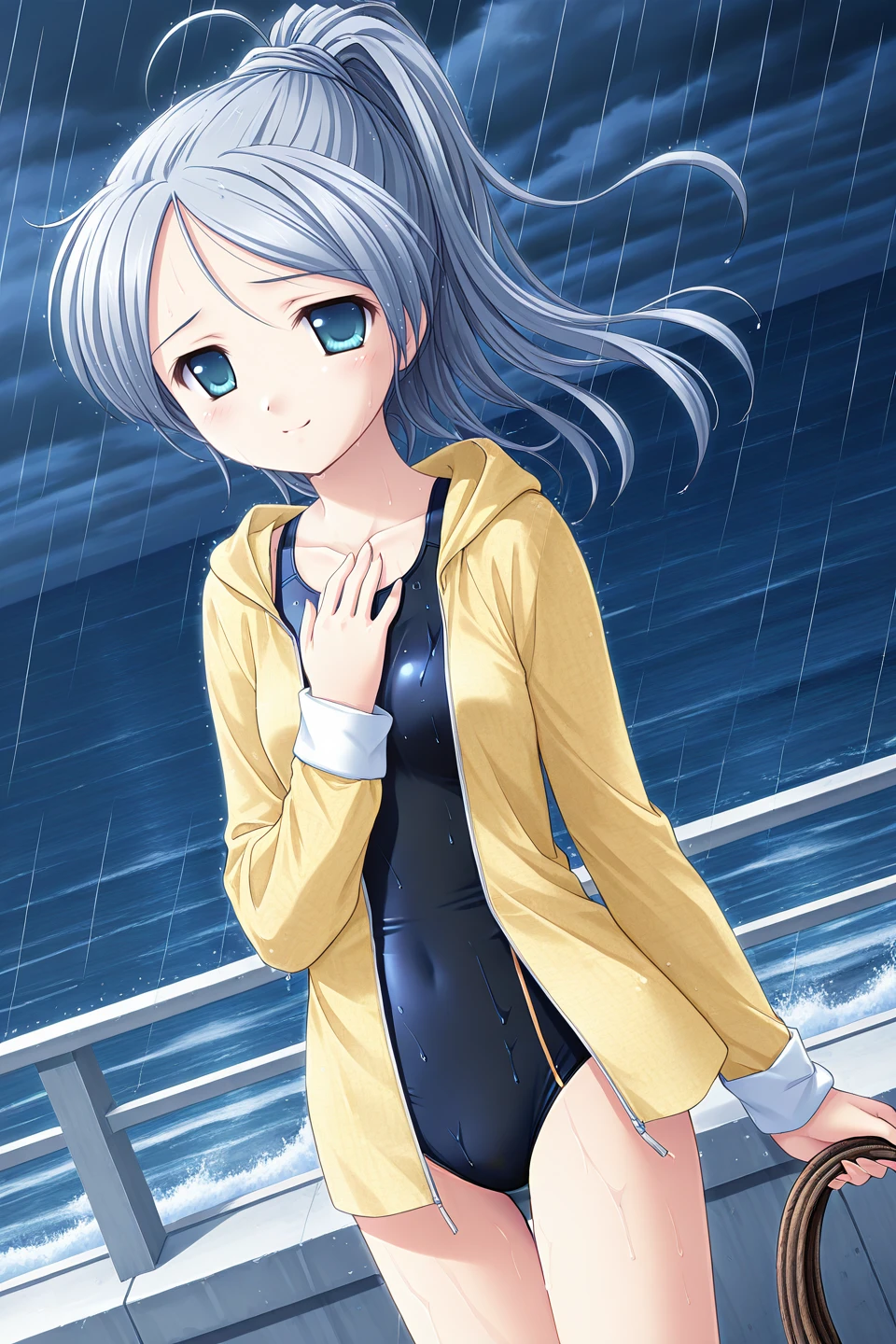 yellow jacket,hooded jacket,open jacket,yellow hood,hood down,long sleeves,sleeves rolled up,jacket over swimsuit,no pants,