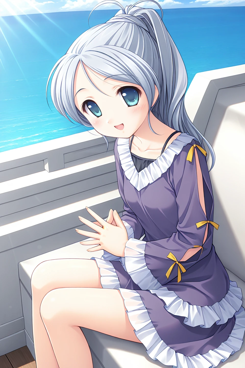casual,purple dress,frilled dress,frilled collar,white frill,black camisole,collarbone,v-neck,long sleeves,wide sleeves,frilled sleeves,clothing cutout,yellow ribbon,miniskirt,frilled skirt,
