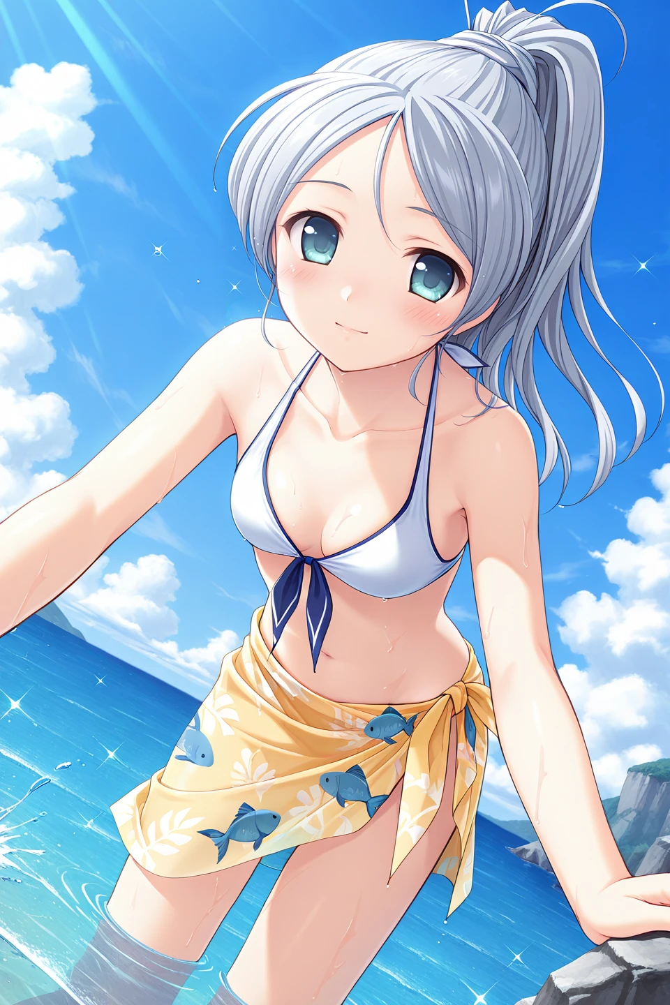 swimsuit,white bikini,front-tie top,collarbone,cleavage,yellow sarong,print sarong,fish print,barefoot,