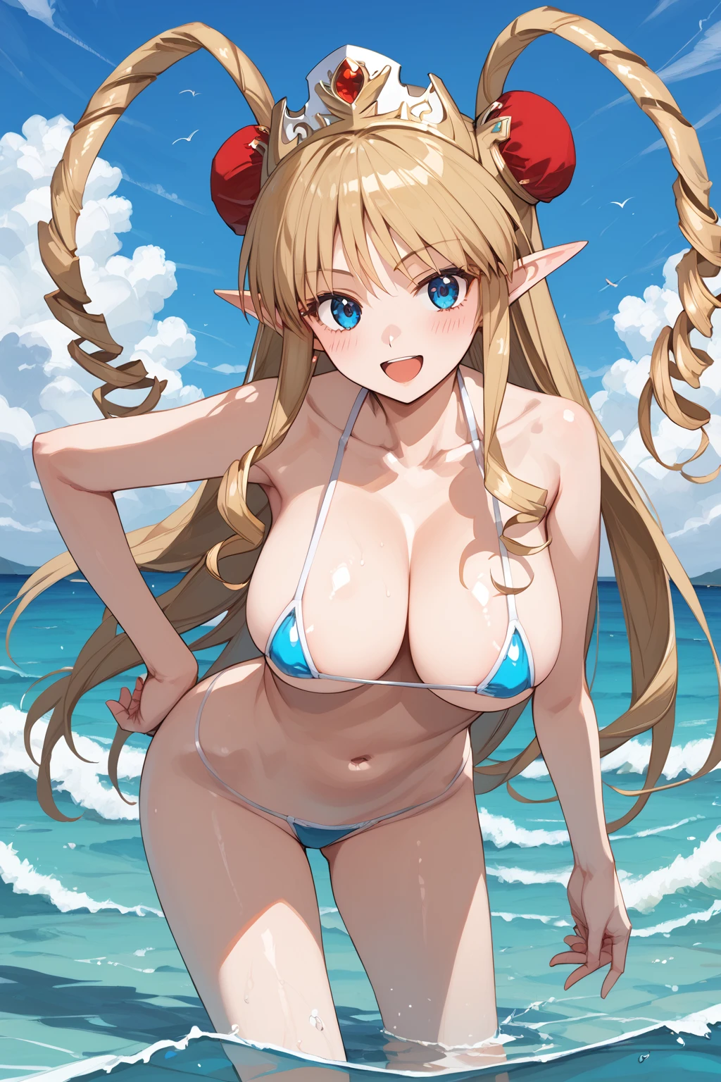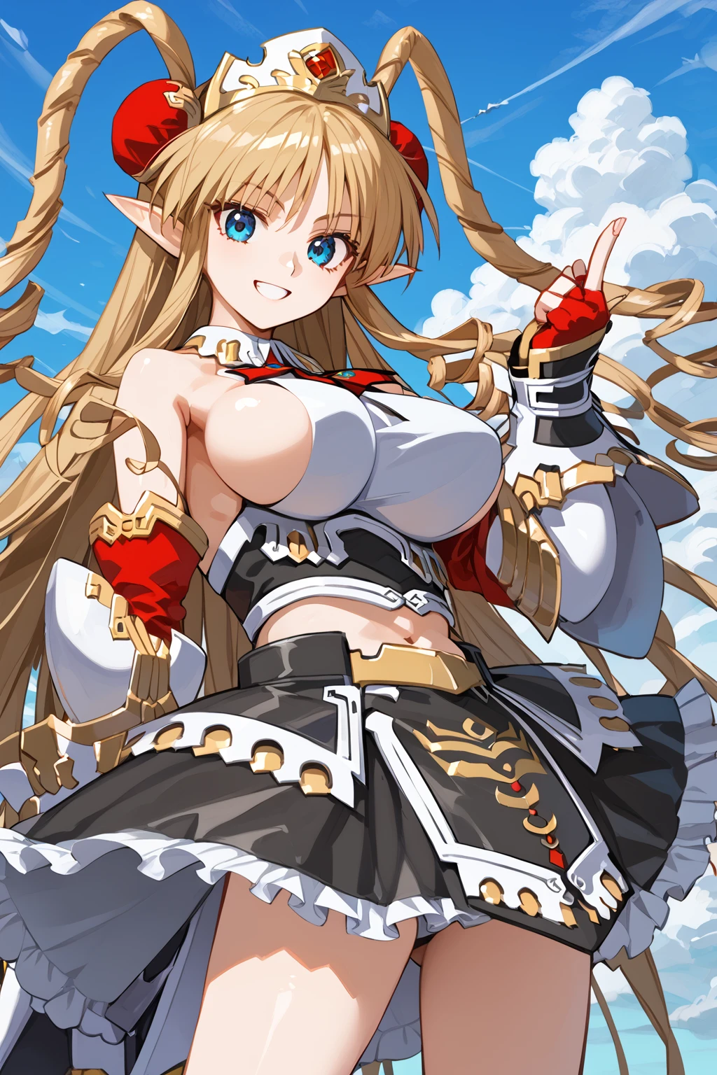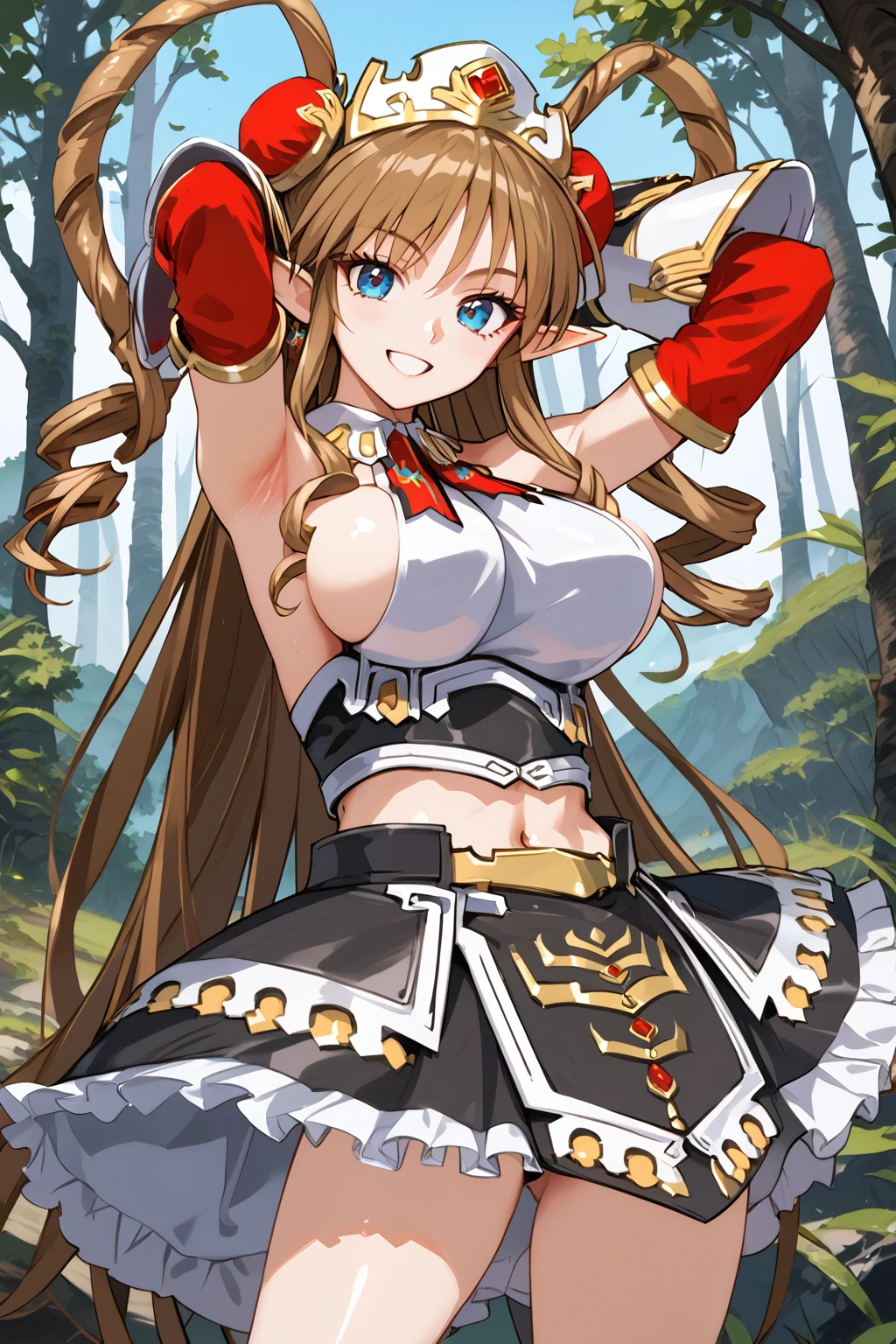 neigehausen, pointy ears, red bun cover, drill locks, very long hair, twin drills,, crown, brown hair, large breasts,