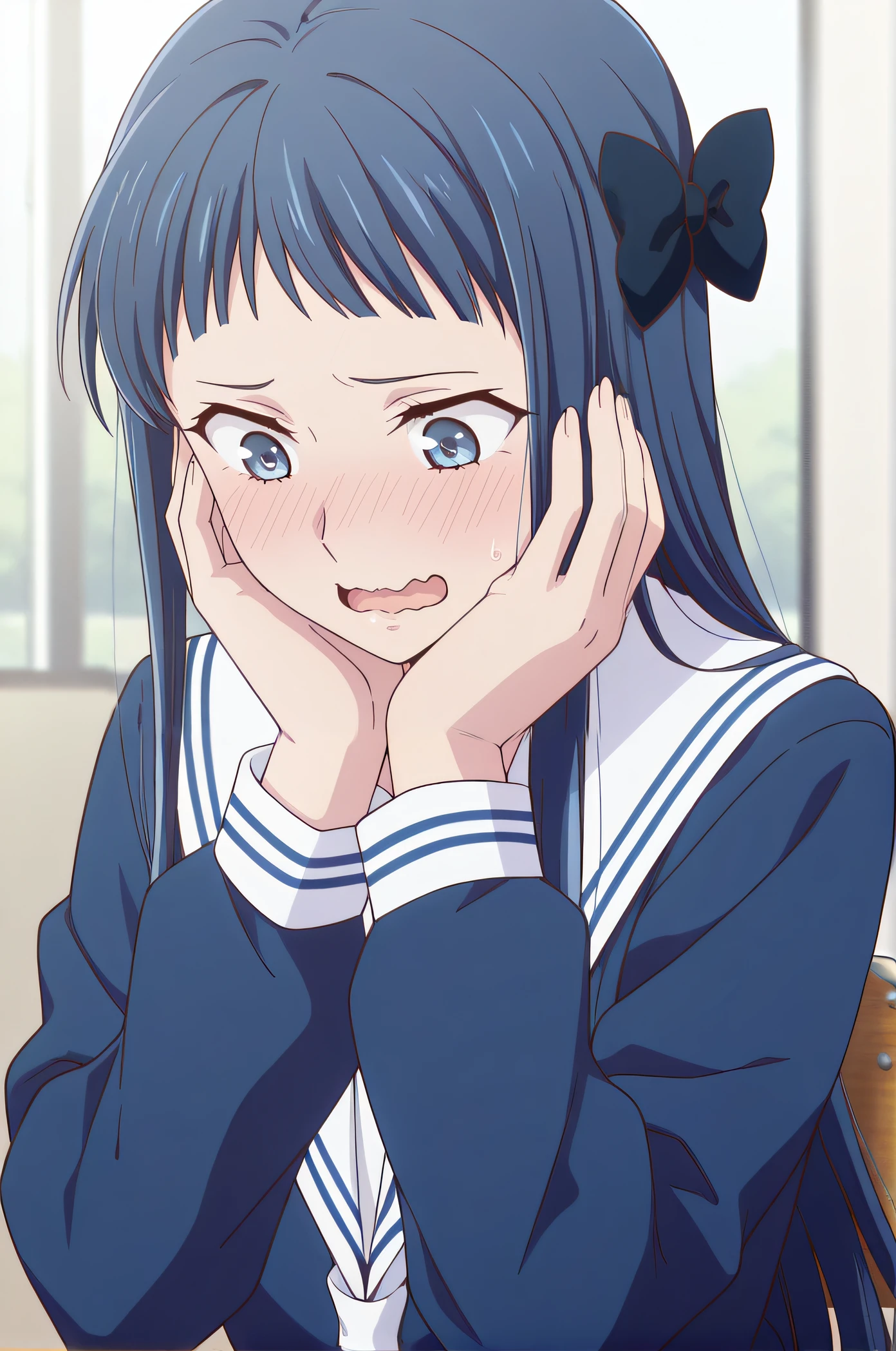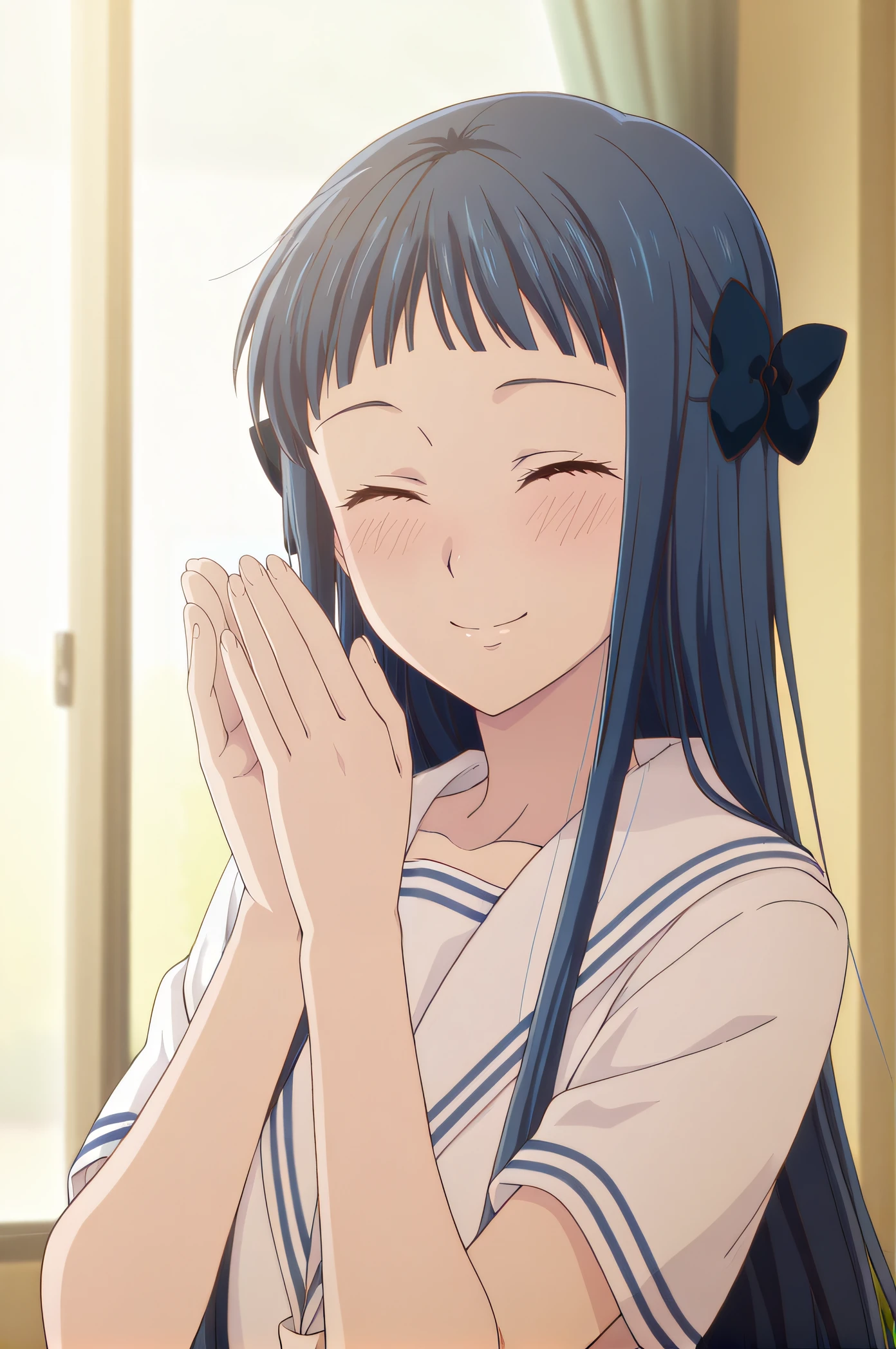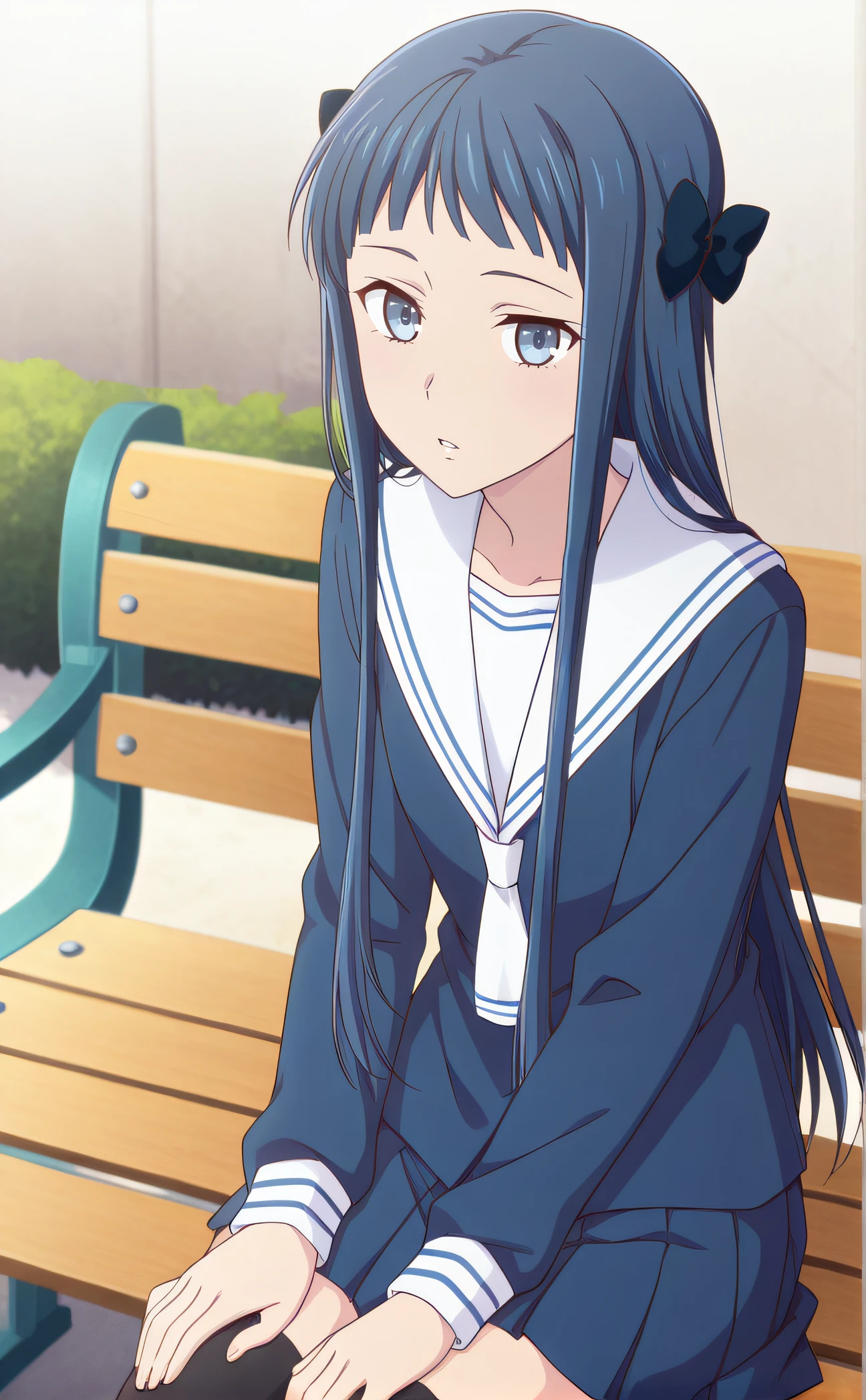 minagawa, blue eyes, blue hair, long hair, hair bows