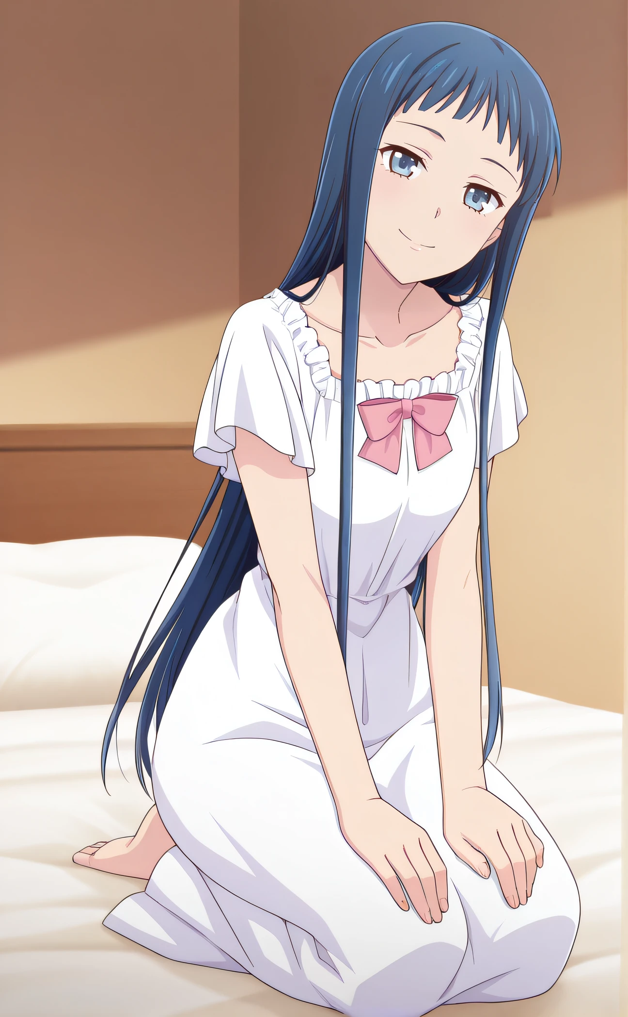 minagawa, blue eyes, blue hair, loose hair, white pajama dress, frills, collarbone, pink bowtie, barefeet