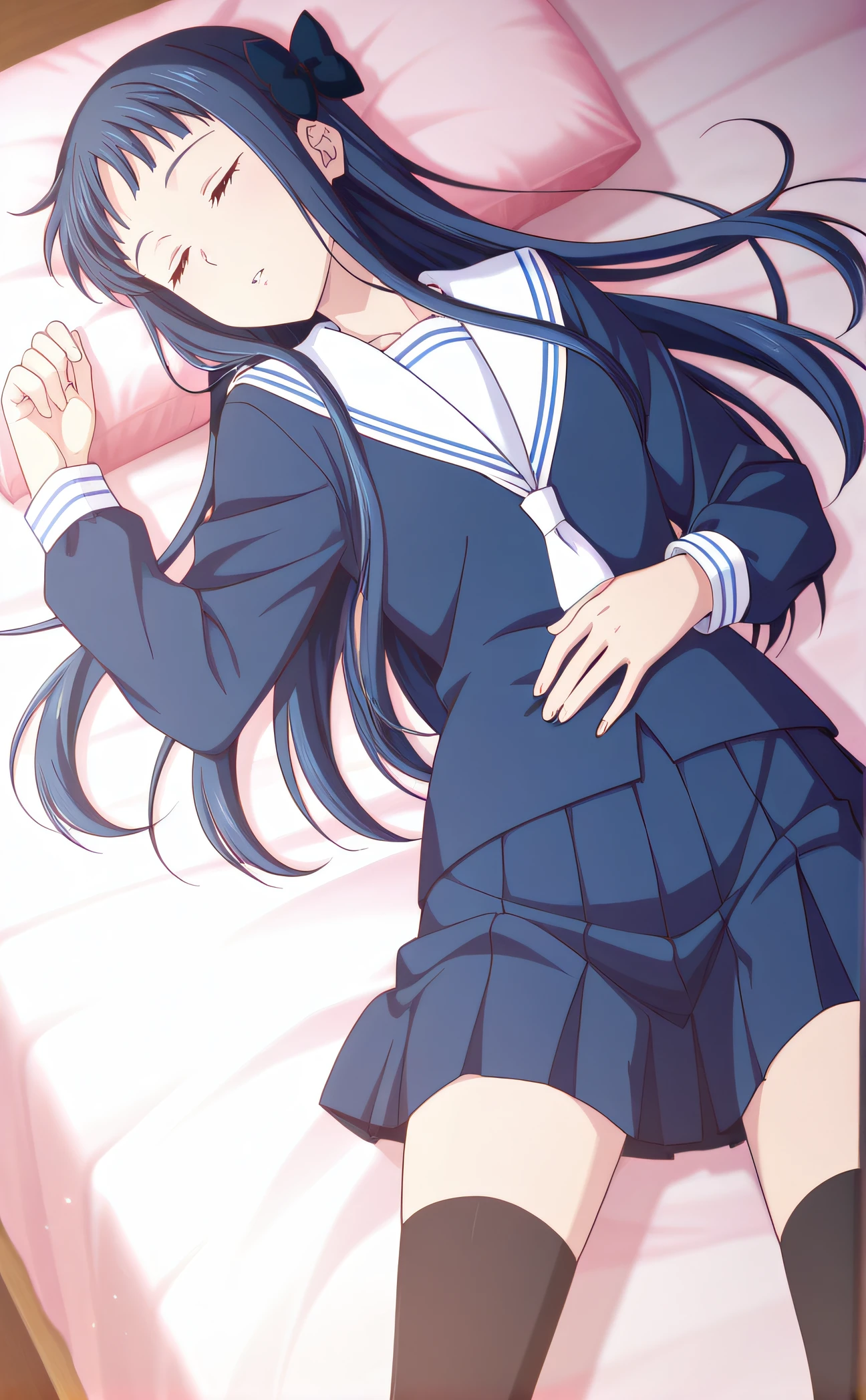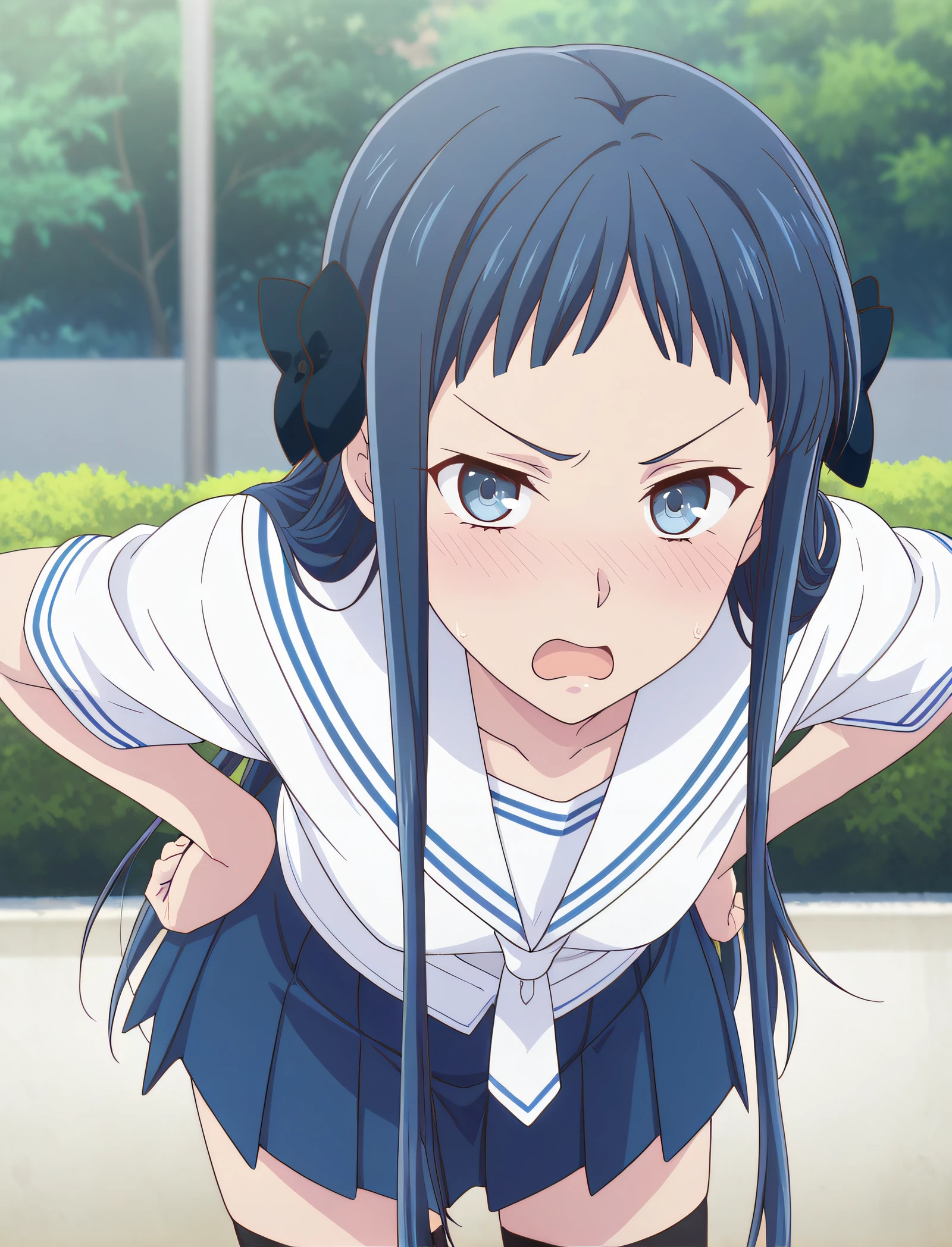 school uniform, long sleeves, blue shirt, serafuku, blue pleated skirt, black thighhighs