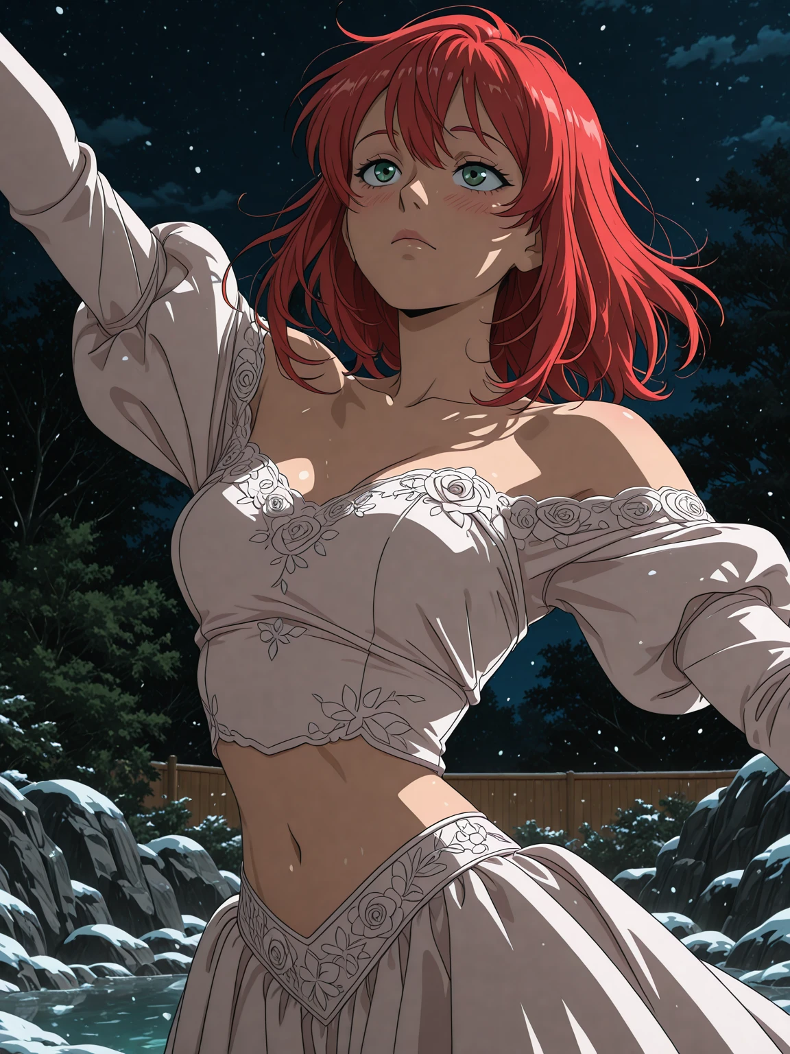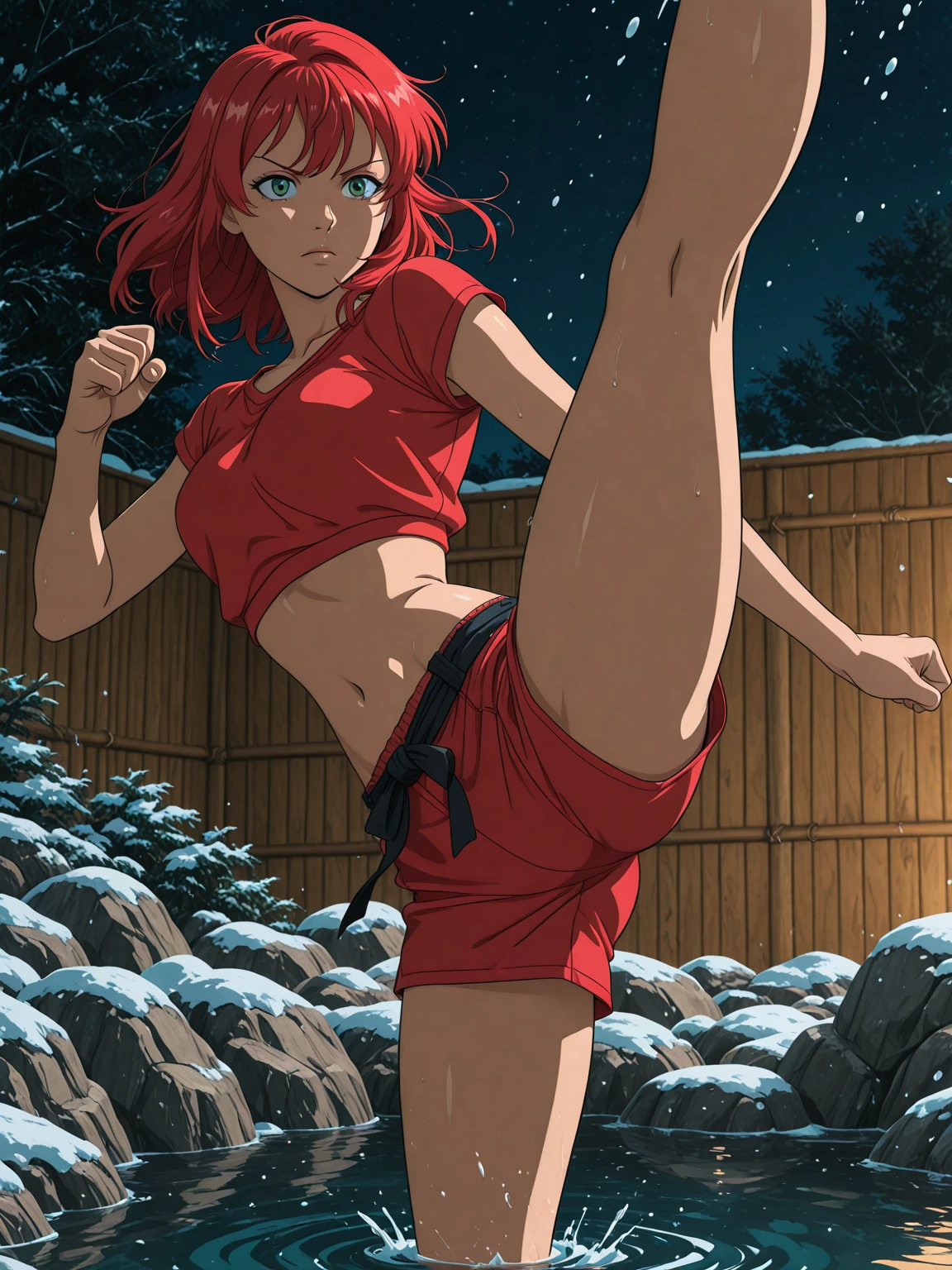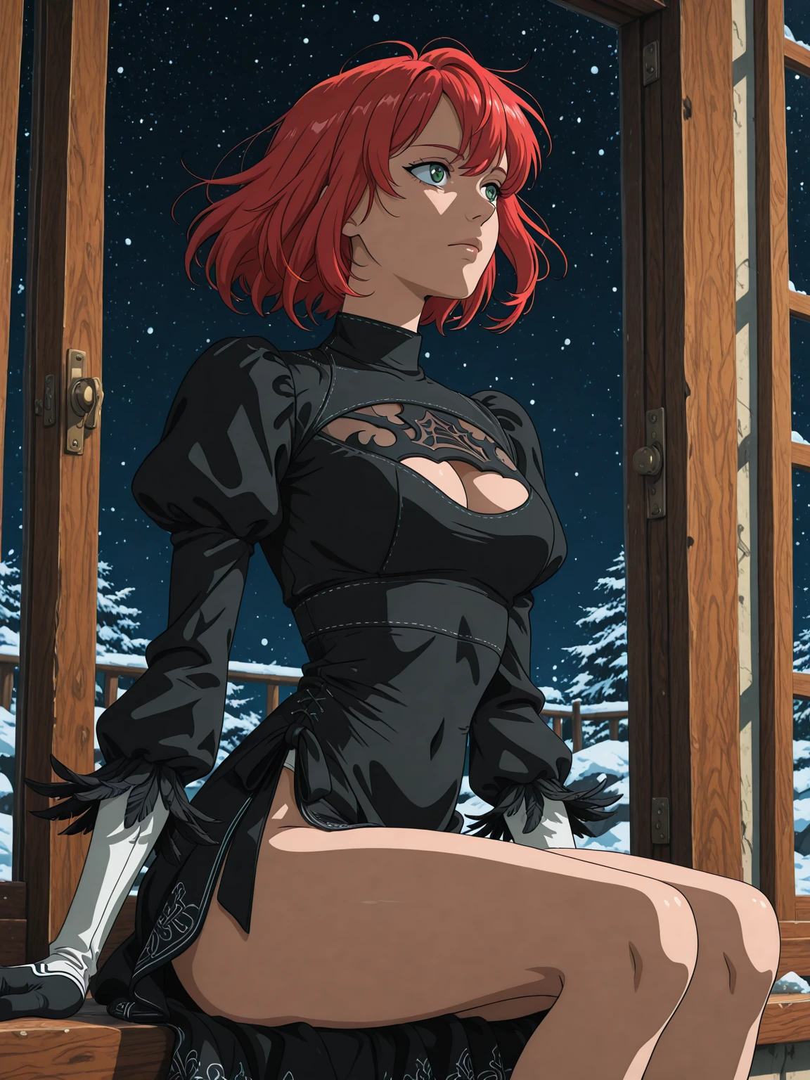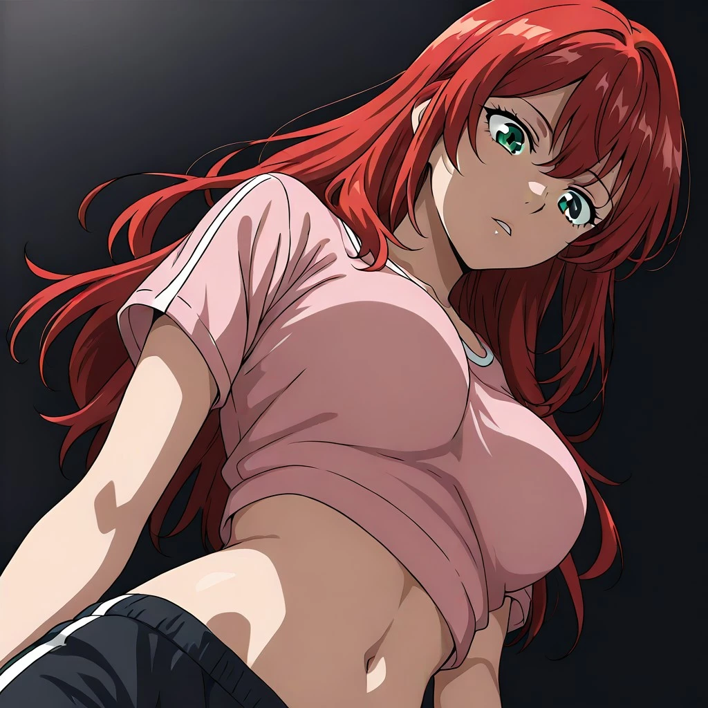 dark green eyes, red hair, medium breasts