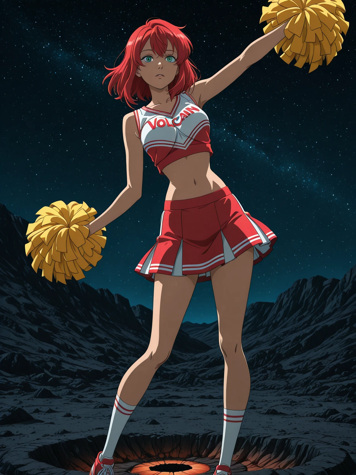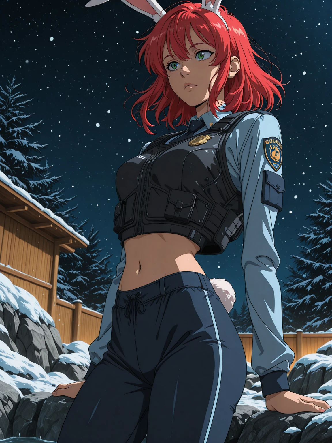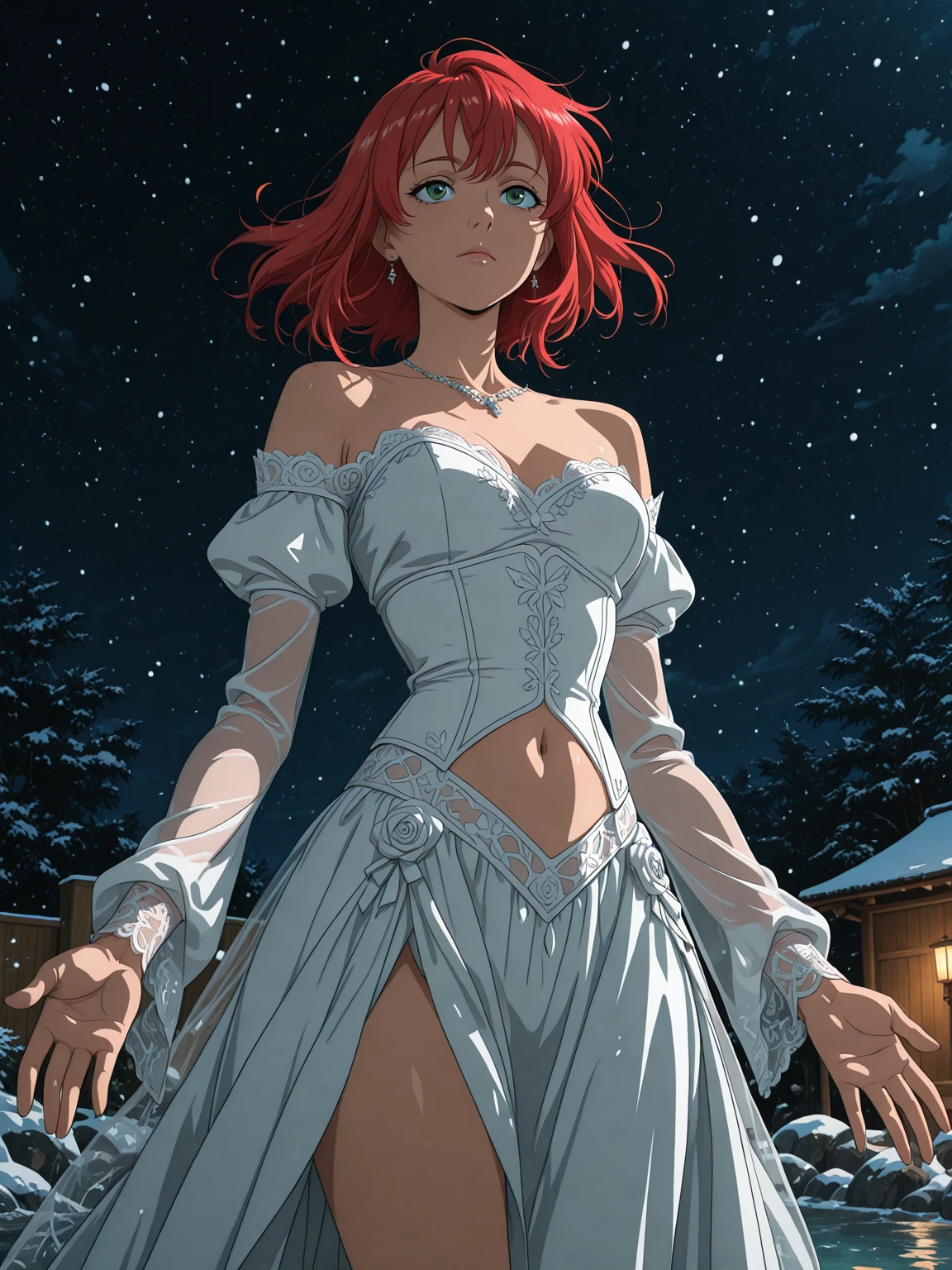 dark green eyes, red hair, medium breasts
