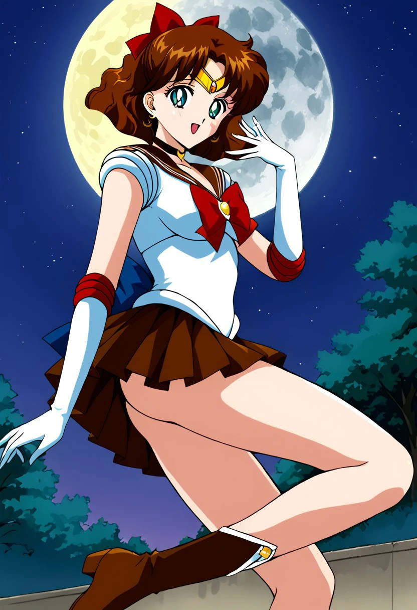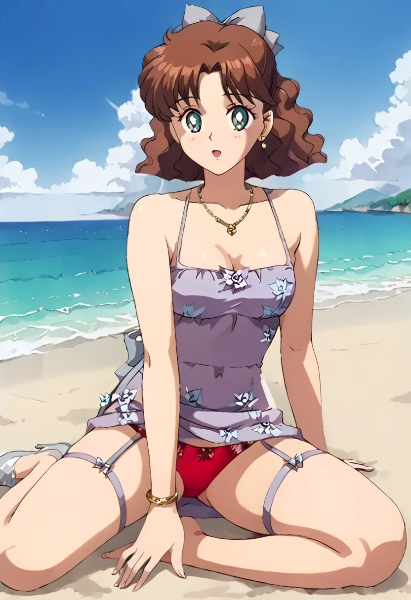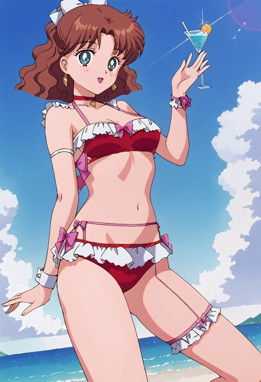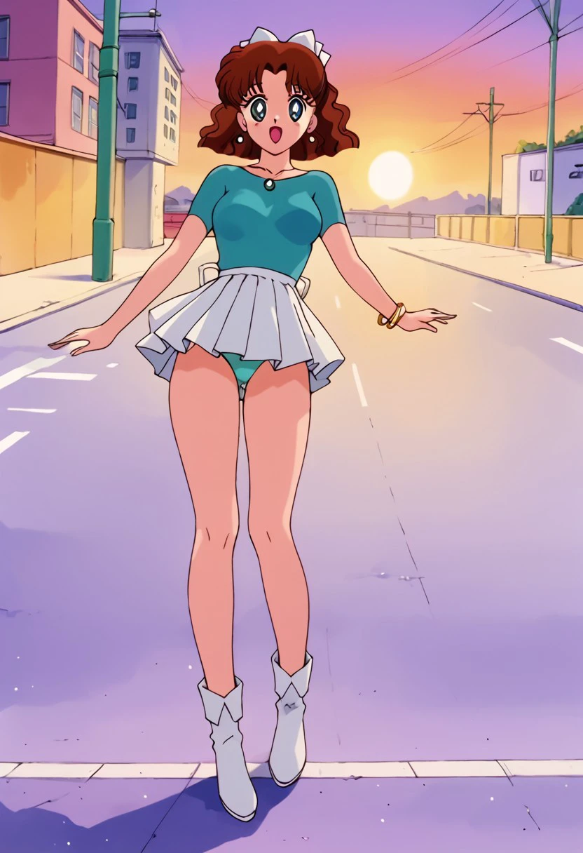 (1 girl, cute face, alone, brown hair, medium hair, wavy hair, bun, hair bow, teal eyes, detailed pupils, medium breasts)