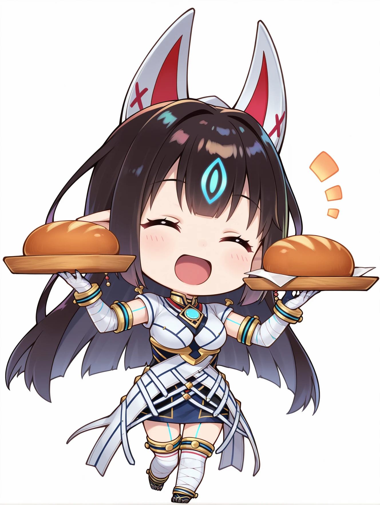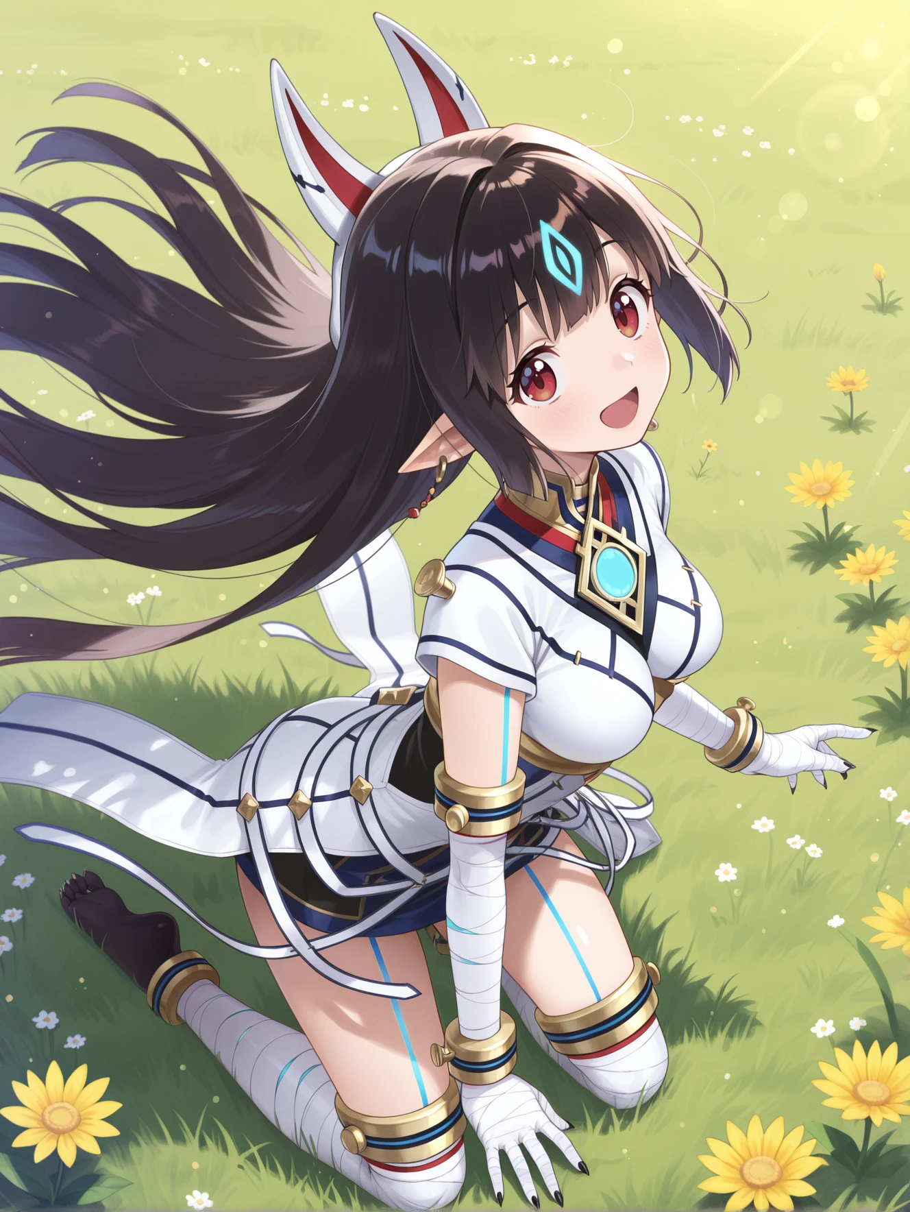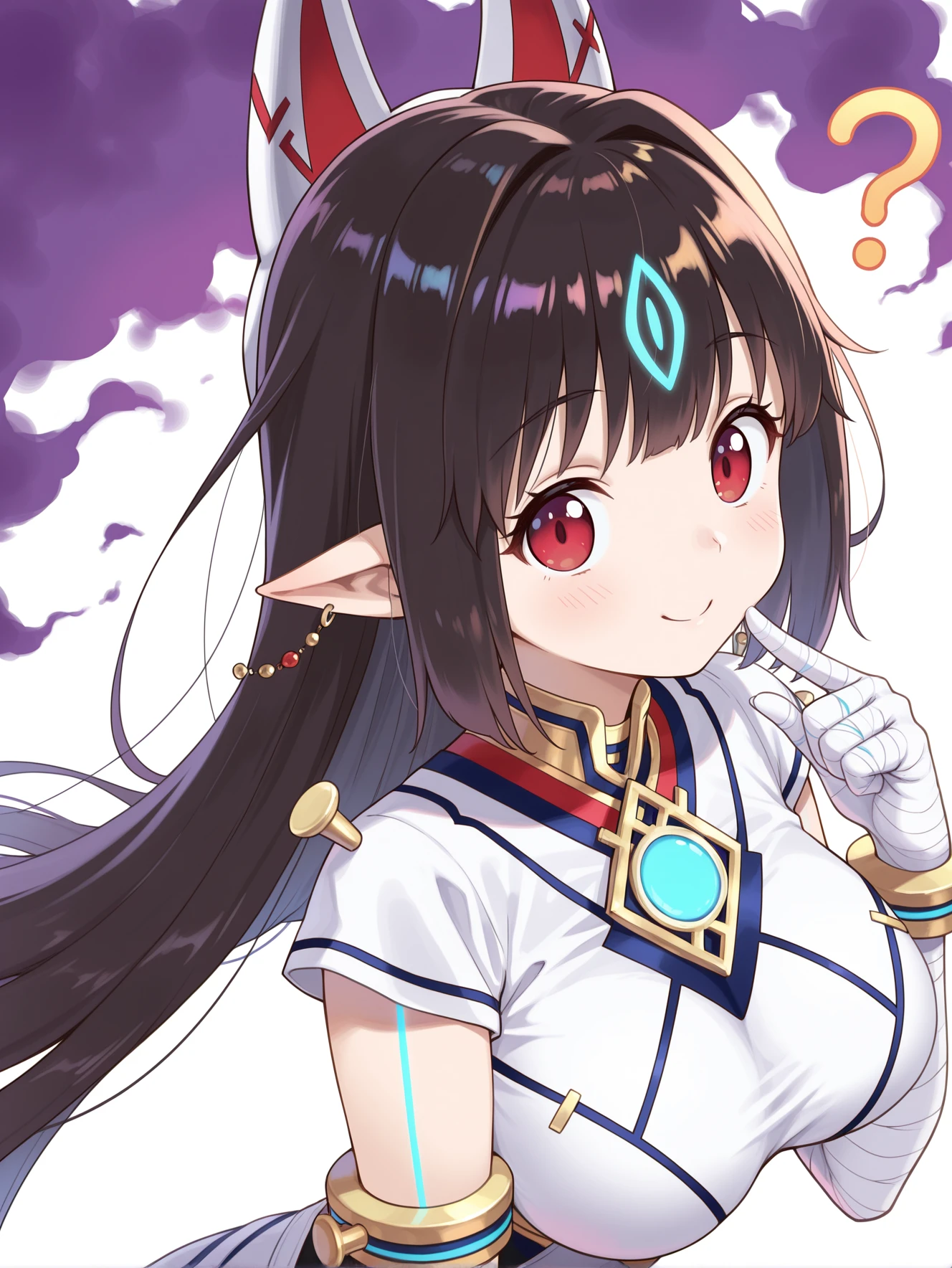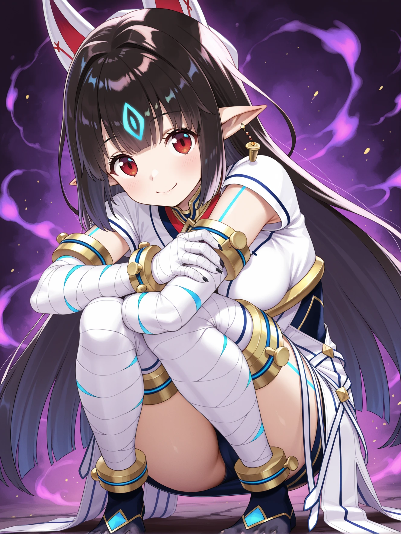 Tags (clothes): fox mask on head back, white japanese dress, white bandaged gloves, ball earrings, blue chest jewel, white bandaged legwear,