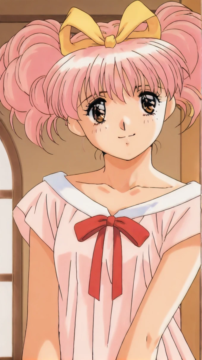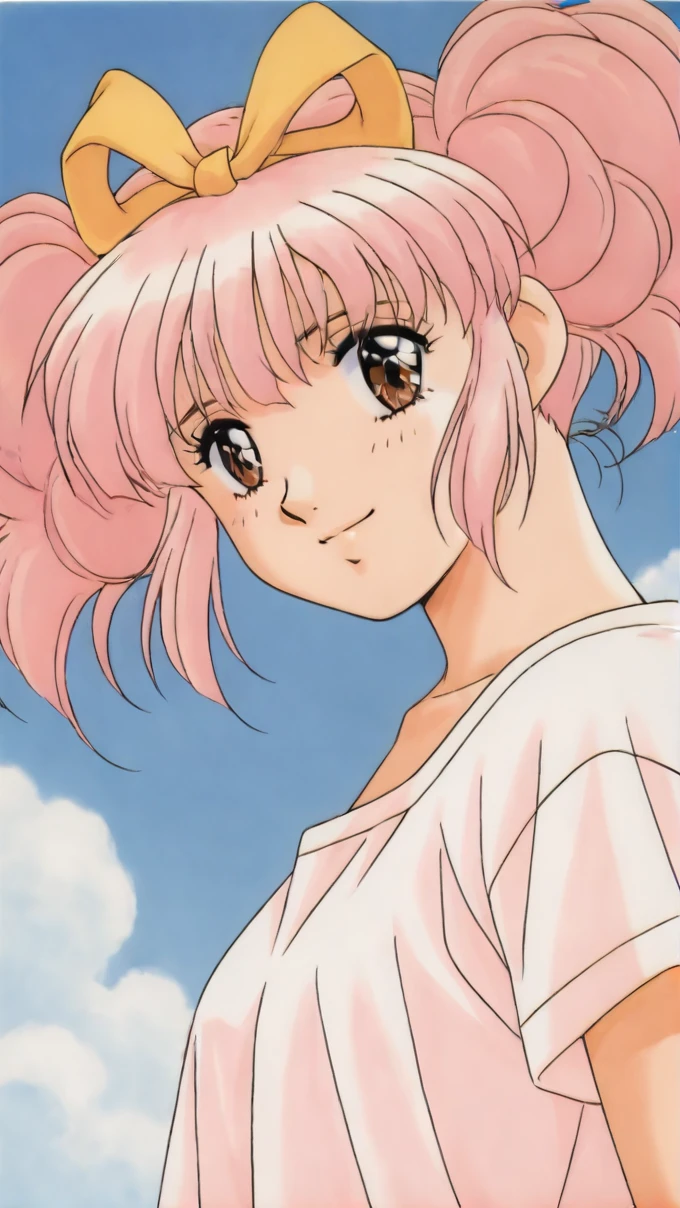 anime screencap,anime coloring,anime screencap,anime coloring<lora:suzuki miho - doukyuusei v1:0.8>1girl, solo, looking at viewer, smile, bangs, ribbon, twintails, brown eyes, hair ribbon, pink hair, retro artstyle, 1990s \(style\),suzuki miho