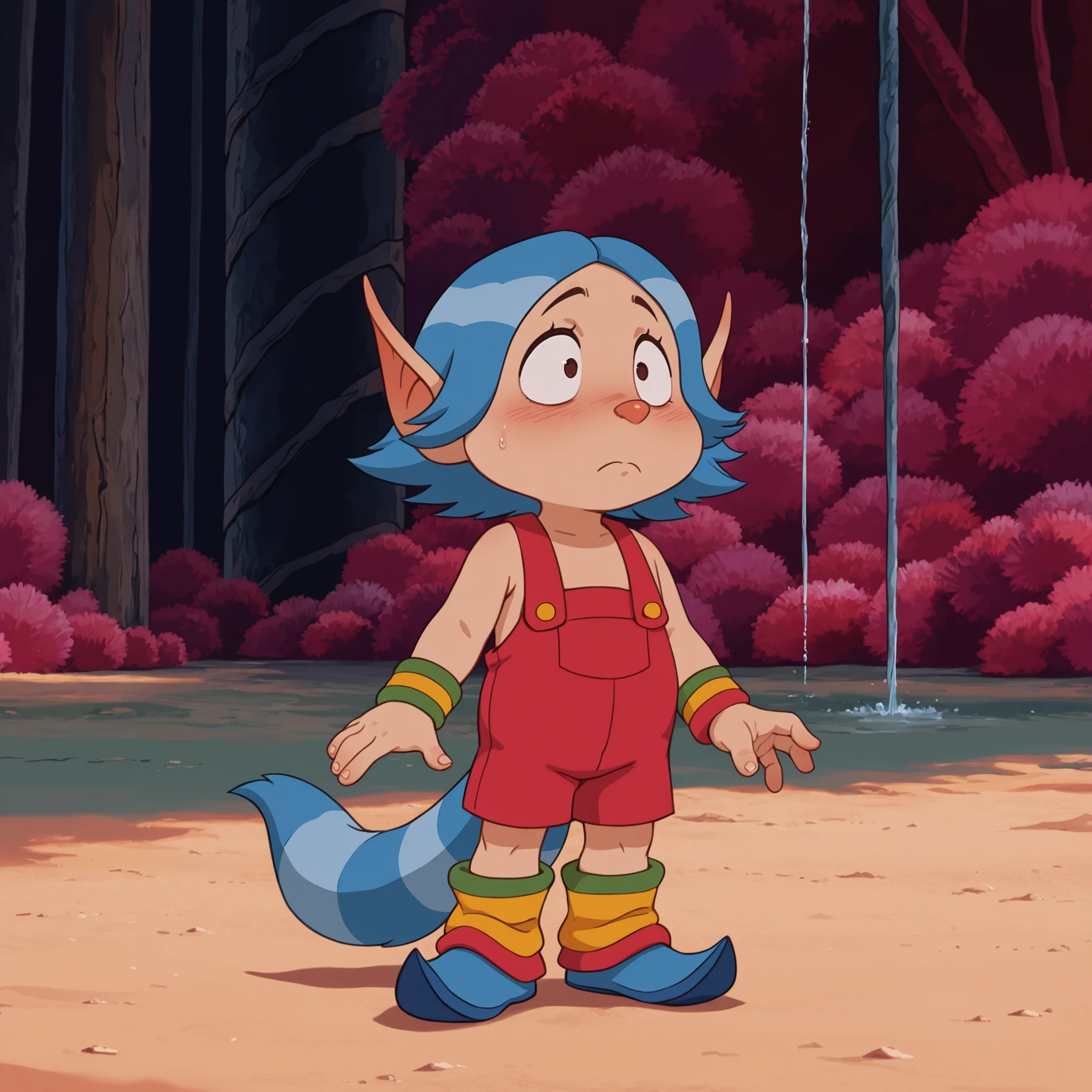 Helpful tags: blue hair, bracelet, red overalls, animal nose, tail, pointed ears, footwear