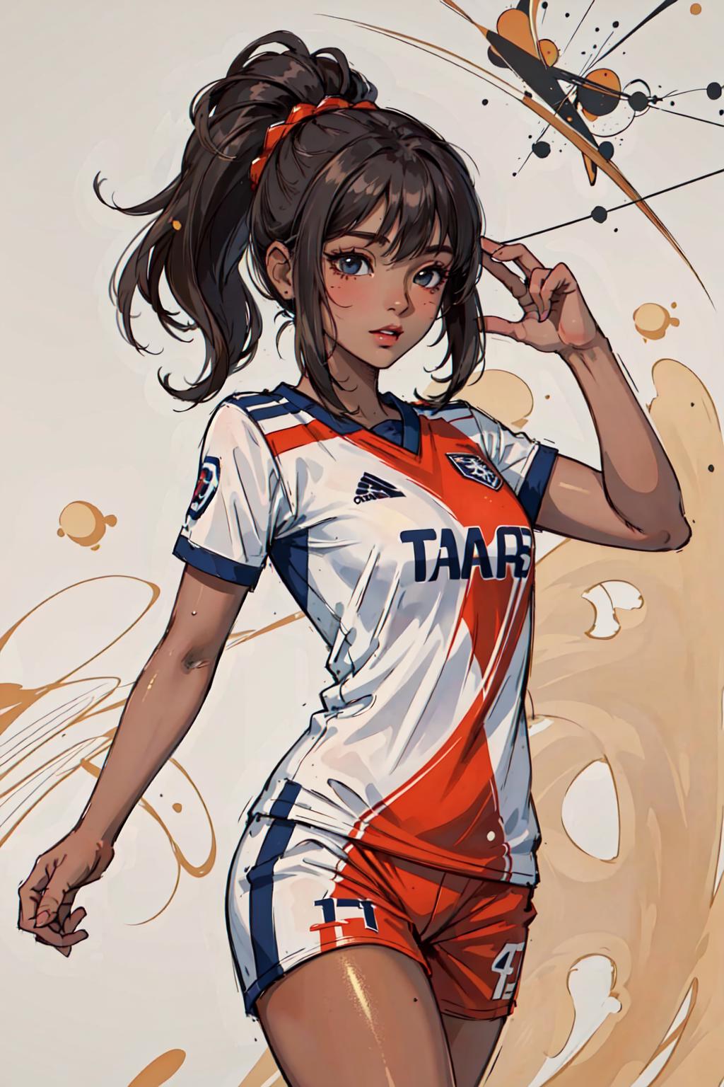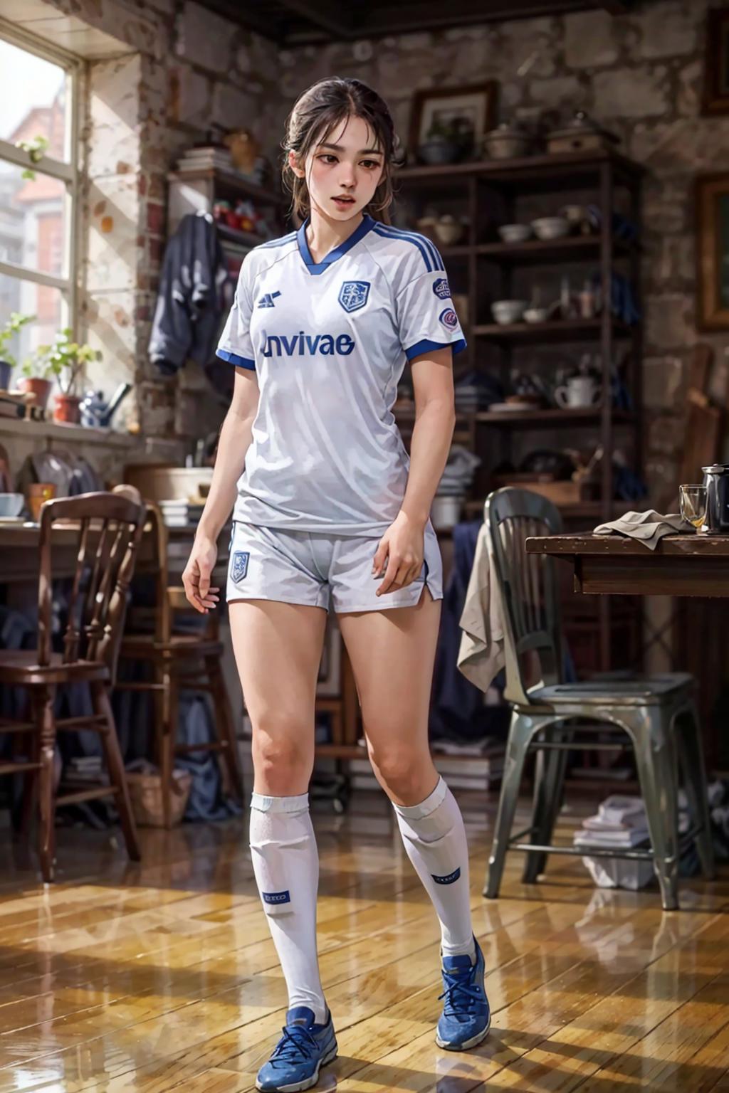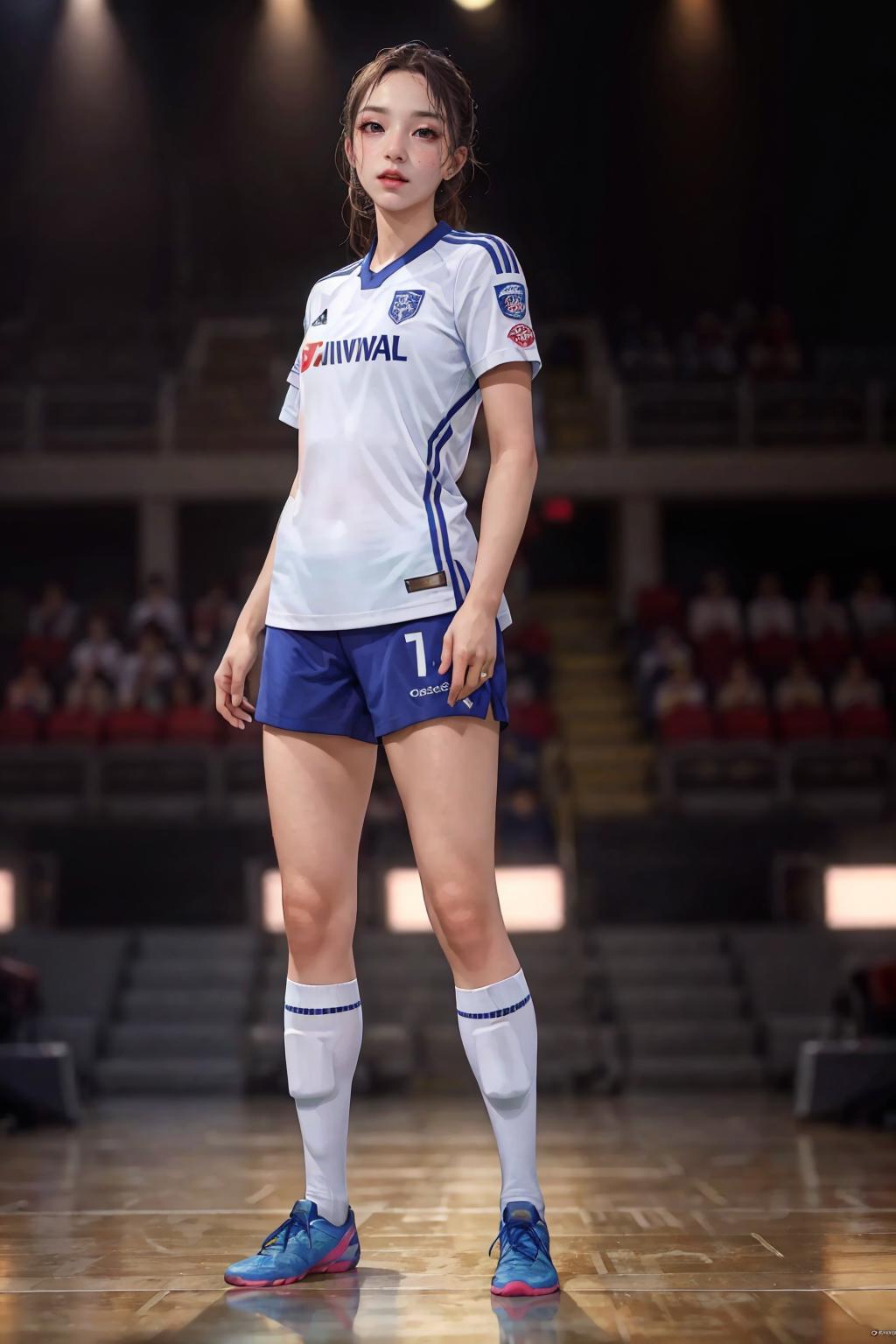 Keys: wearing soccer_uniform, back view, inside soccer_field, kicking the ball