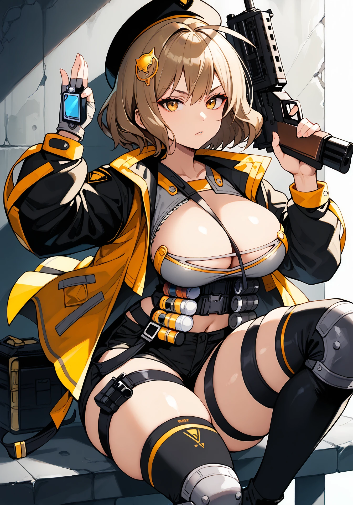 optional:beret→/(remove),knee pads,gun,strap between breasts