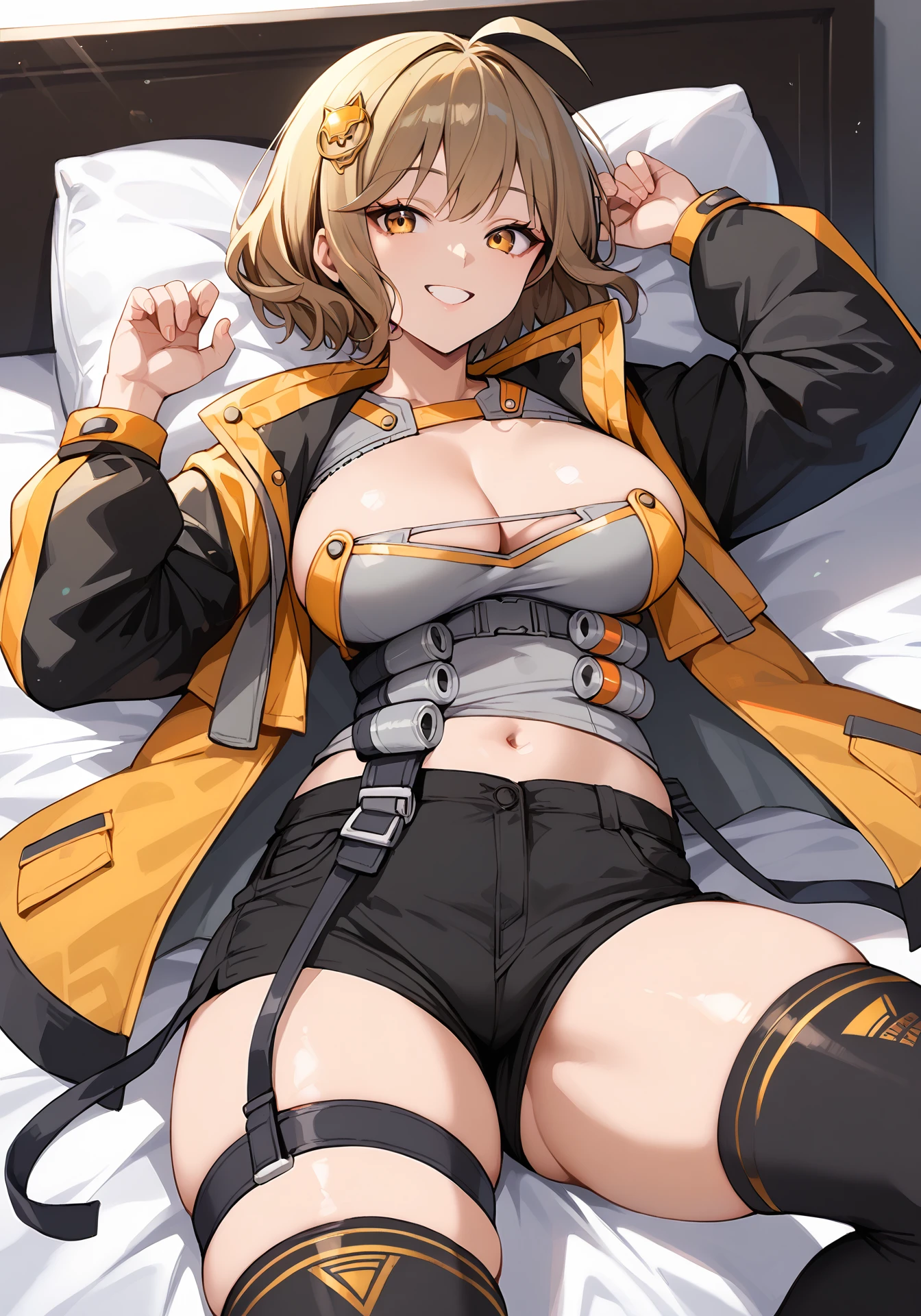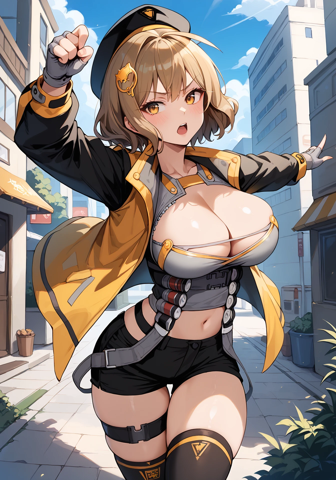 An1sDefault,black jacket,open jacket,grey tube top,grey collar,black shorts,beret,black thighhighs, thigh strap,single fingerless gloves,black high heel boots,ornament under breasts