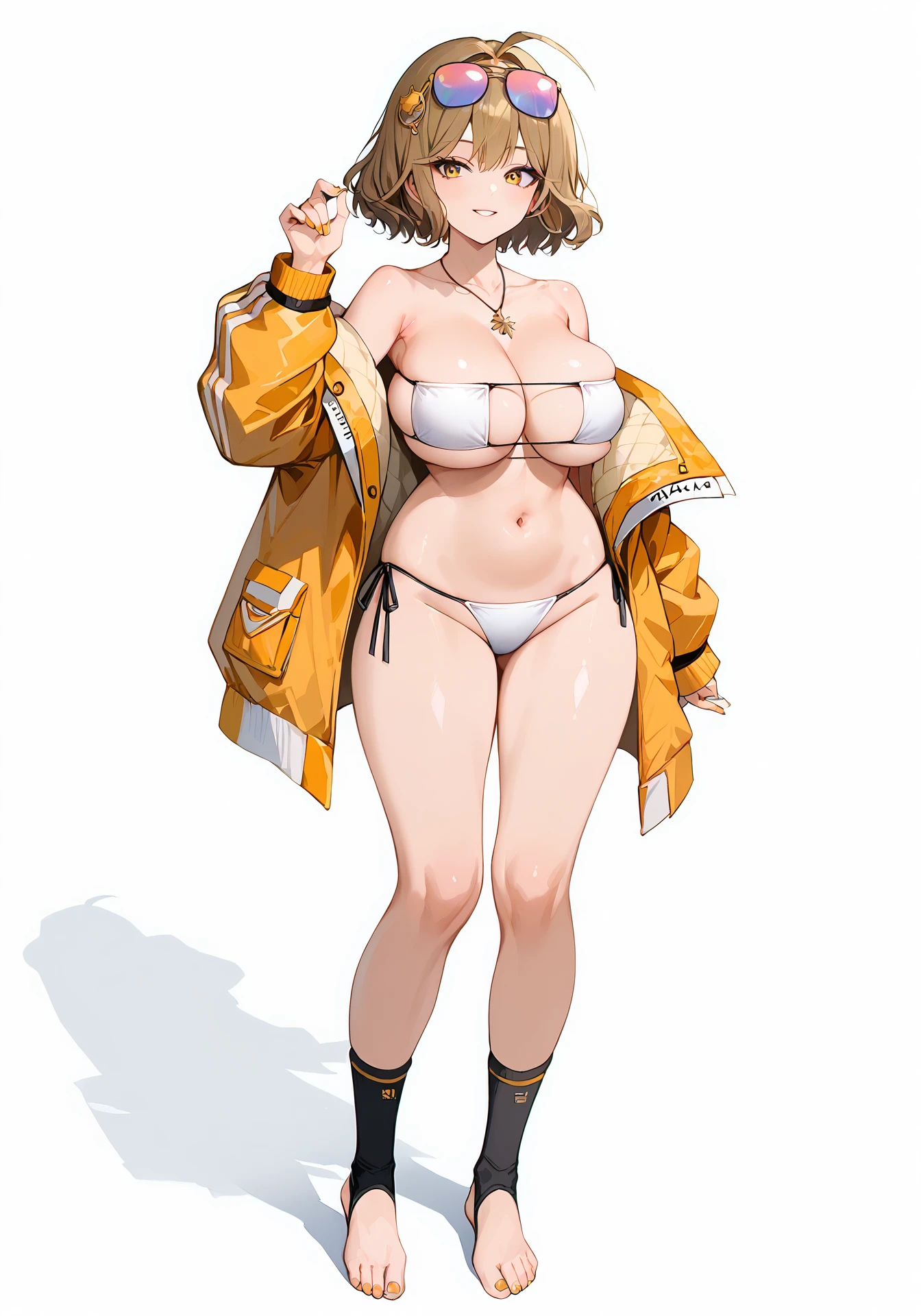 An1sSummer,white eye patch bikini,orange jacket,open jacket,off shoulder,white side-tie bikini bottom,eyewear on head,black toeless socks, pendant,nail polish,yellow toenail oil,