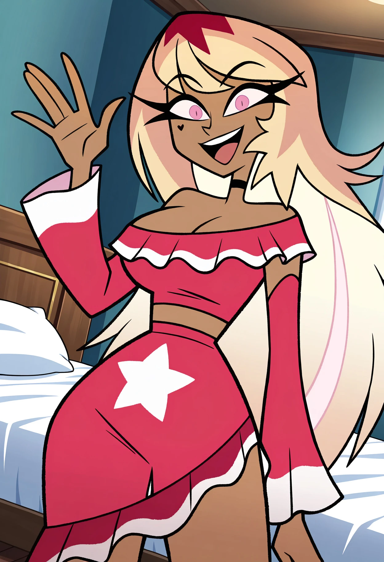 humanverosikaHB, long hair, blonde hair, pink eyes, dark-skinned female, dark skin, bare shoulders, off shoulder, dress, red dress, detached sleeves, frills, multicolored hair, bangs, crop top, strapless, large breasts