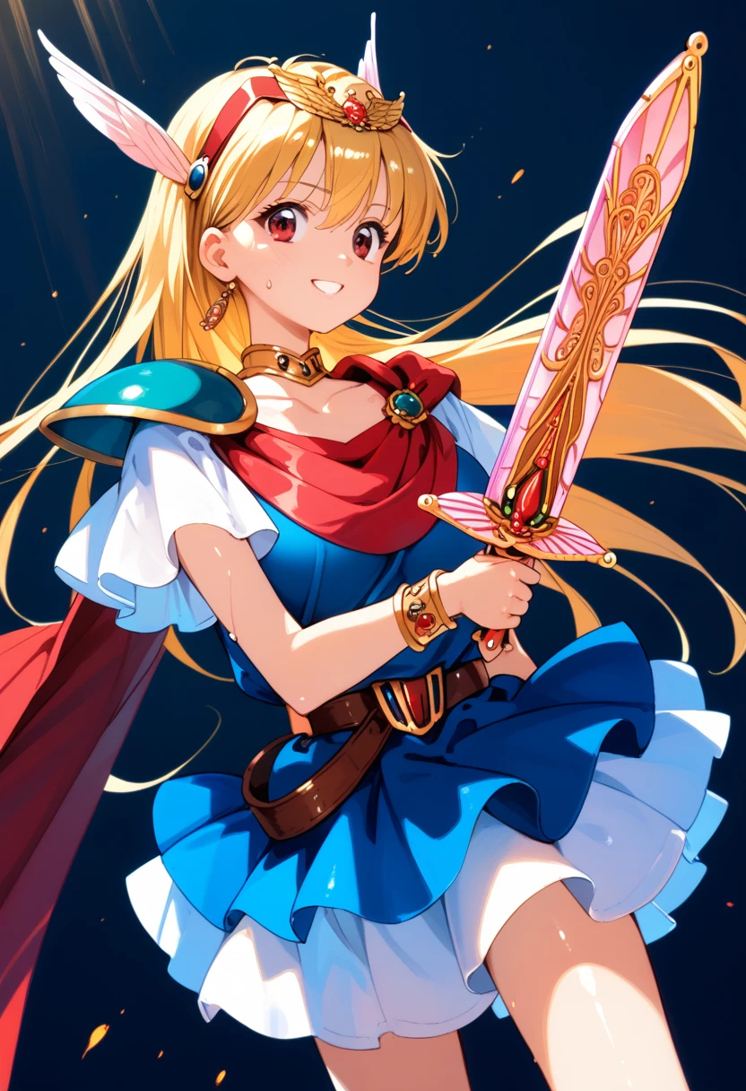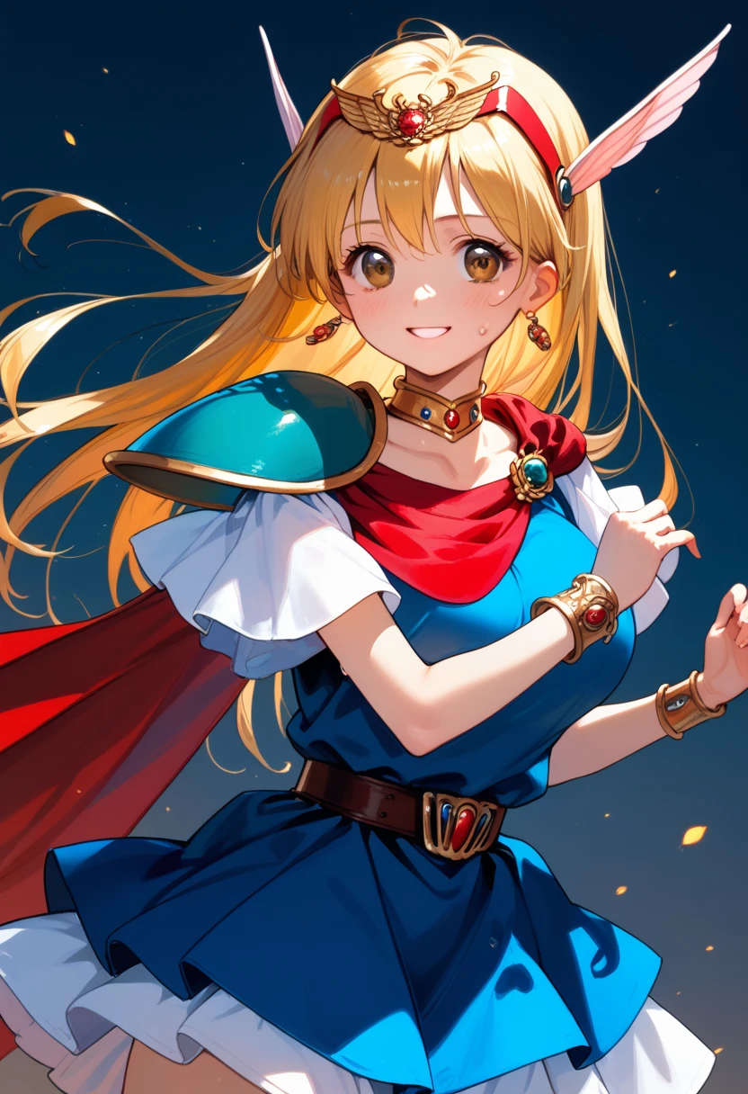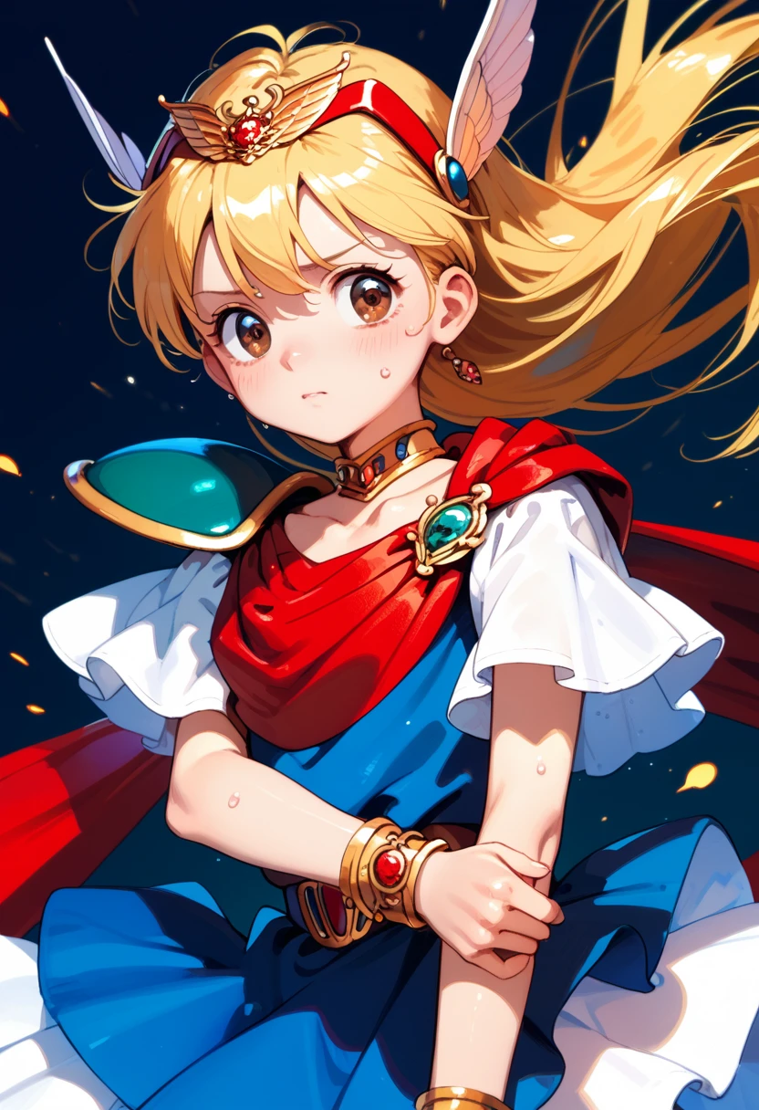 <lora:chacha magical princess:1>, chacha magical princess, blonde hair, jewelry, dress, bracelet, cape, brown eyes, red eyes, tiara, skirt, choker, shoulder armor, hairband, armor, belt, pauldrons