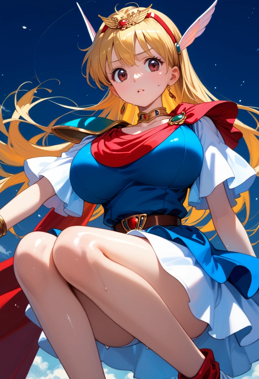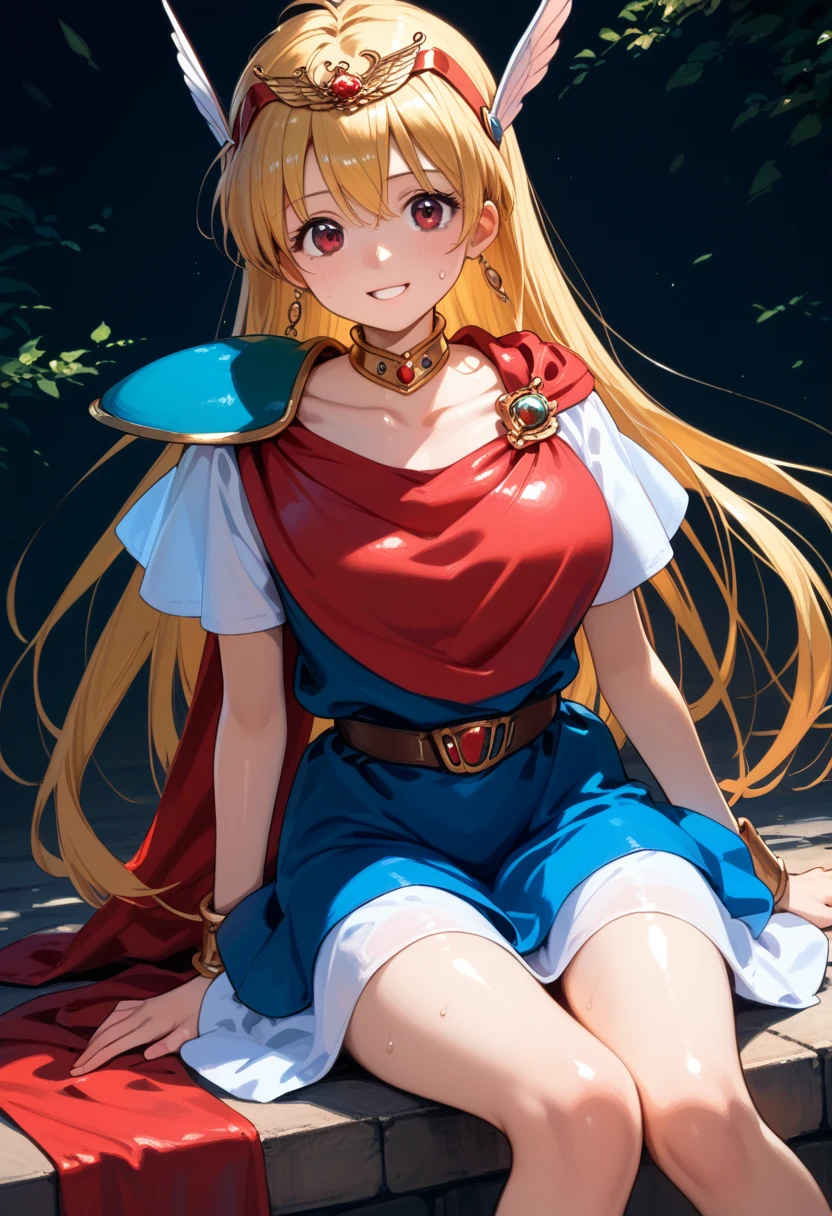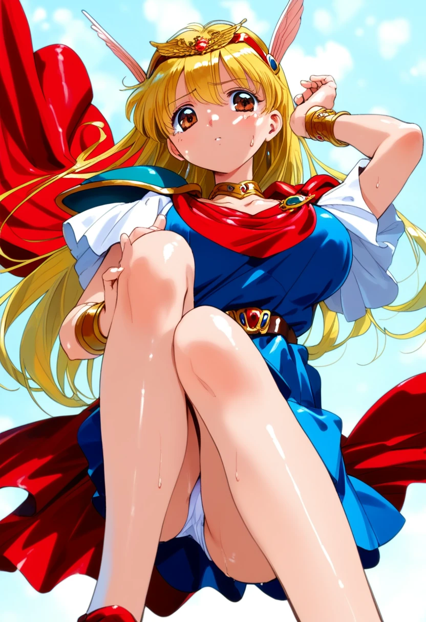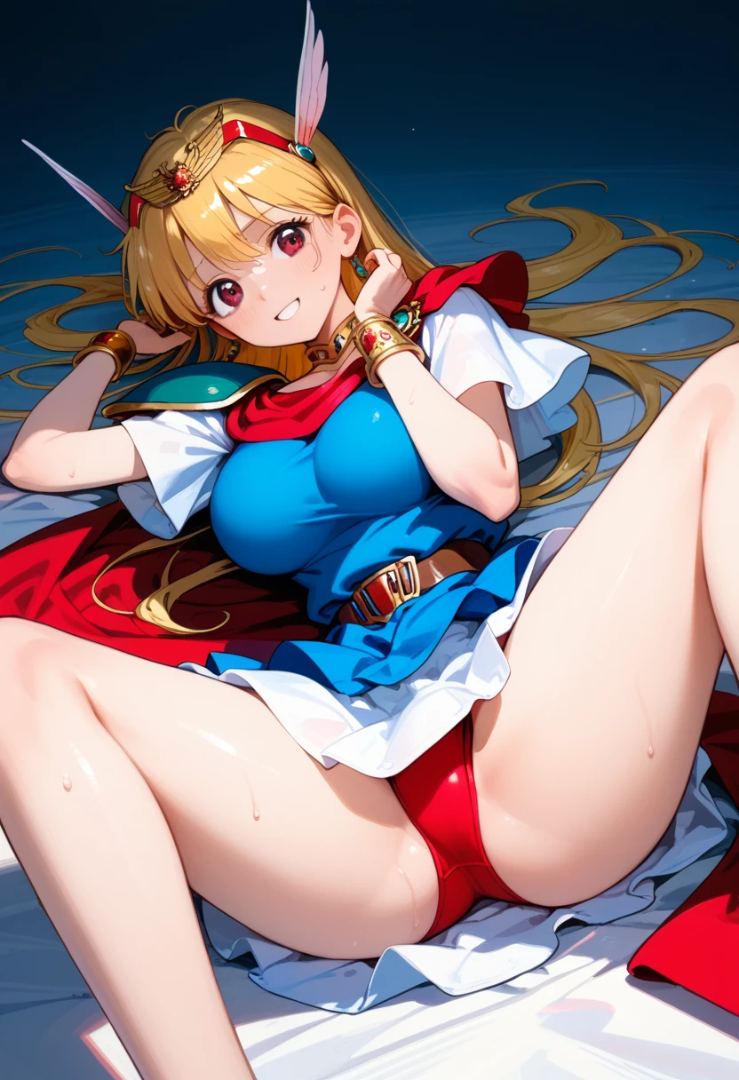 <lora:chacha magical princess:1>, chacha magical princess, blonde hair, jewelry, dress, bracelet, cape, brown eyes, red eyes, tiara, skirt, choker, shoulder armor, hairband, armor, belt, pauldrons